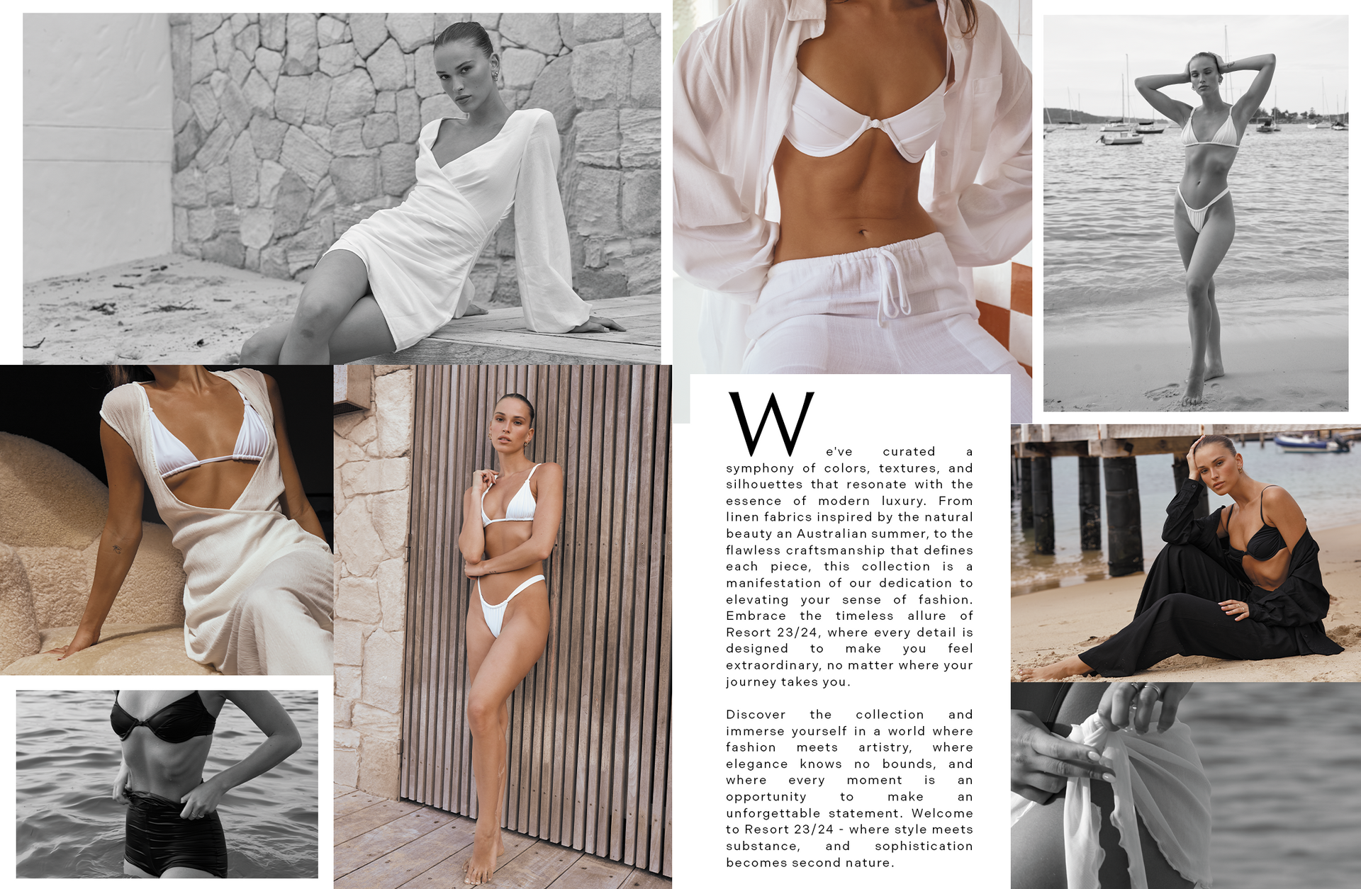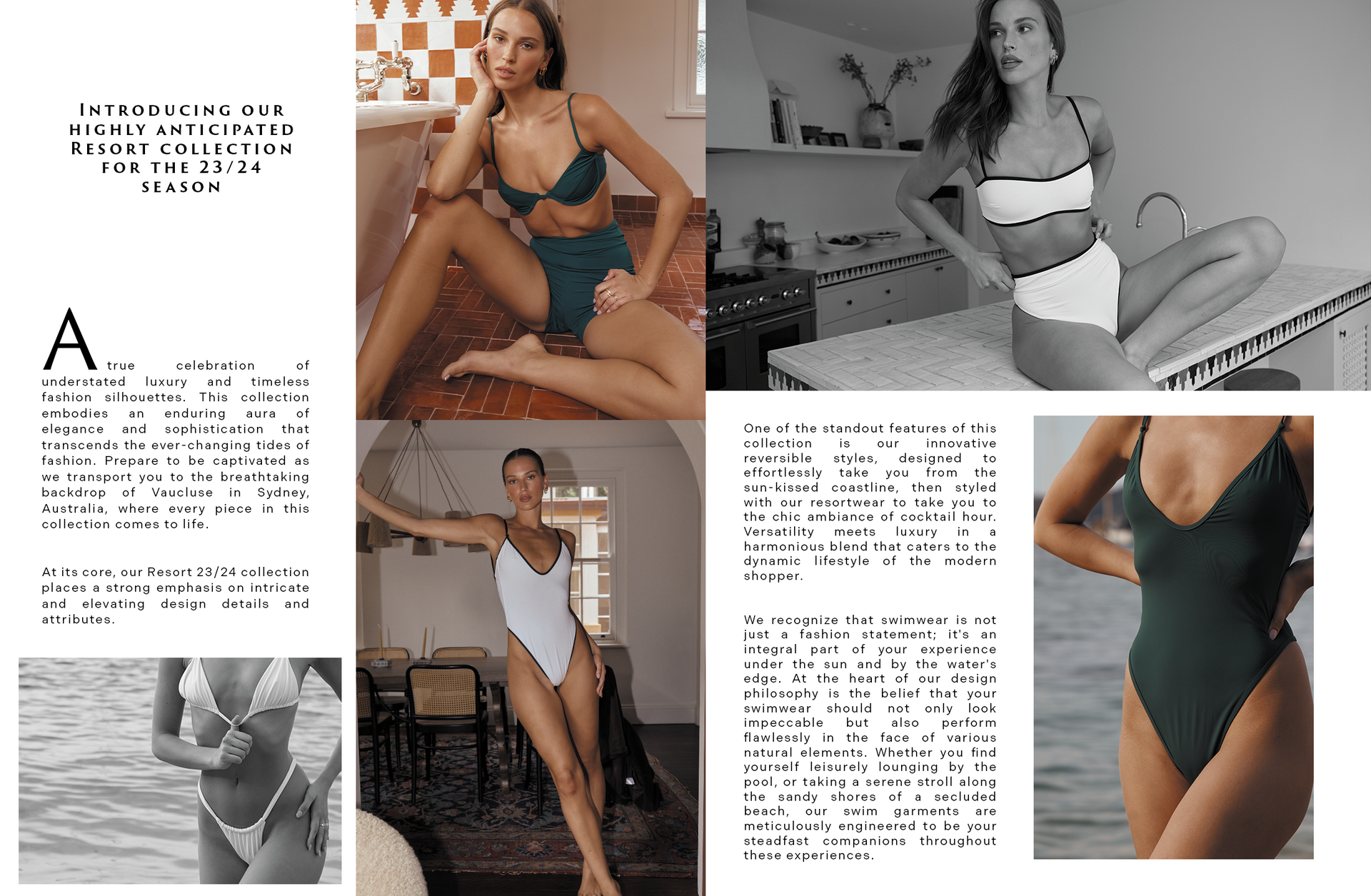 Introducing our much anticipated Resort collection for 23/24, a celebration of understated luxury and timeless silhouettes. Embodying an enduring aura of elegance and sophistication that transcends fashion eras. Captured against the picturesque backdrop of Vaucluse in Sydney, Australia, this collection places a strong emphasis on intricate and elevating design details and attributes, featuring reversible styles to take you from coastline to cocktails. With a steadfast commitment to precision tailoring and superior quality, our swim garments maintain their graceful allure in all natural elements. Resort 23/24 stands as a testament to effortless style and unwavering elegance.