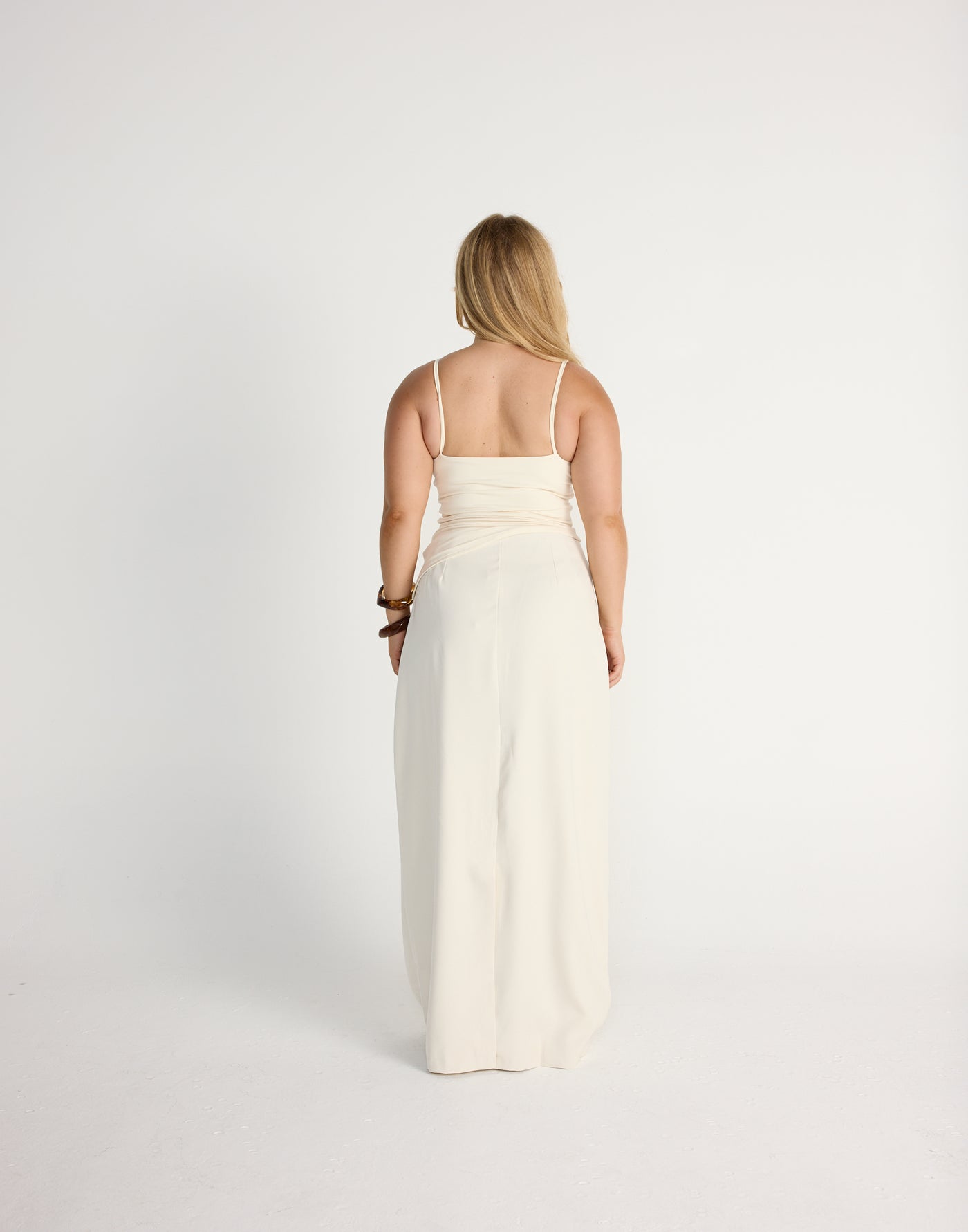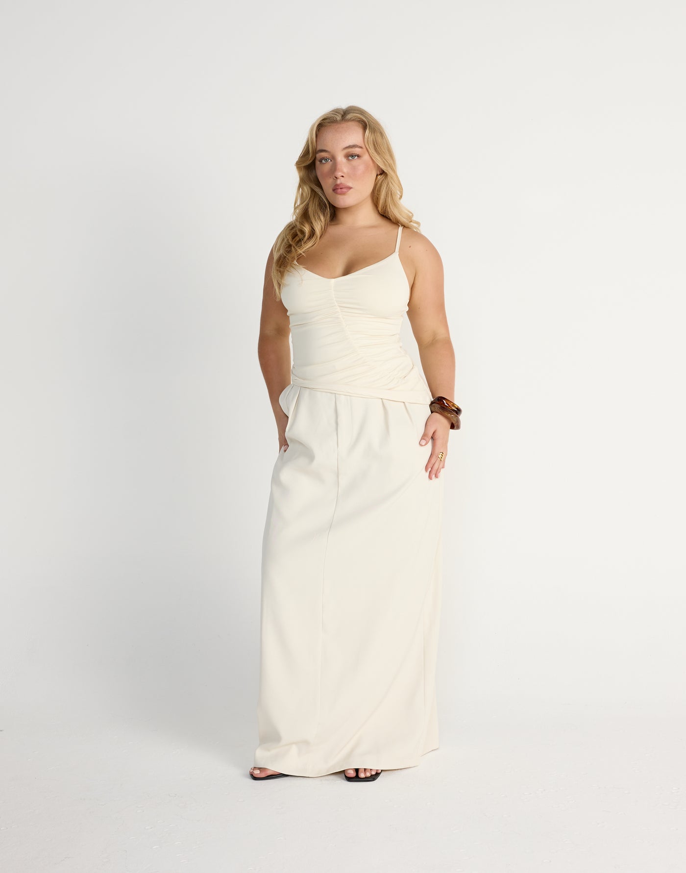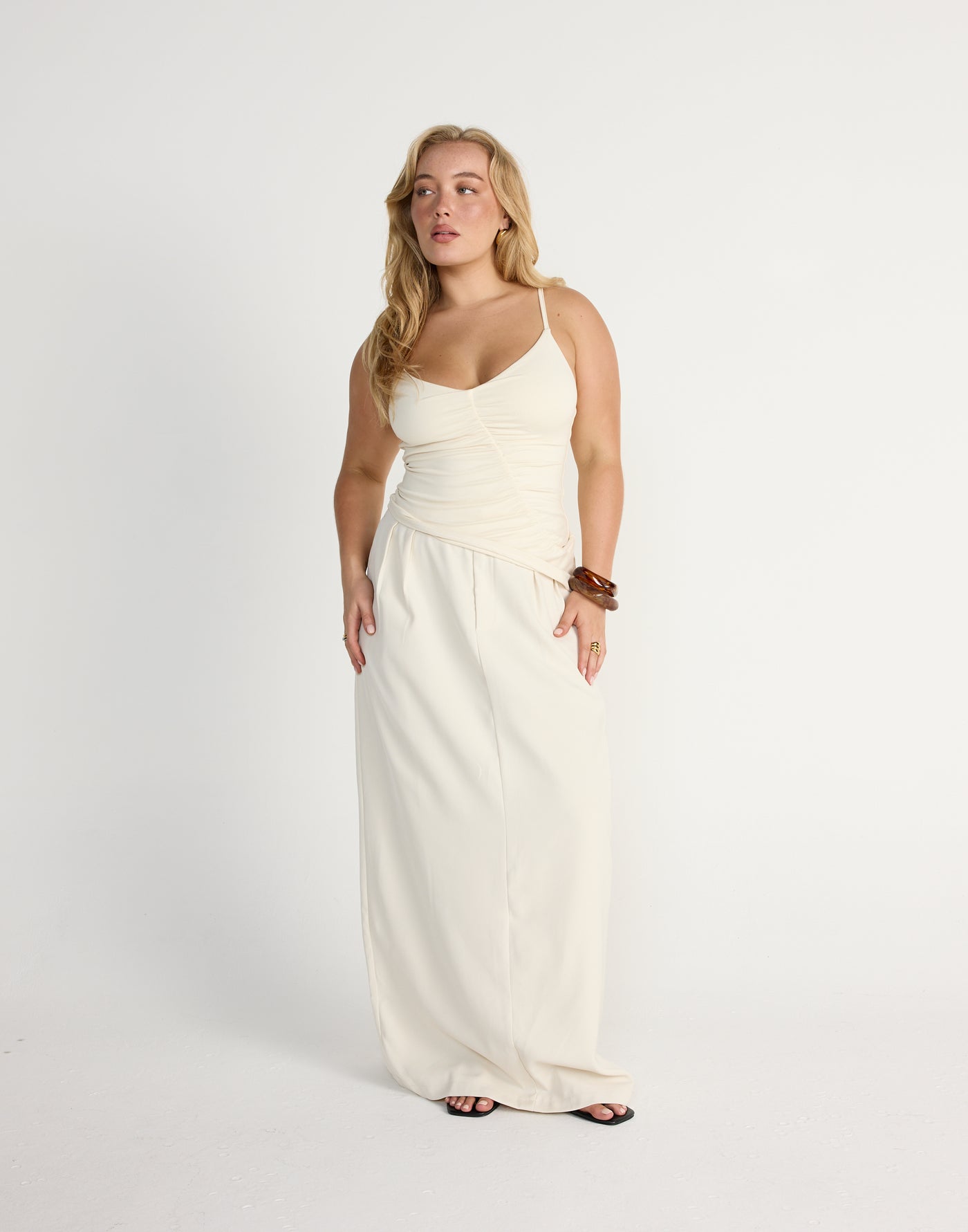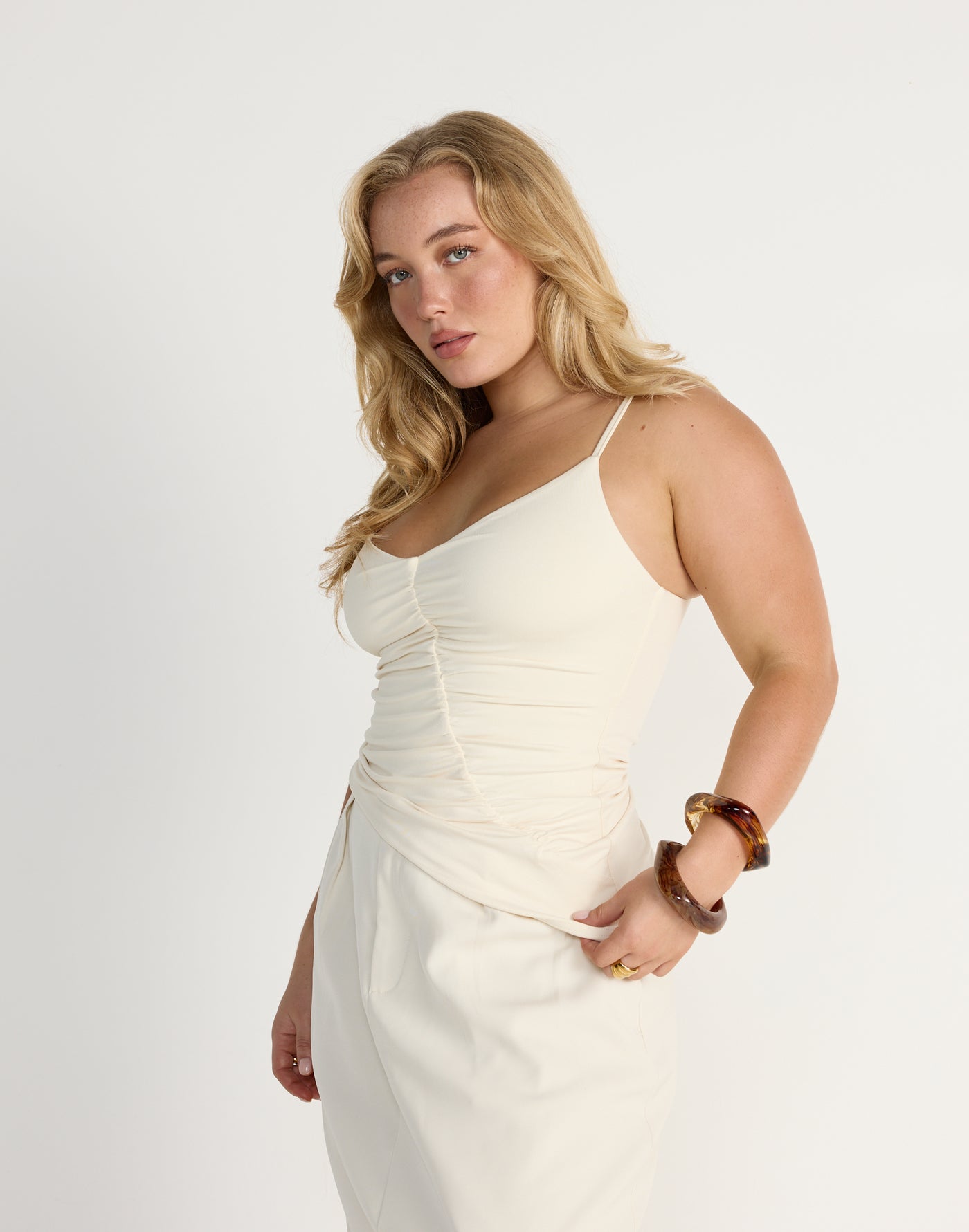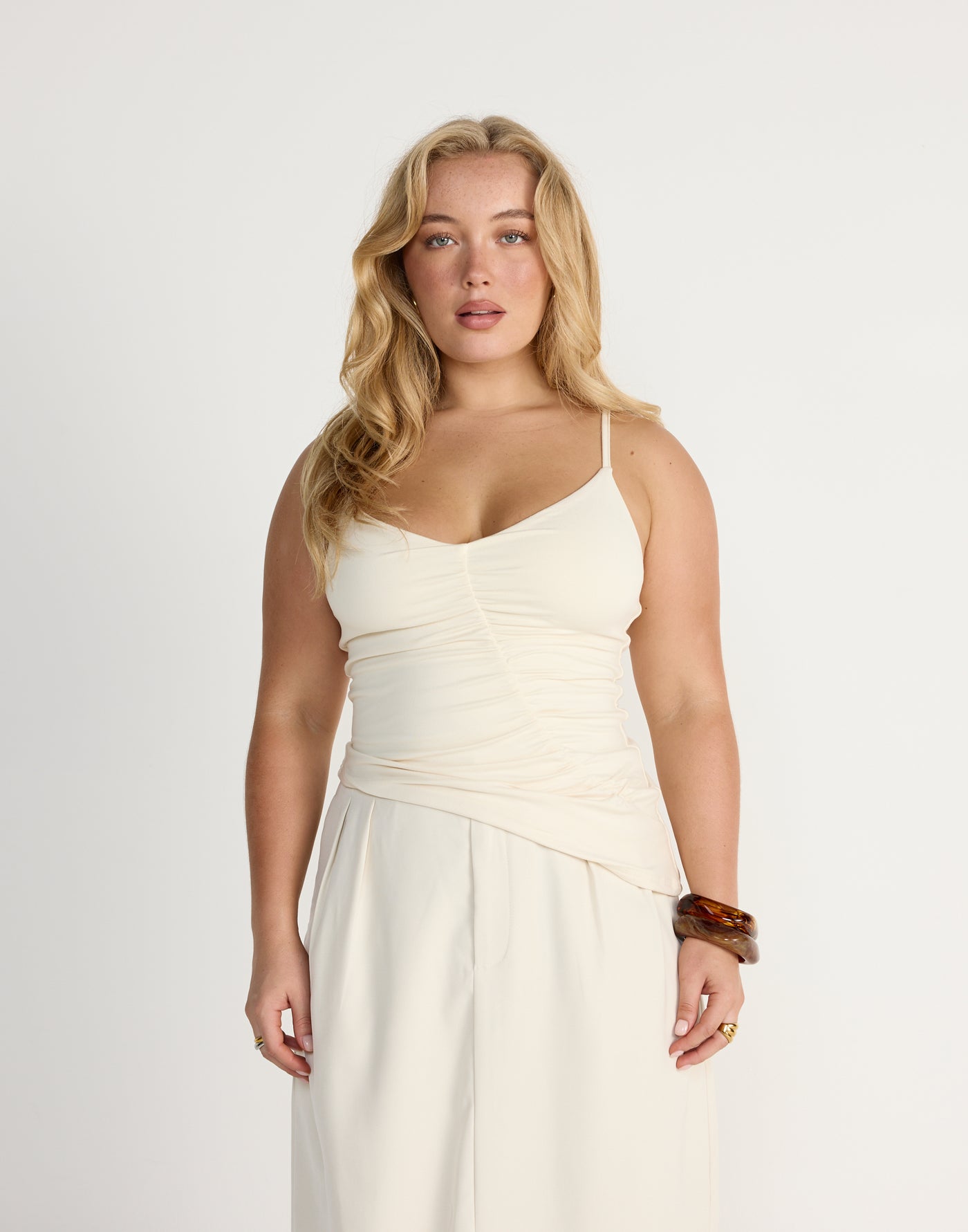 The Broken Hearts Top showcases effortless elegance with its butter jersey fabrication and bodycon silhouette. Featuring a flattering V-neckline, non-adjustable straps, and diagonal ruched detail, the design is completed with a stylish diagonal hem and full lining for a sleek, refined look.