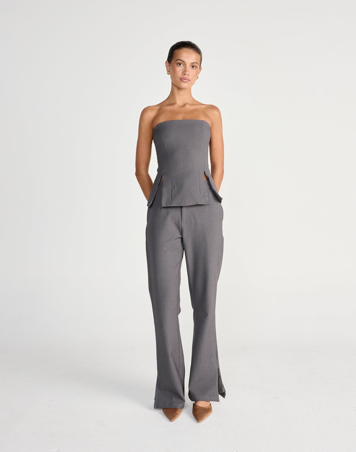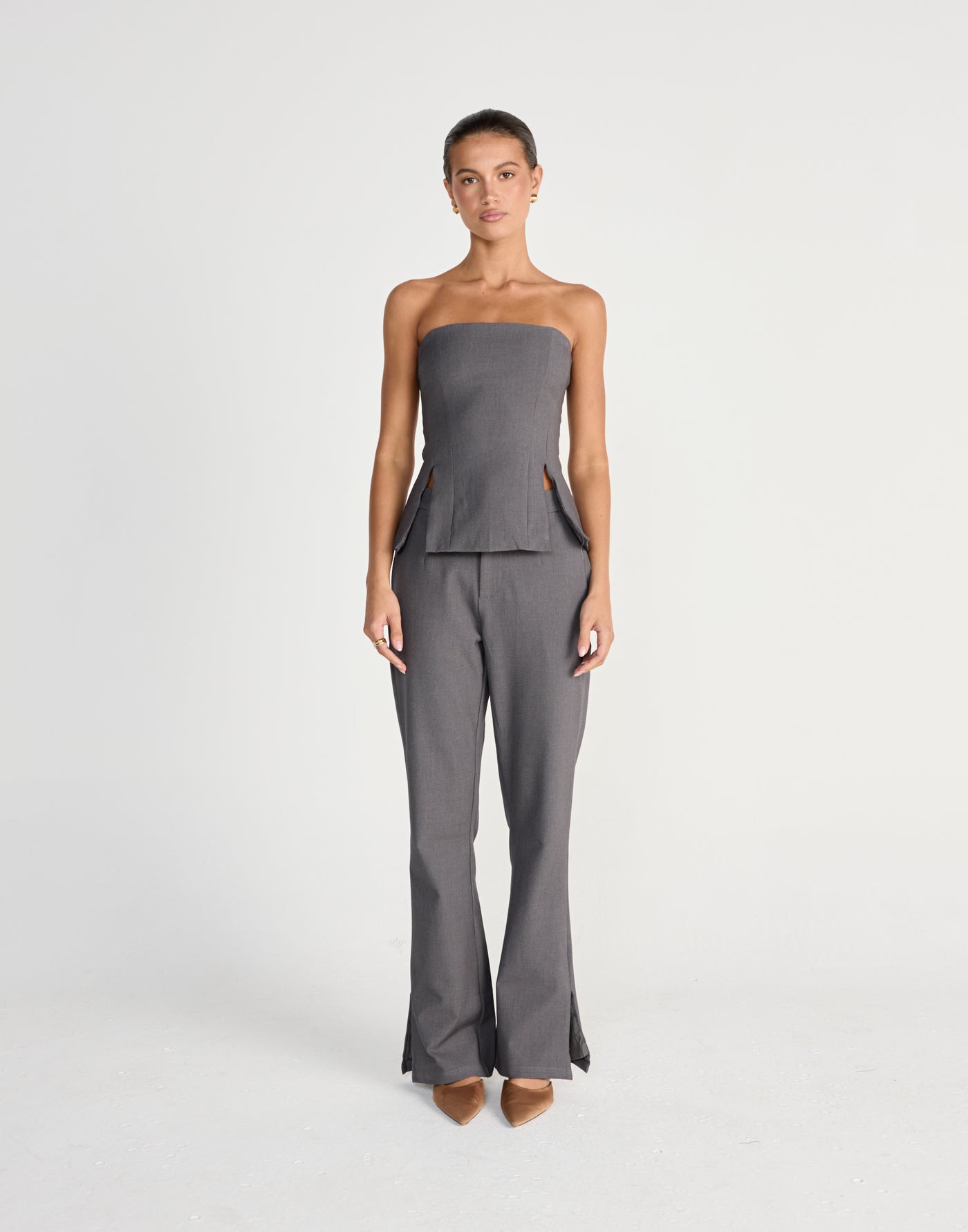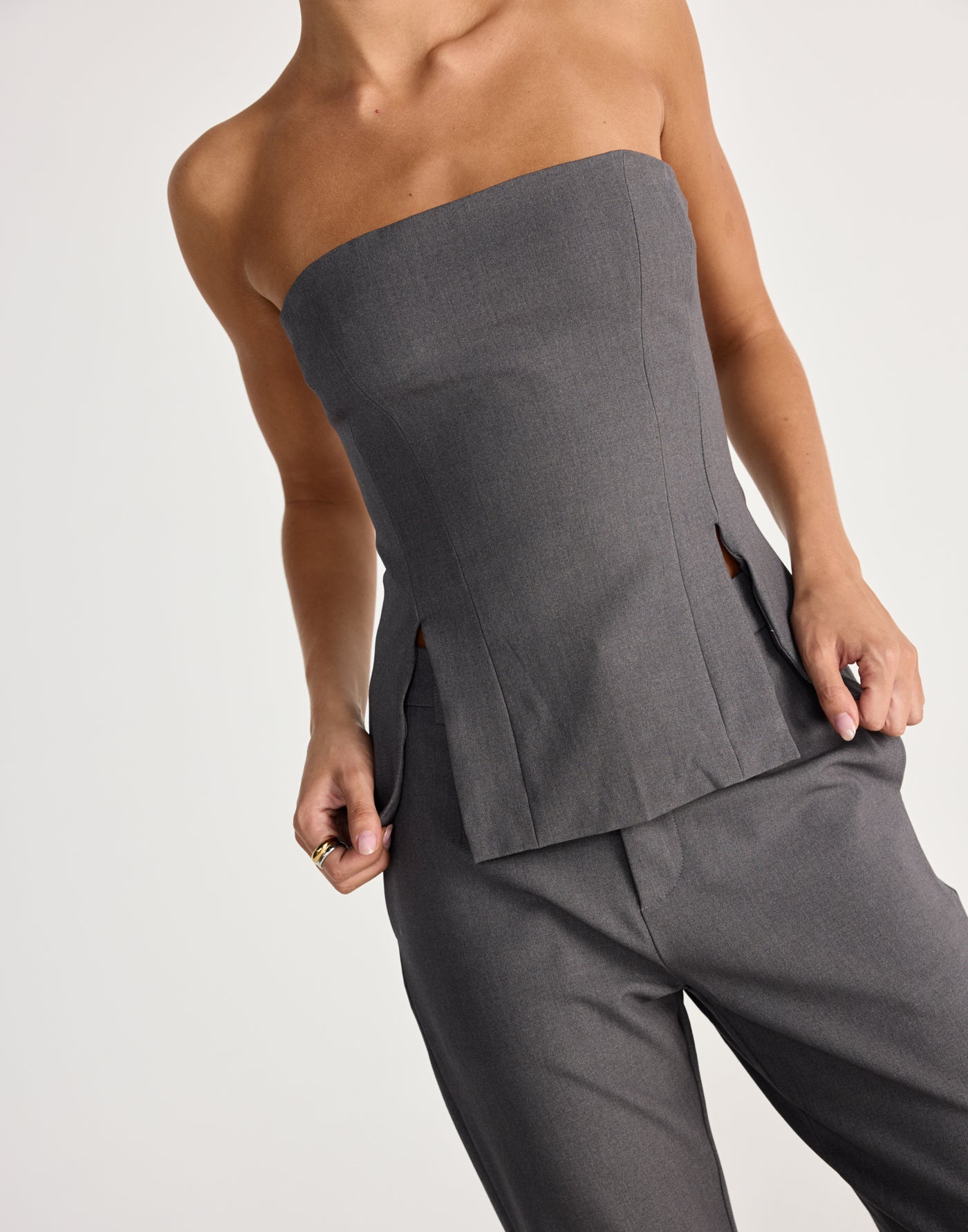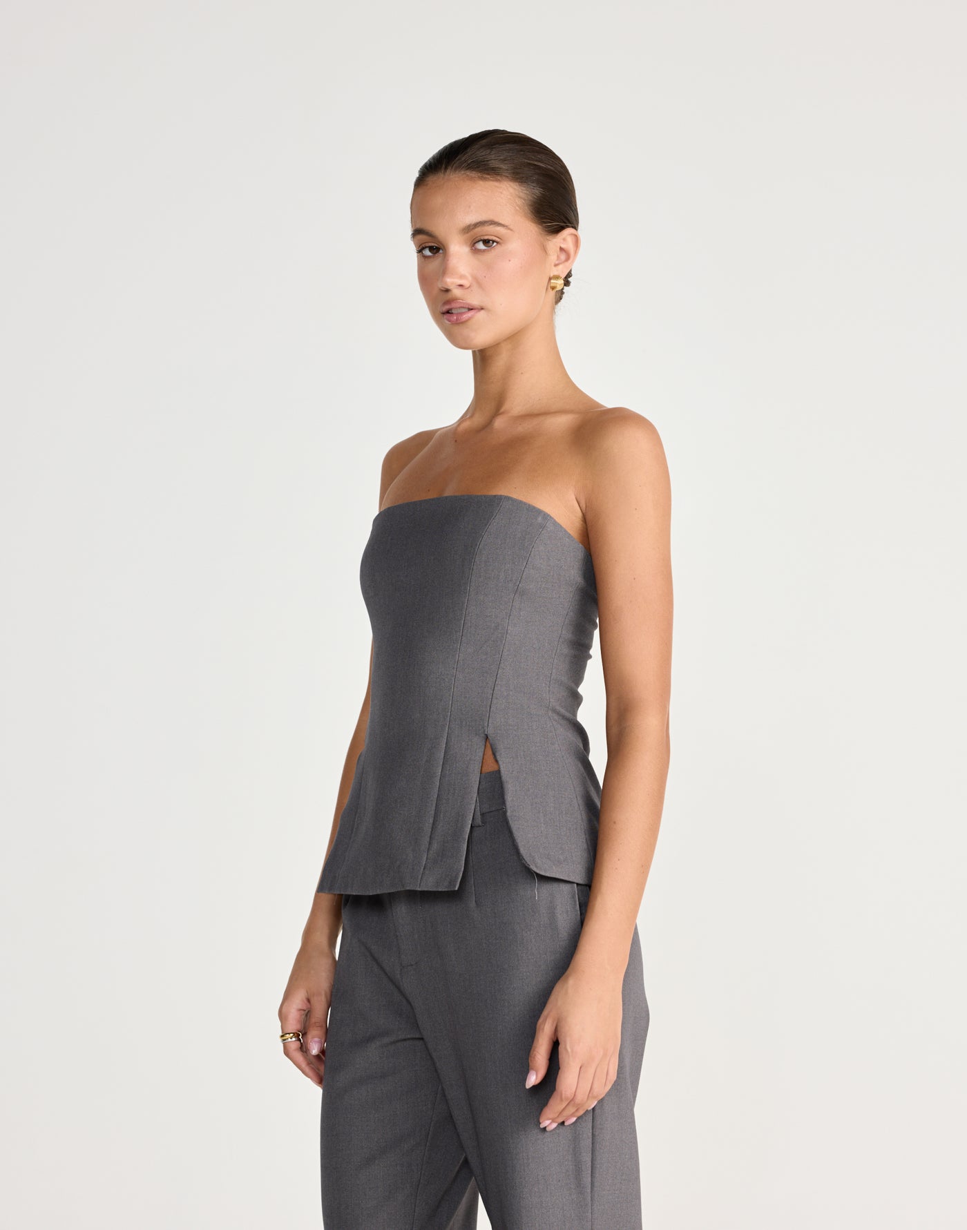 The Hollis Top is a sleek and structured piece, featuring a refined strapless design with tailored dart detailing and a centre-back zipper for a flawless fit.
