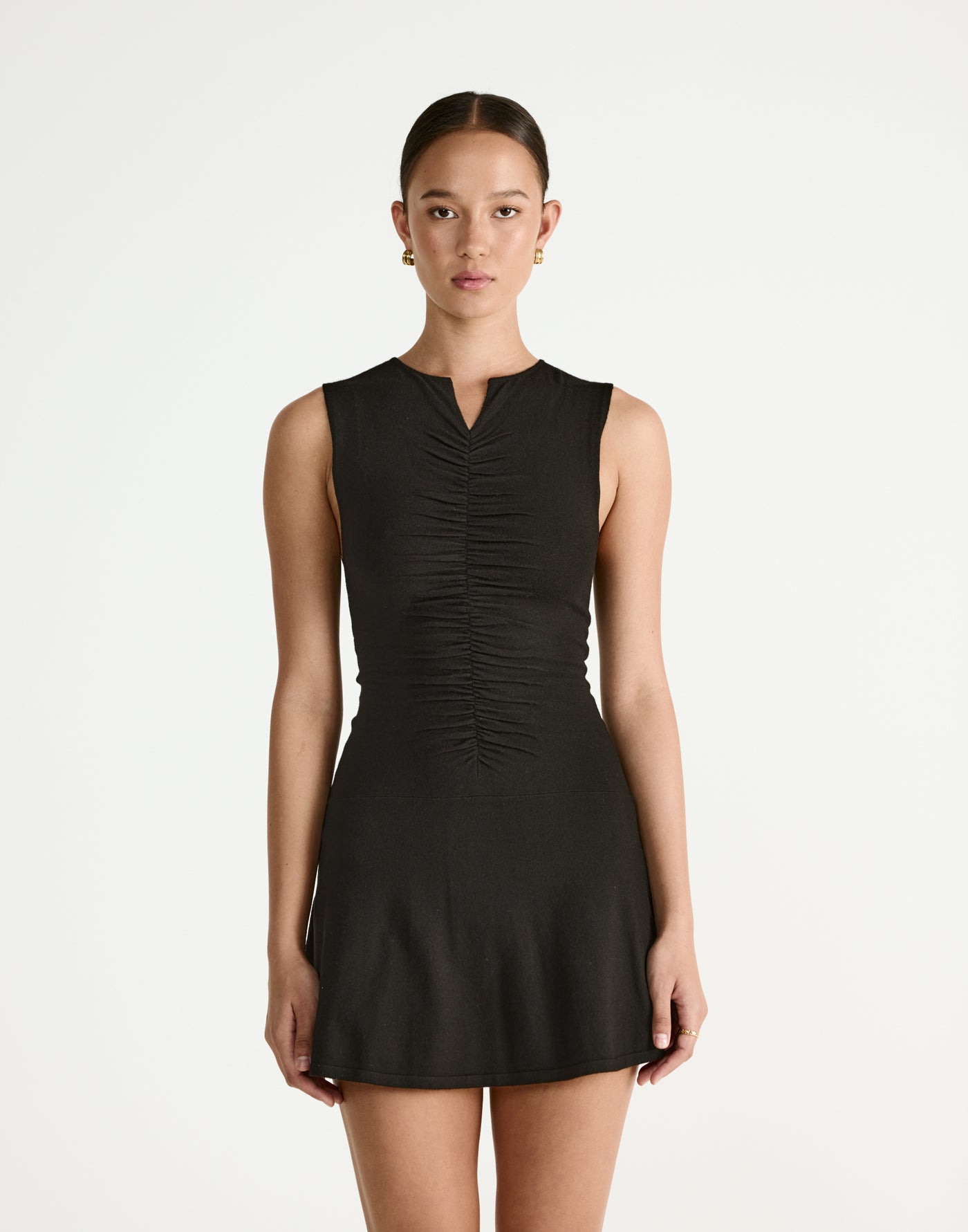 The Laney Mini Dress is a chic, mini-length silhouette with a structured yet relaxed fit.