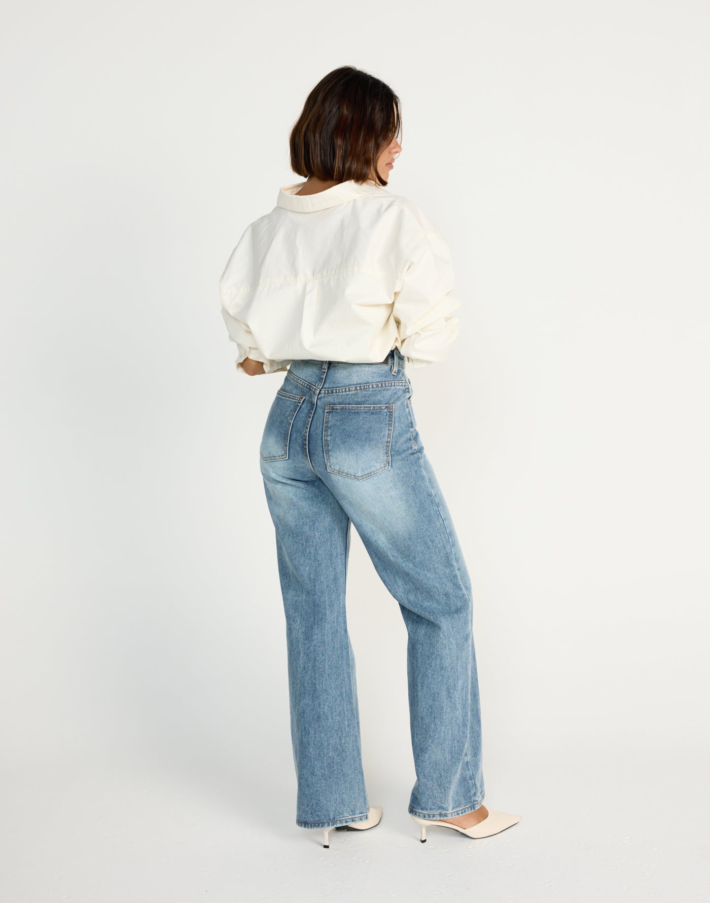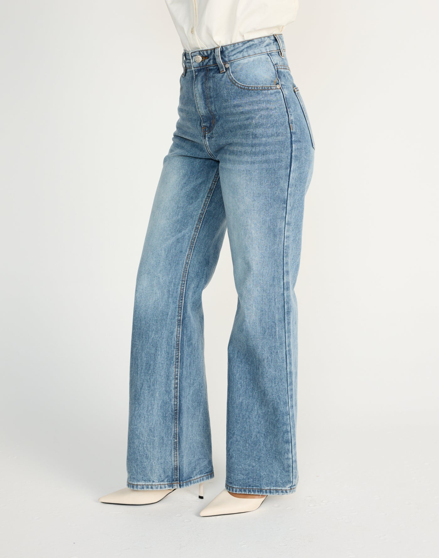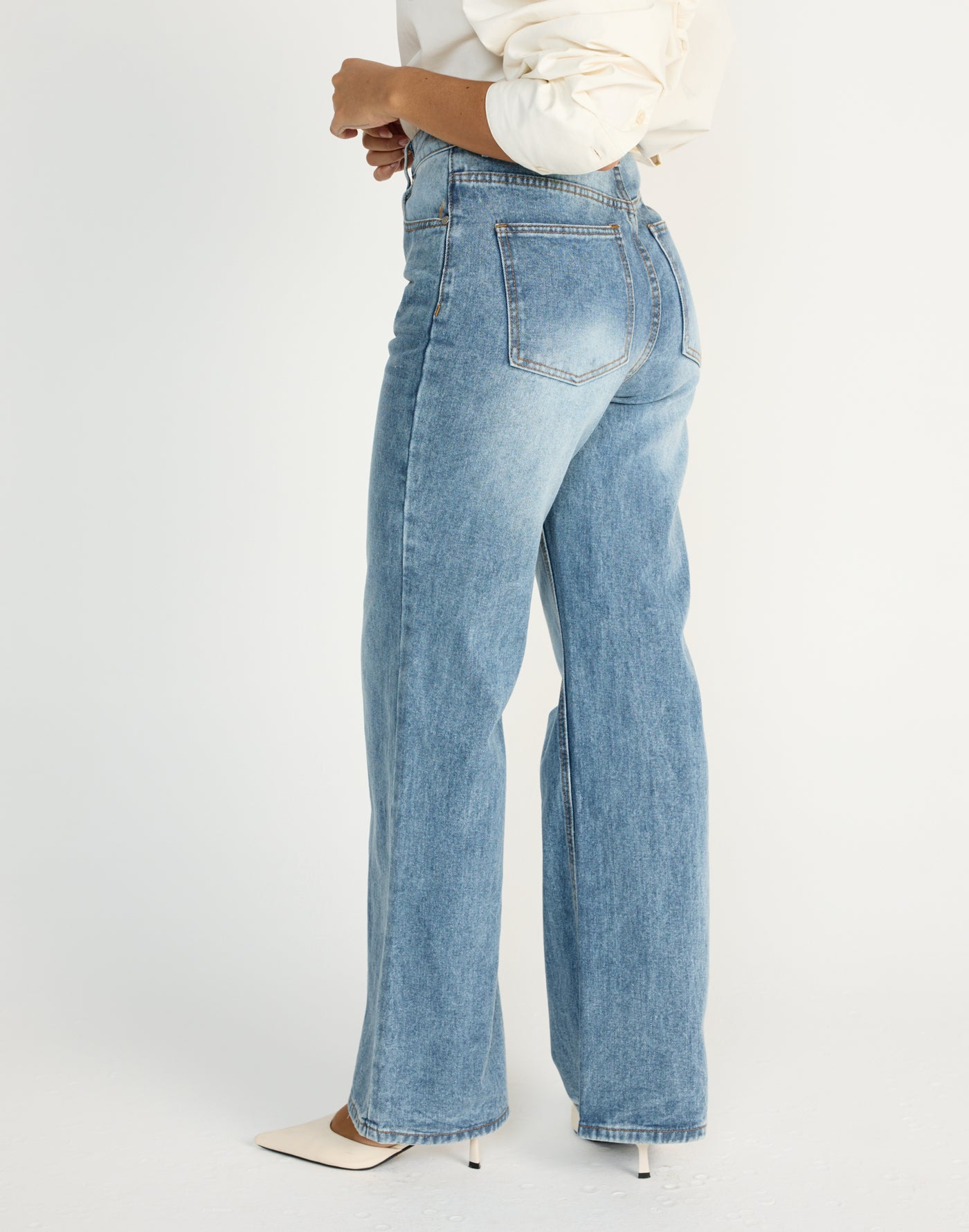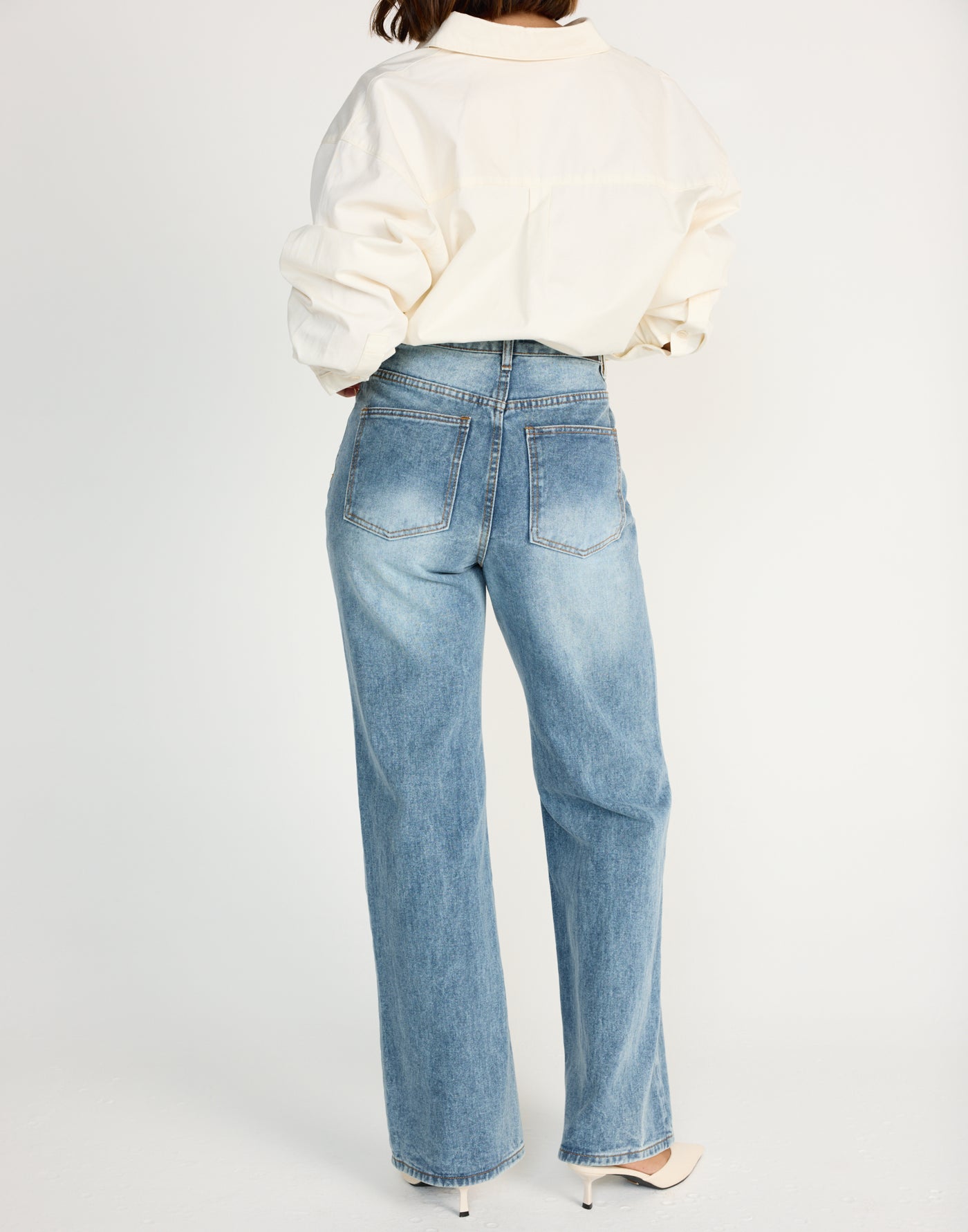 The Zach Jeans feature a high-rise fit with a slight flare, complete with functional pockets and belt loops for a timeless everyday style.