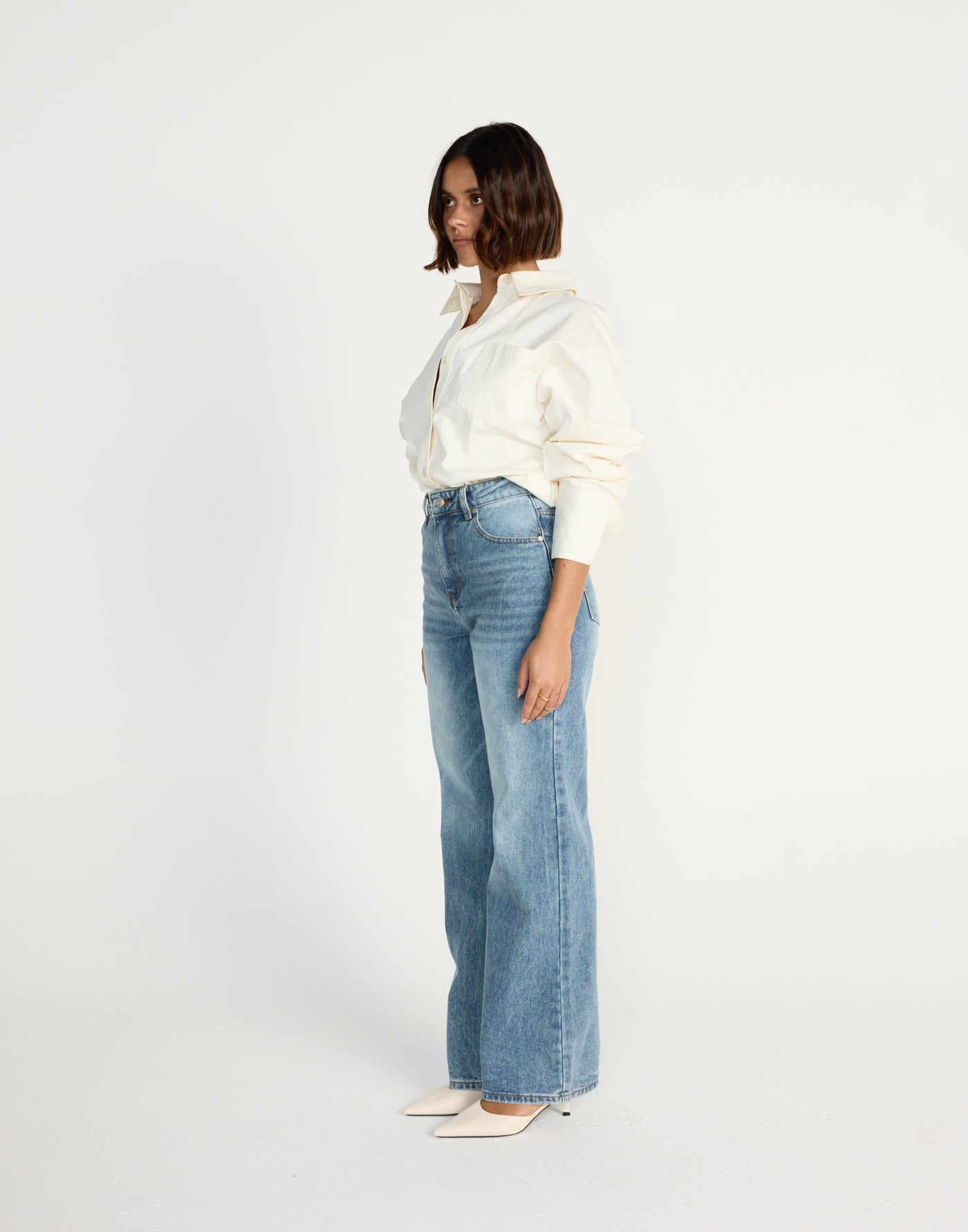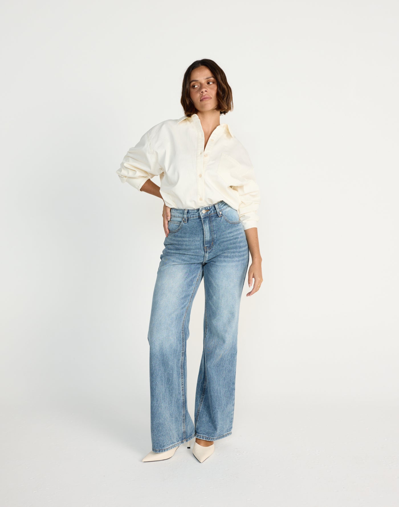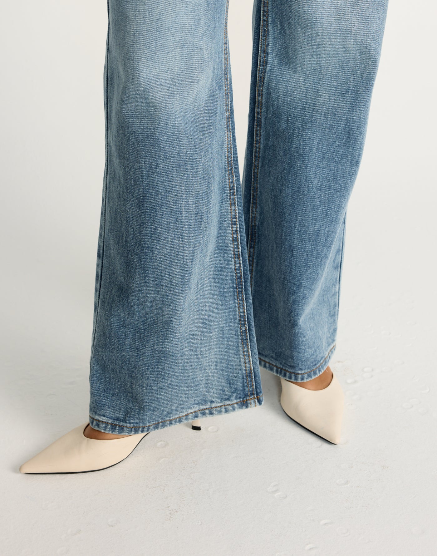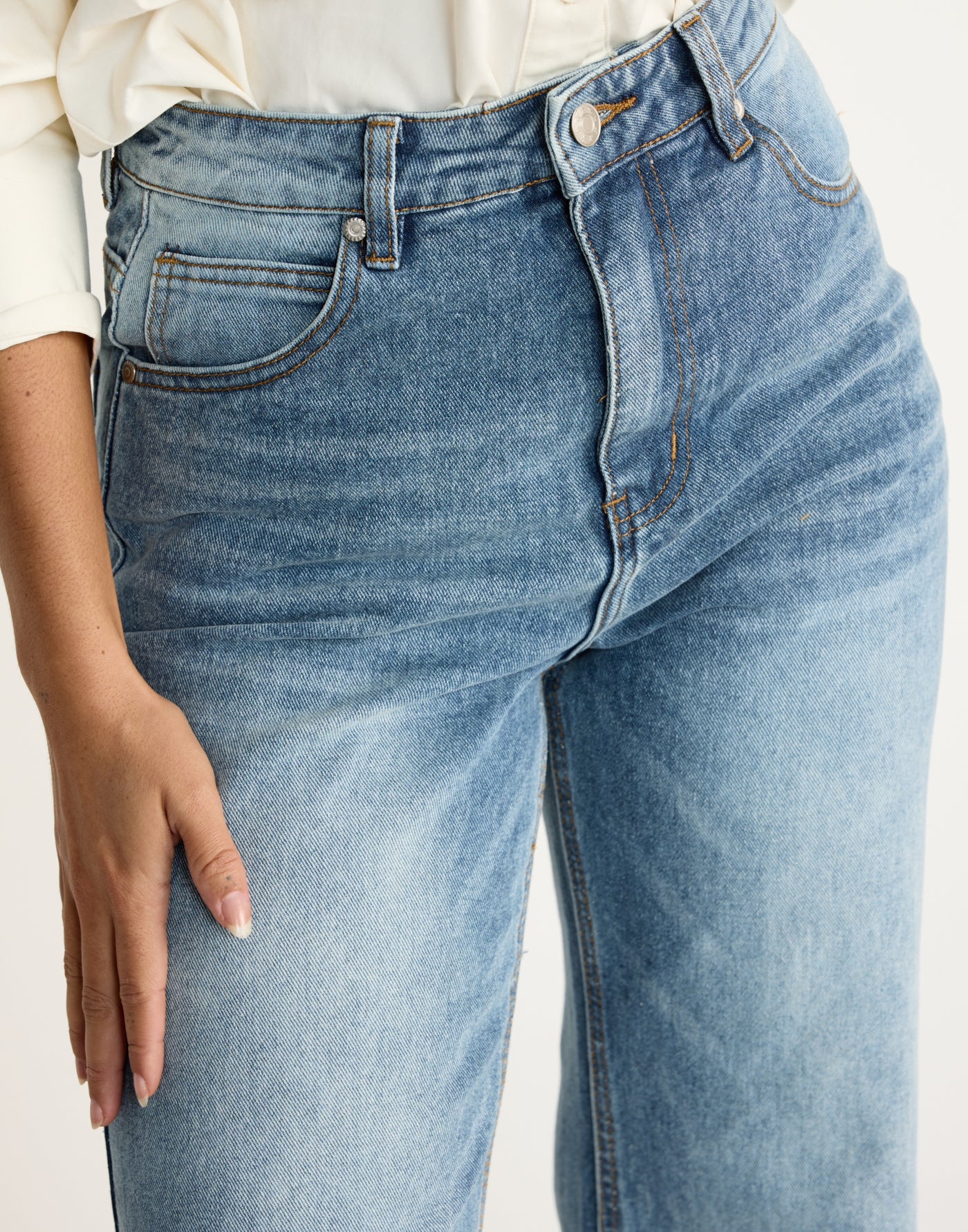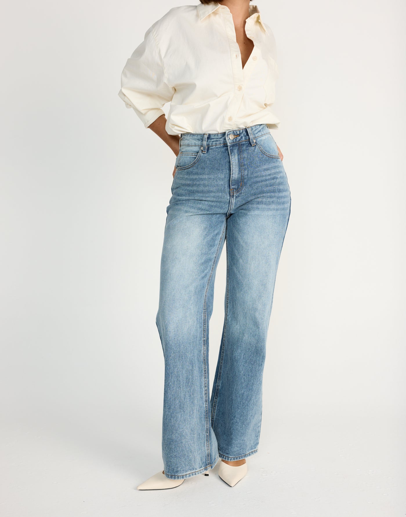 The Zach Jeans feature a high-rise fit with a slight flare, complete with functional pockets and belt loops for a timeless everyday style.