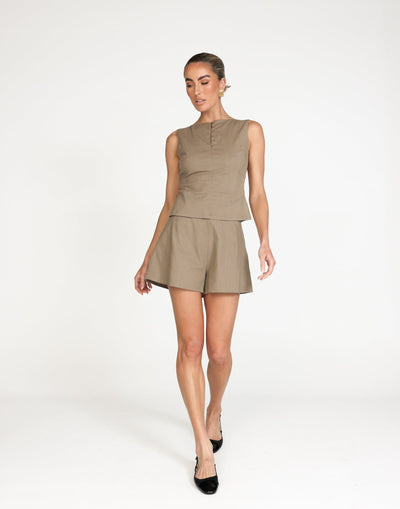 HATI SHORTS (MUSHROOM) - CHARCOAL EXCLUSIVE The Hati Shorts are designed with darts along the back for a tailored fit. These high-waisted shorts feature a wide leg silhouette, offering a relaxed yet stylish look. Lined for comfort, they are perfect for dressing up or down, making them a versatile addition to your wardrobe.