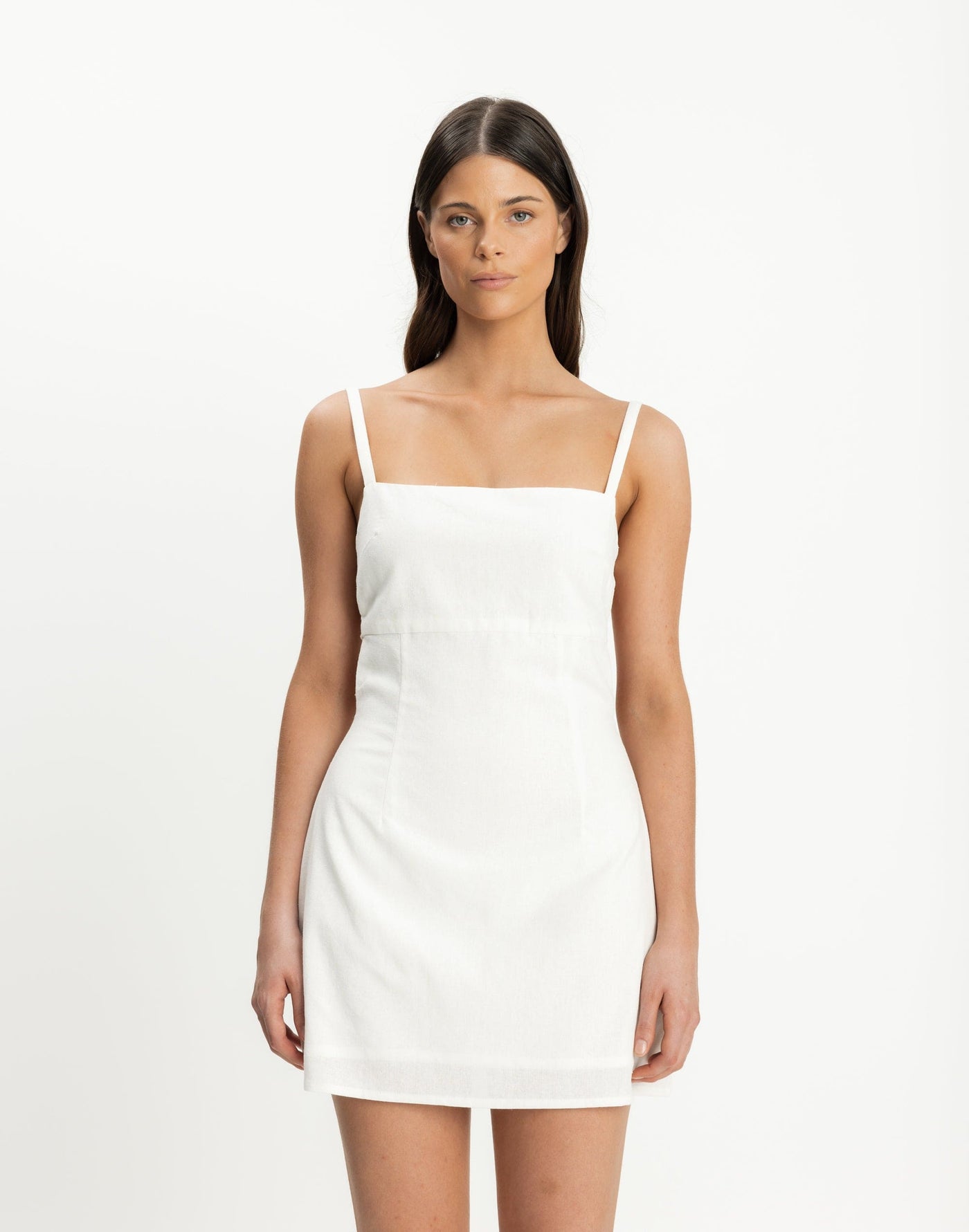 PARADISE MINI DRESS (WHITE) - CHARCOAL EXCLUSIVE The Paradise Mini Dress showcases a backless design with dual horizontal adjustable straps, a straight neckline, and a flared skirt. Fully lined for added comfort and style.