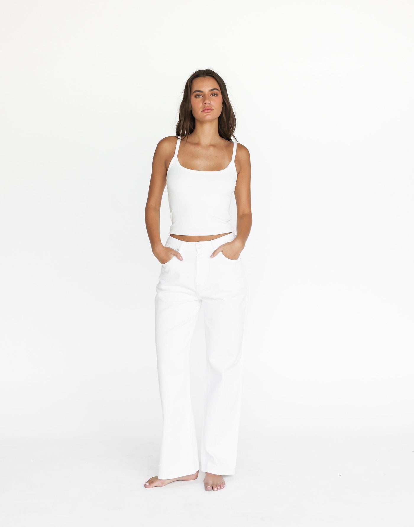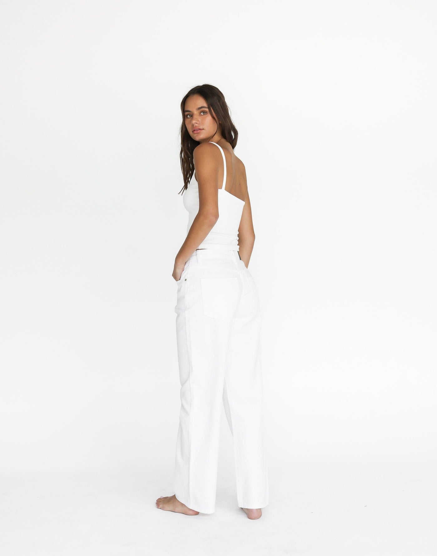 Cole Jeans (White) - CHARCOAL Exclusive Introducing the Cole Jeans, a timeless staple for your wardrobe. These jeans feature a slight tapered leg in a classic mom jean style, offering a flattering silhouette. With functional front and back pockets and beige top stitching, they blend style with practicality. The looser upper leg provides comfort and ease of movement, while the high-waisted design and belt loops add a touch of vintage-inspired charm. Finished with silver buttons, the Cole Jeans are perfect for versatile styling, whether dressed up or down for any occasion.