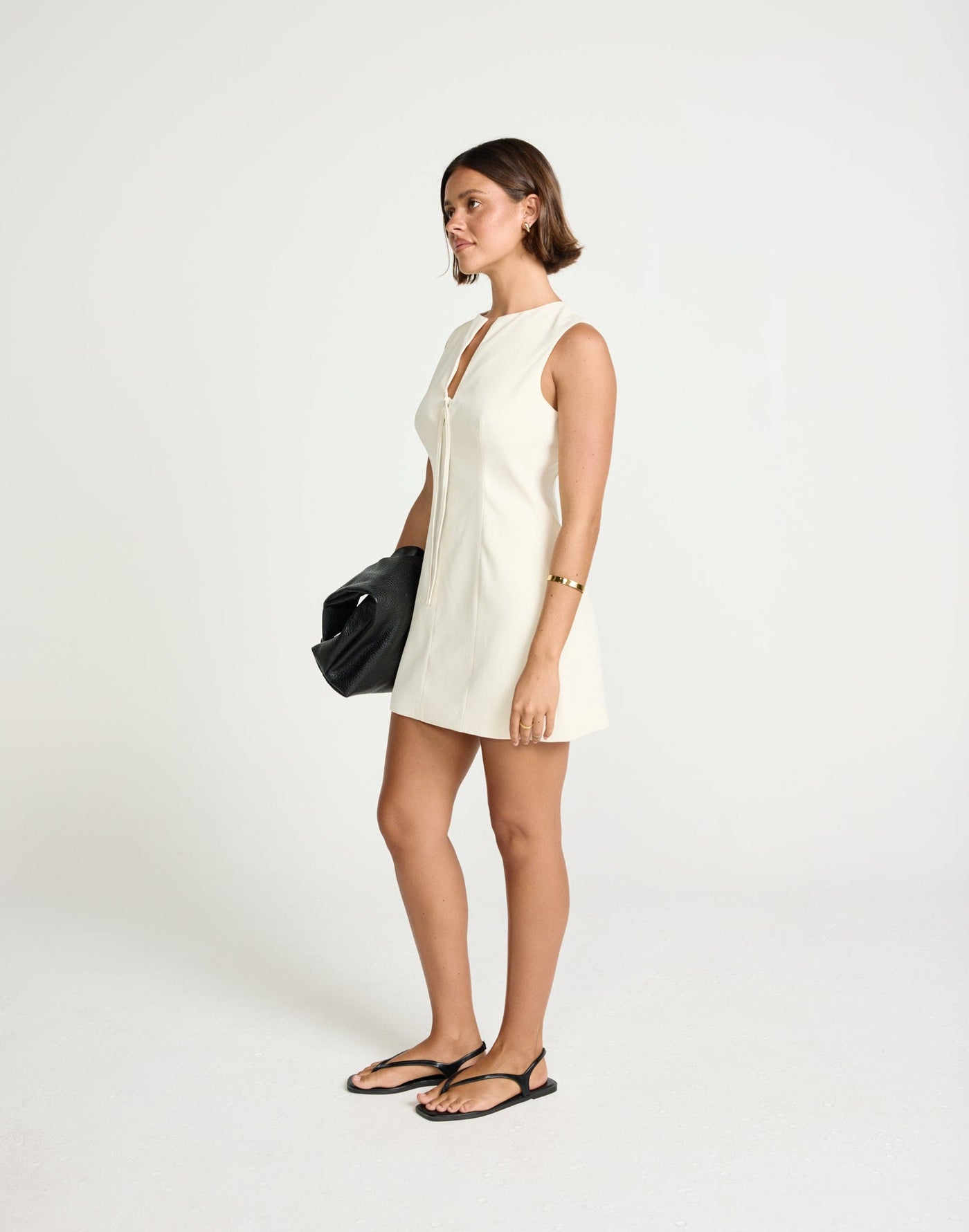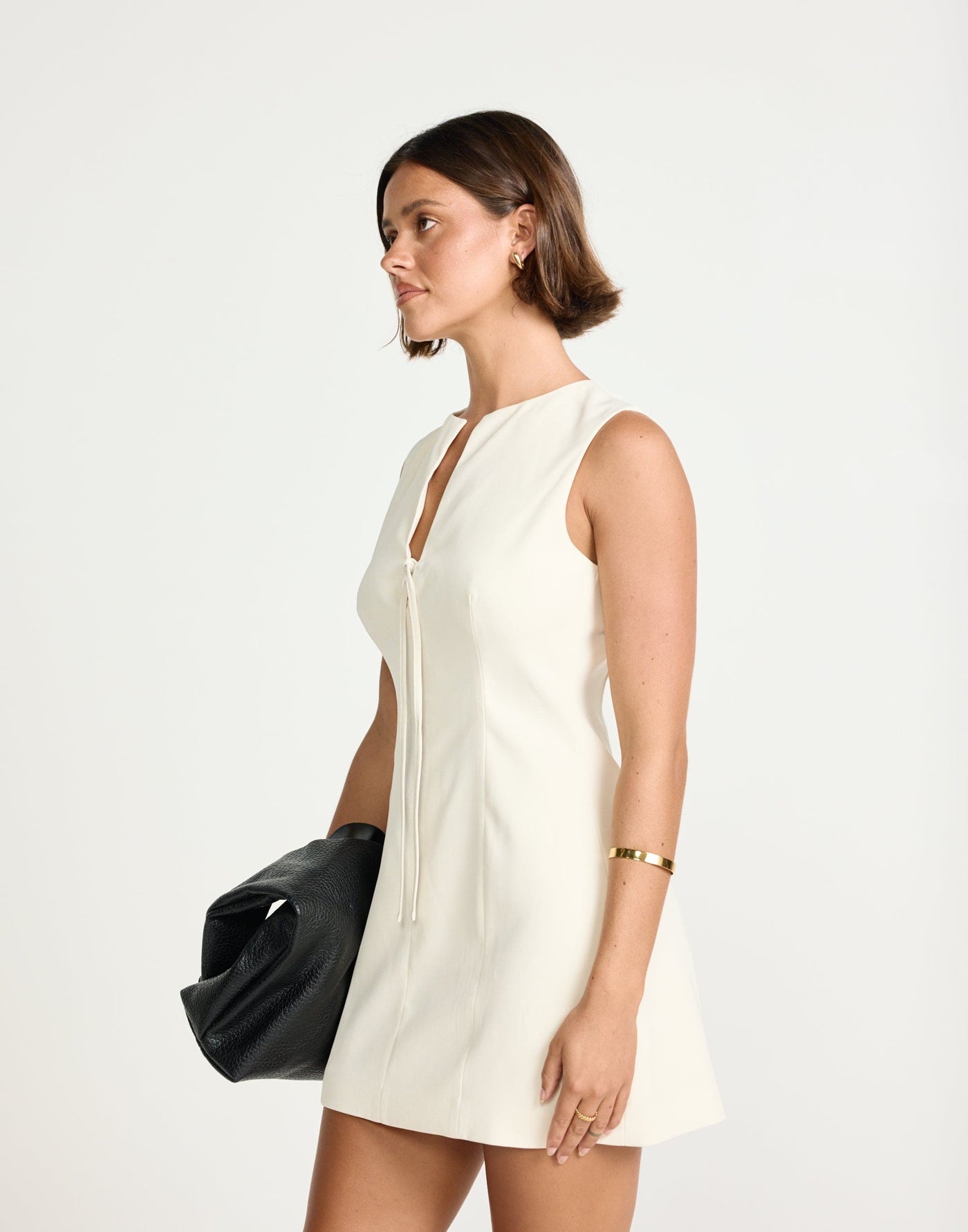 CAISEY MINI DRESS (OAT) - CHARCOAL EXCLUSIVE Introducing the Caisey Mini Dress: featuring a tie-open front detail and a flattering V-neckline. This dress offers an A-line fit and is fully lined for added comfort and style.