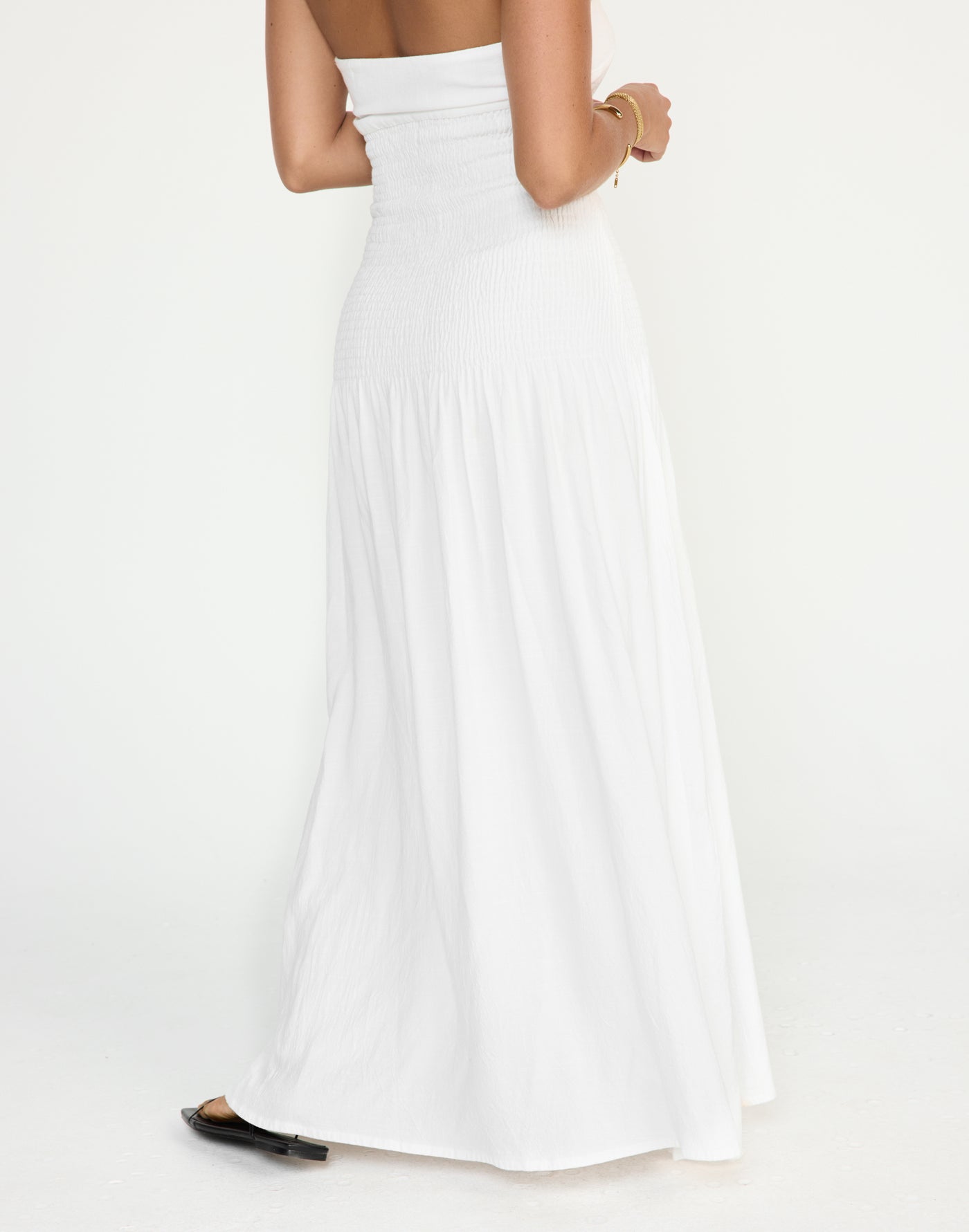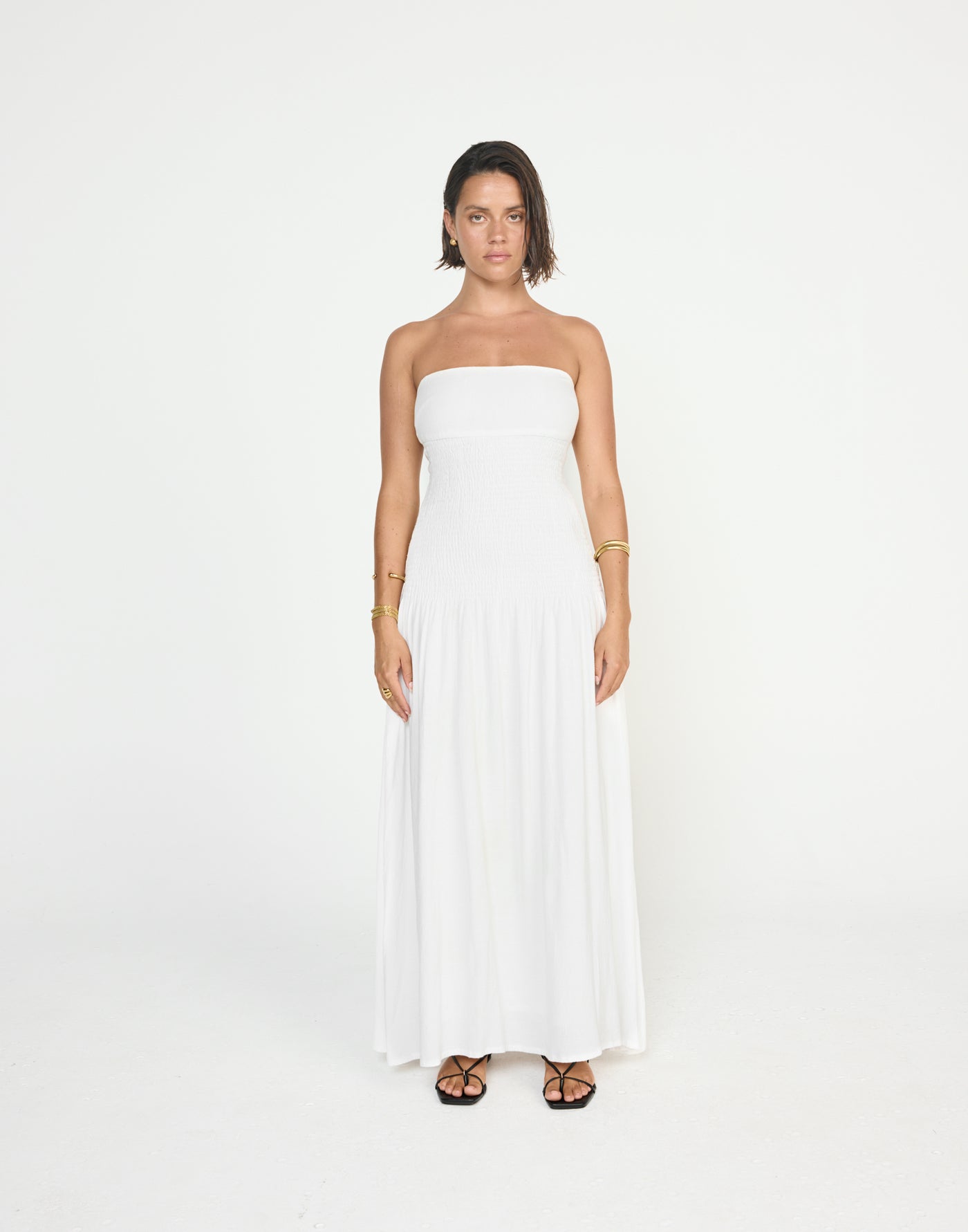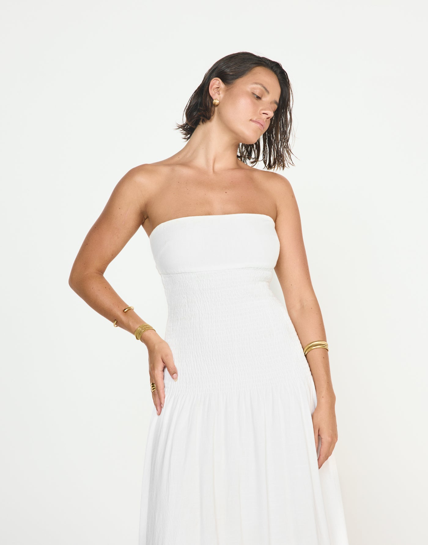DARIA MAXI DRESS (WHITE) - CHARCOAL EXCLUSIVE Introducing the Daria Maxi Dress, a stunning blend of elegance and comfort. Crafted from soft linen, this strapless dress features a ribbed bodice that provides a flattering, stretchy fit. The side zipper ensures easy wear, while the slightly flared hem adds a touch of sophistication. Perfect for warm-weather events, this dress effortlessly combines style and ease, making it an essential addition to your collection.