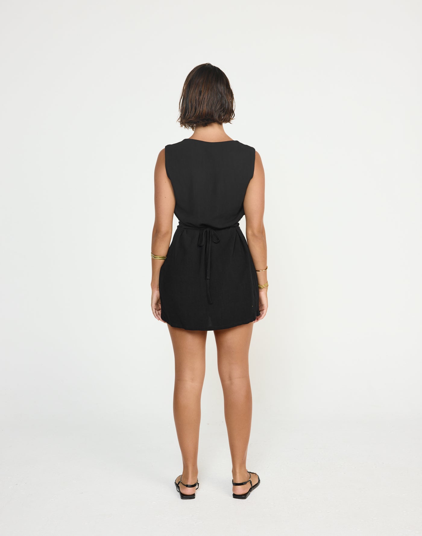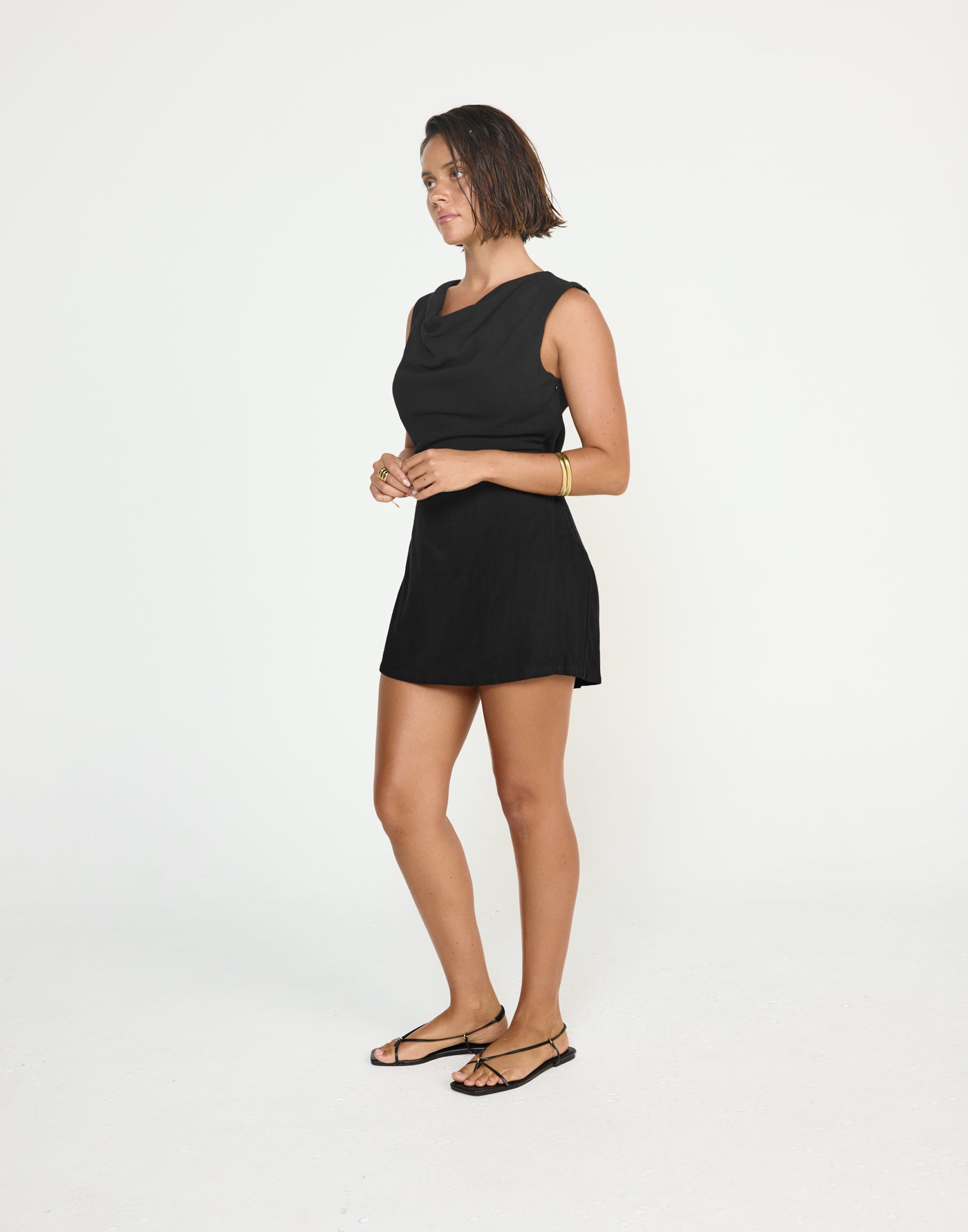 SHORELINE MINI DRESS (BLACK) - CHARCOAL EXCLUSIVE Introducing the Shoreline Mini Dress, a stunning piece that effortlessly blends sophistication and comfort. The cowl neckline creates a soft, elegant look, while the adjustable back tie ensures a perfect fit. A slight flared hem adds movement and flow, and the zipper entry makes it easy to slip on. Crafted from breathable linen, this dress is perfect for warm-weather occasions, offering both style and ease.
