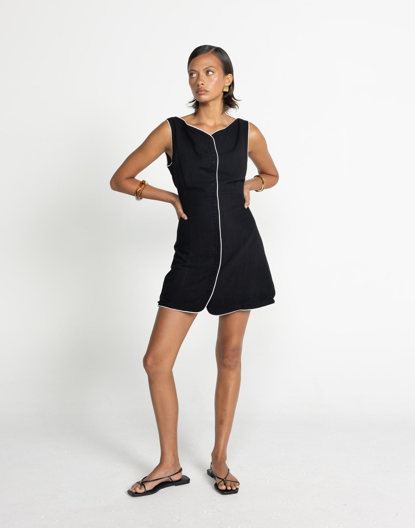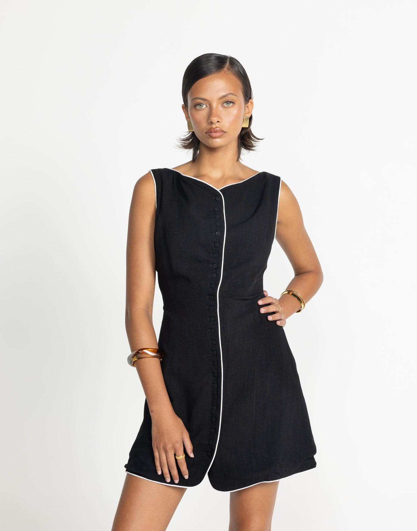 Asta Mini Dress (Black/White) - CHARCOAL Exclusive Introducing the Asta Mini Dress, a chic and refined ensemble crafted from a luxurious linen blend that exudes effortless elegance. With its center button closure and contrast binding, this dress offers a subtle yet striking accent to elevate your style. The high neckline adds a touch of sophistication, while the lining ensures comfort and coverage. Perfect for any occasion, the Asta Mini Dress is a timeless addition to your wardrobe, promising both style and comfort with its impeccable design and premium fabric.