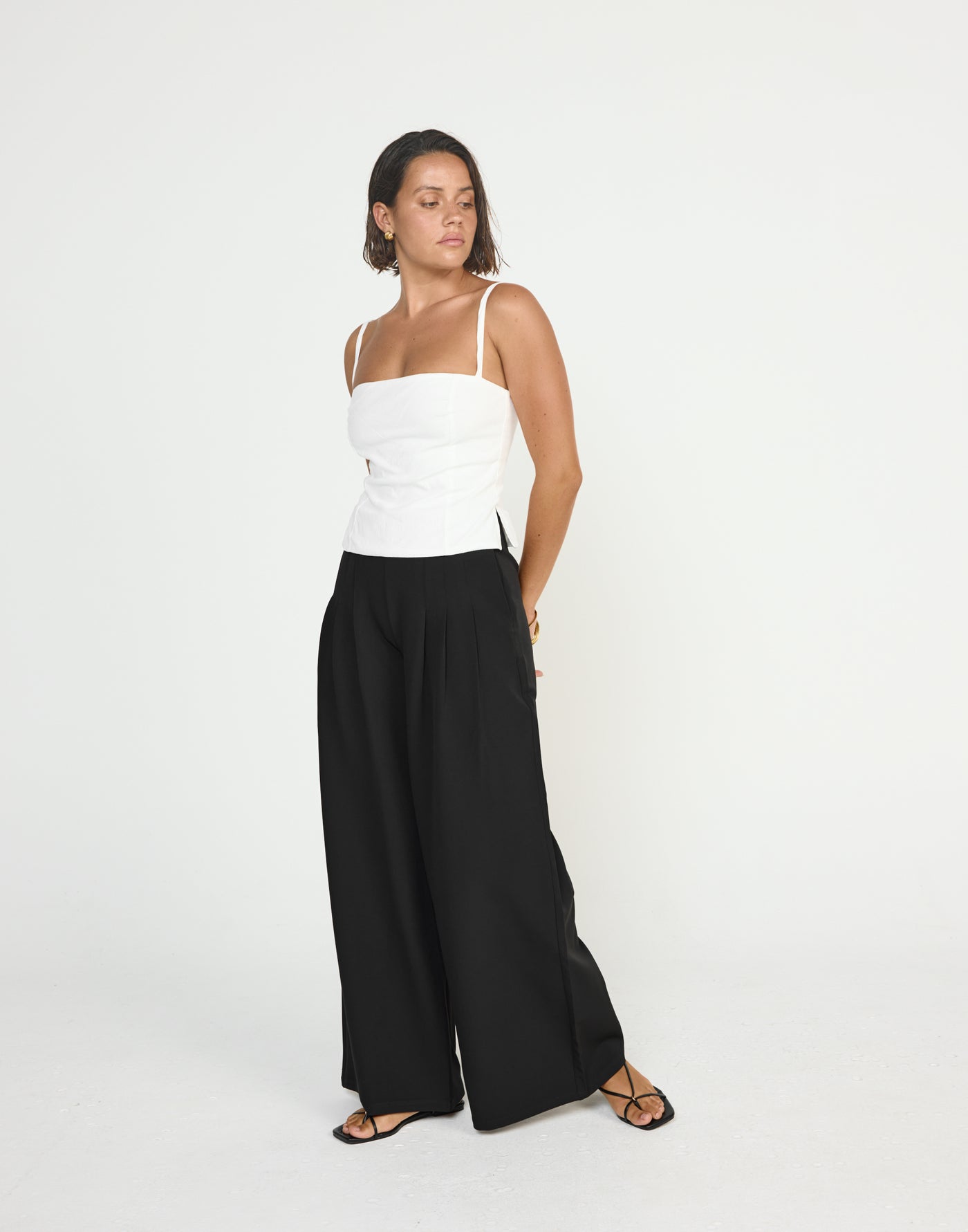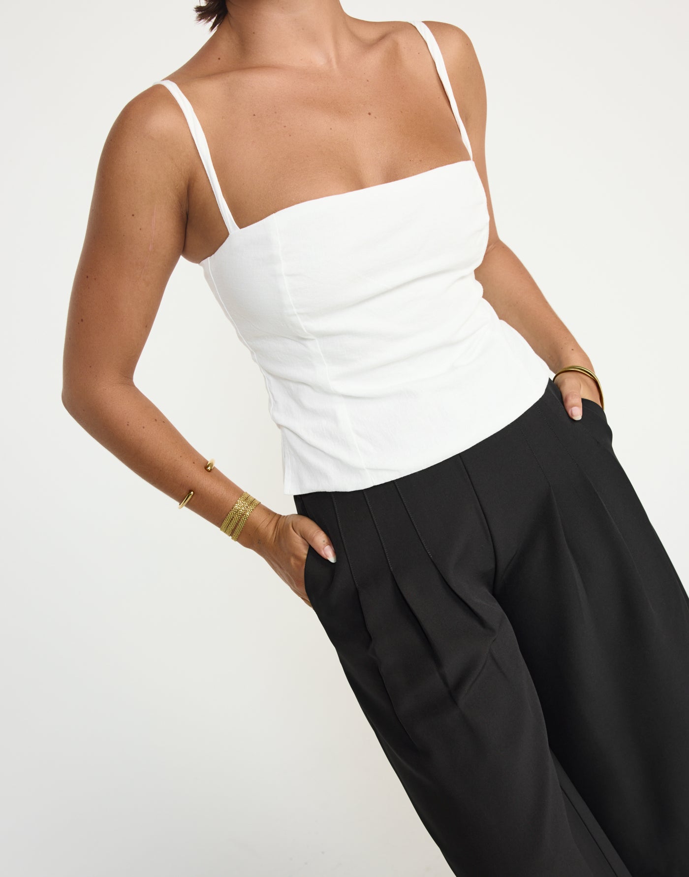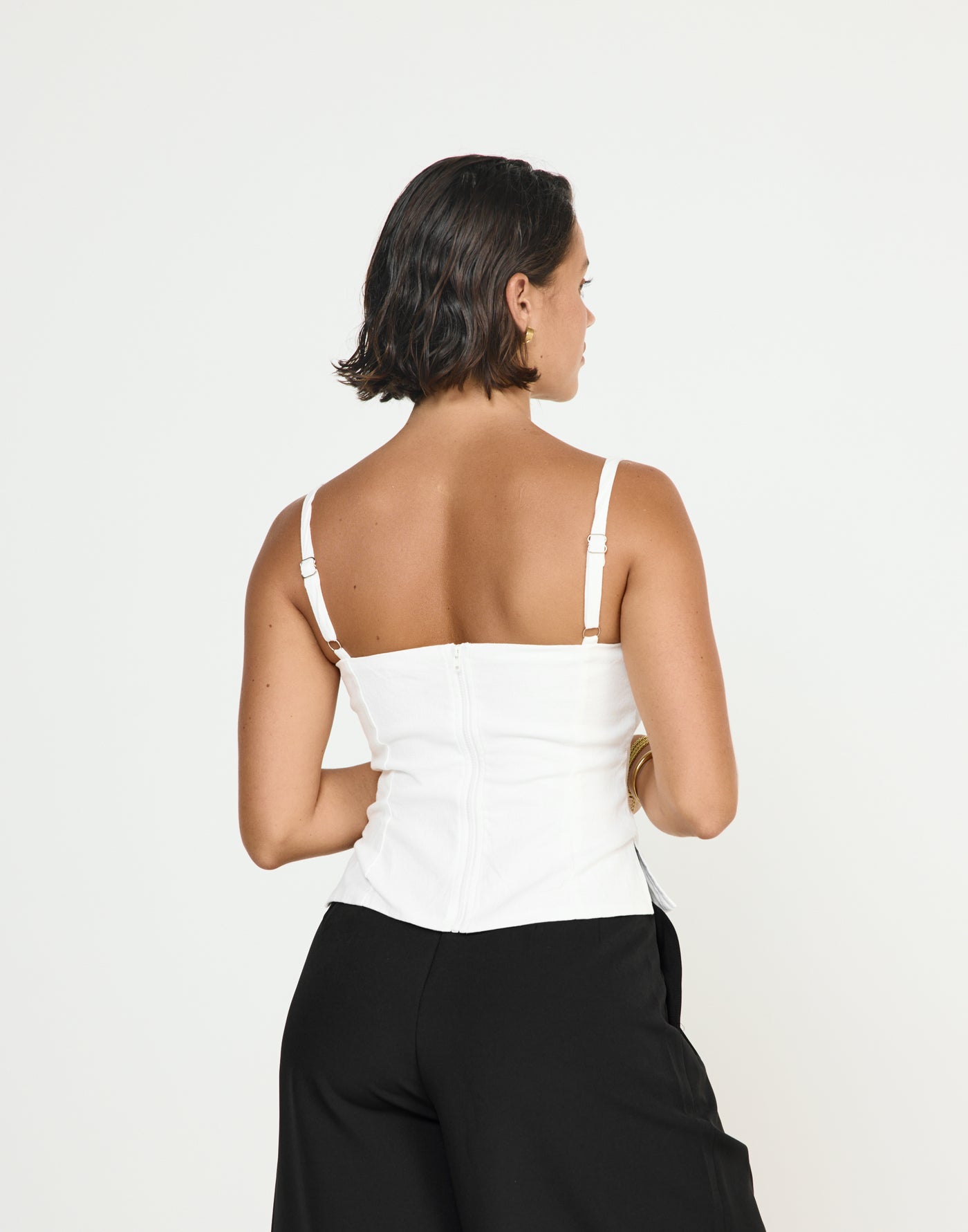 SIRENA TOP (WHITE) - CHARCOAL EXCLUSIVE The Sirena Top is the perfect balance of sleek and statement-making. Featuring a straight neckline and fitted silhouette, it creates a clean, flattering look that's both modern and versatile. Adjustable thin straps allow for a custom fit, while the centre-back zipper ensures easy on and off. The stylish side splits add a unique touch, giving this top just the right amount of edge. Whether dressed up with a skirt or paired with your favourite jeans, the Sirena Top is your go-to for effortless sophistication.