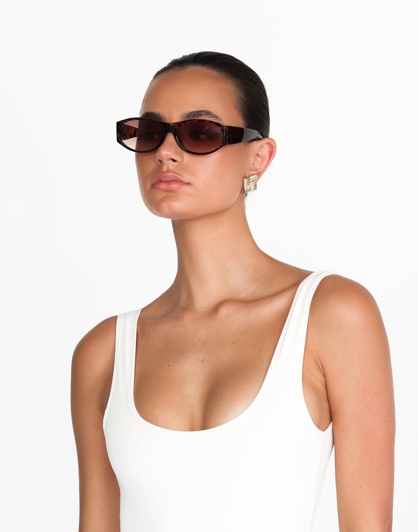 LEILA SUNGLASSES (TORT)  The Leila sunglasses feature a bold, rectangular frame with sharp, angular edges for a contemporary and edgy look. The lenses are dark, providing strong sun protection, while the frames have a tortoiseshell pattern, adding a classic yet stylish touch. The design is sleek and form-fitting, offering a fashionable, modern accessory that pairs well with any outfit. The frames are wider at the temples, accentuating the cat-eye-inspired shape.
