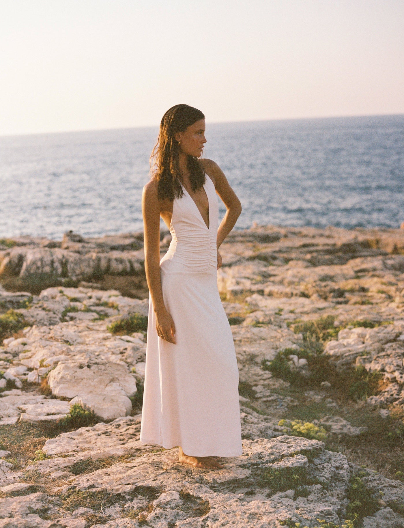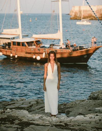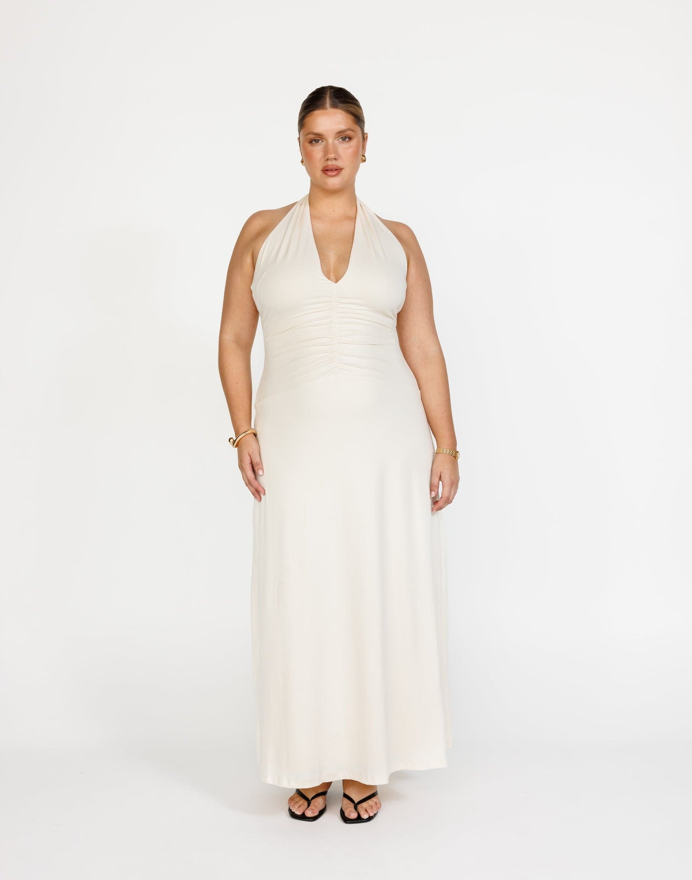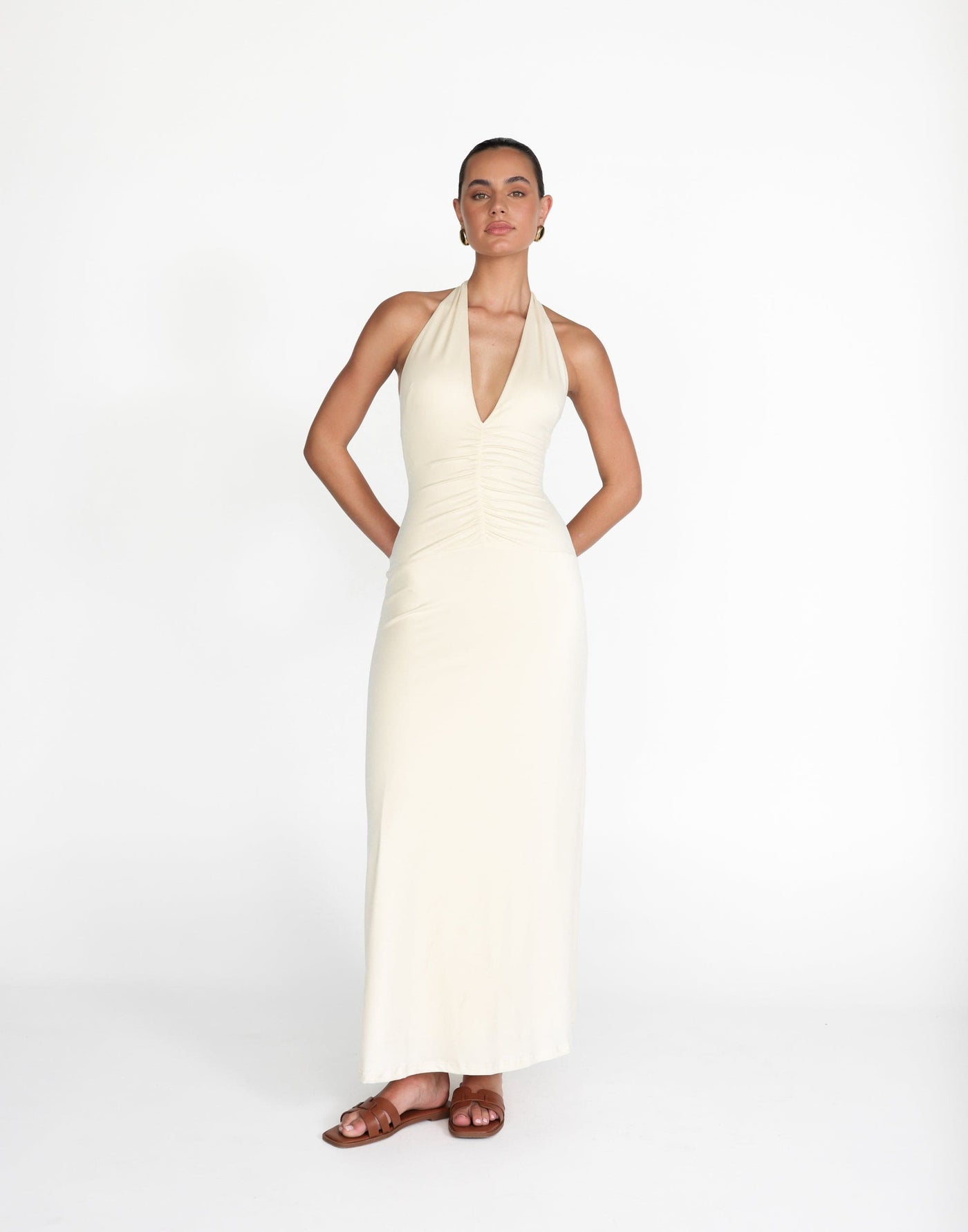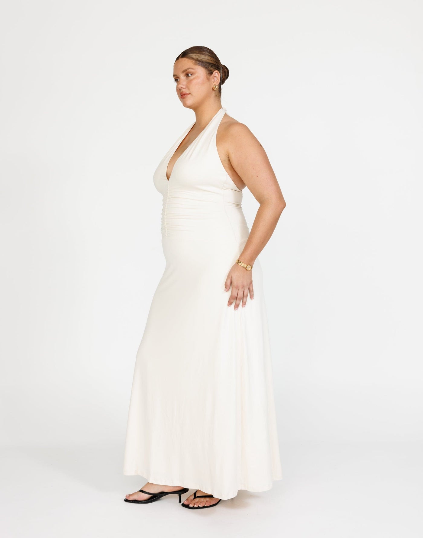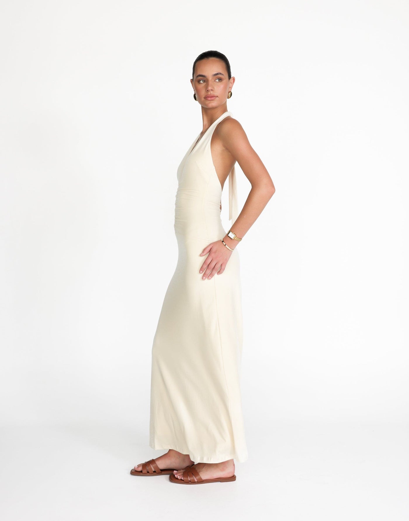 ARAMINTA MAXI DRESS (OAT) - CHARCOAL EXCLUSIVE Introducing our Araminta maxi dress, a true embodiment of refined sophistication. Crafted from luxurious butter jersey fabric, it offers an incredibly soft and sumptuous feel against the skin. The tie-up halter neck, plunging V neckline, and low open back radiate classic charm, while the flowing slightly flared skirt adds a graceful and captivating touch. Meticulously lined for comfort, this dress is perfect for your upcoming events where you want to make a statement in effortless, elegant style.