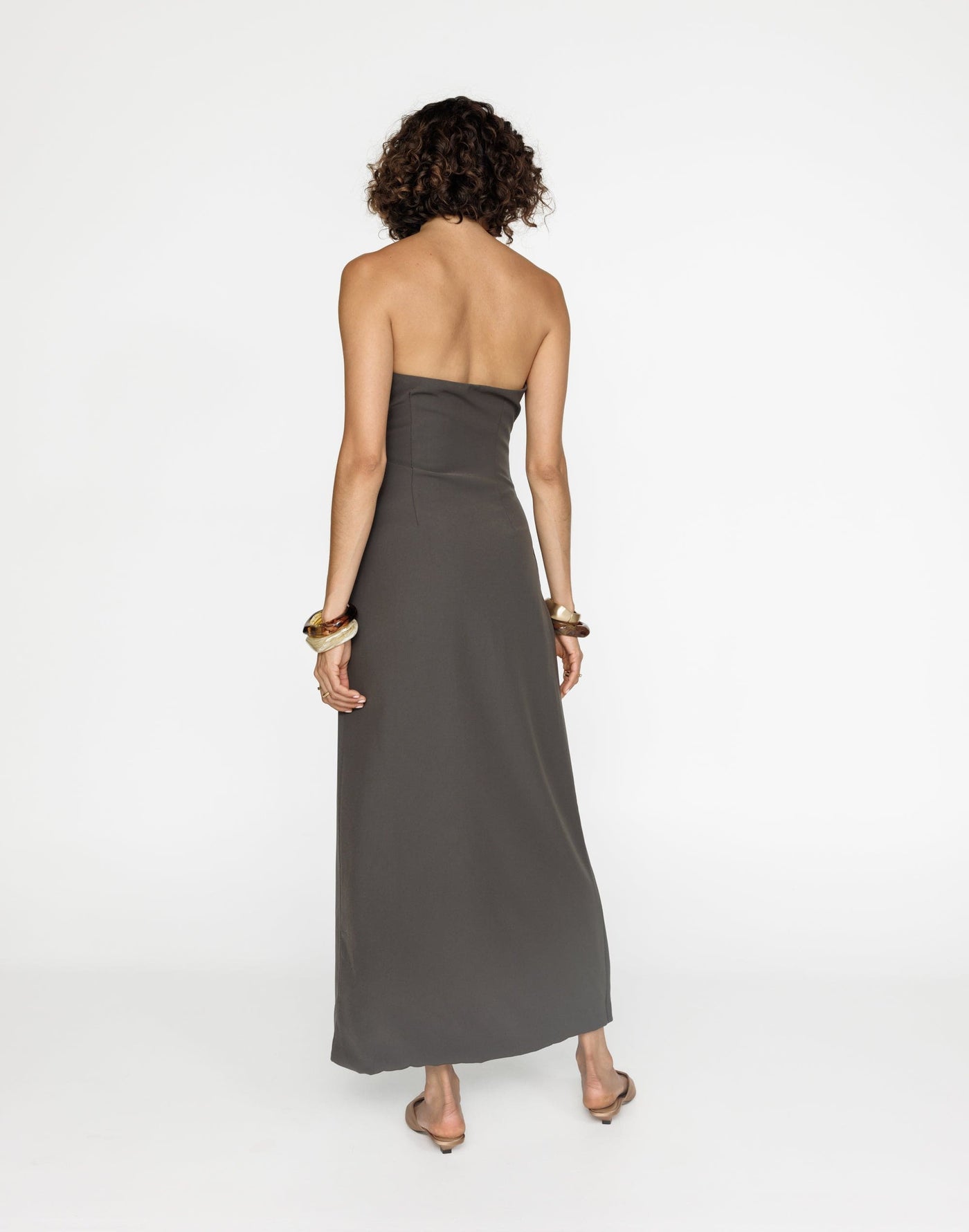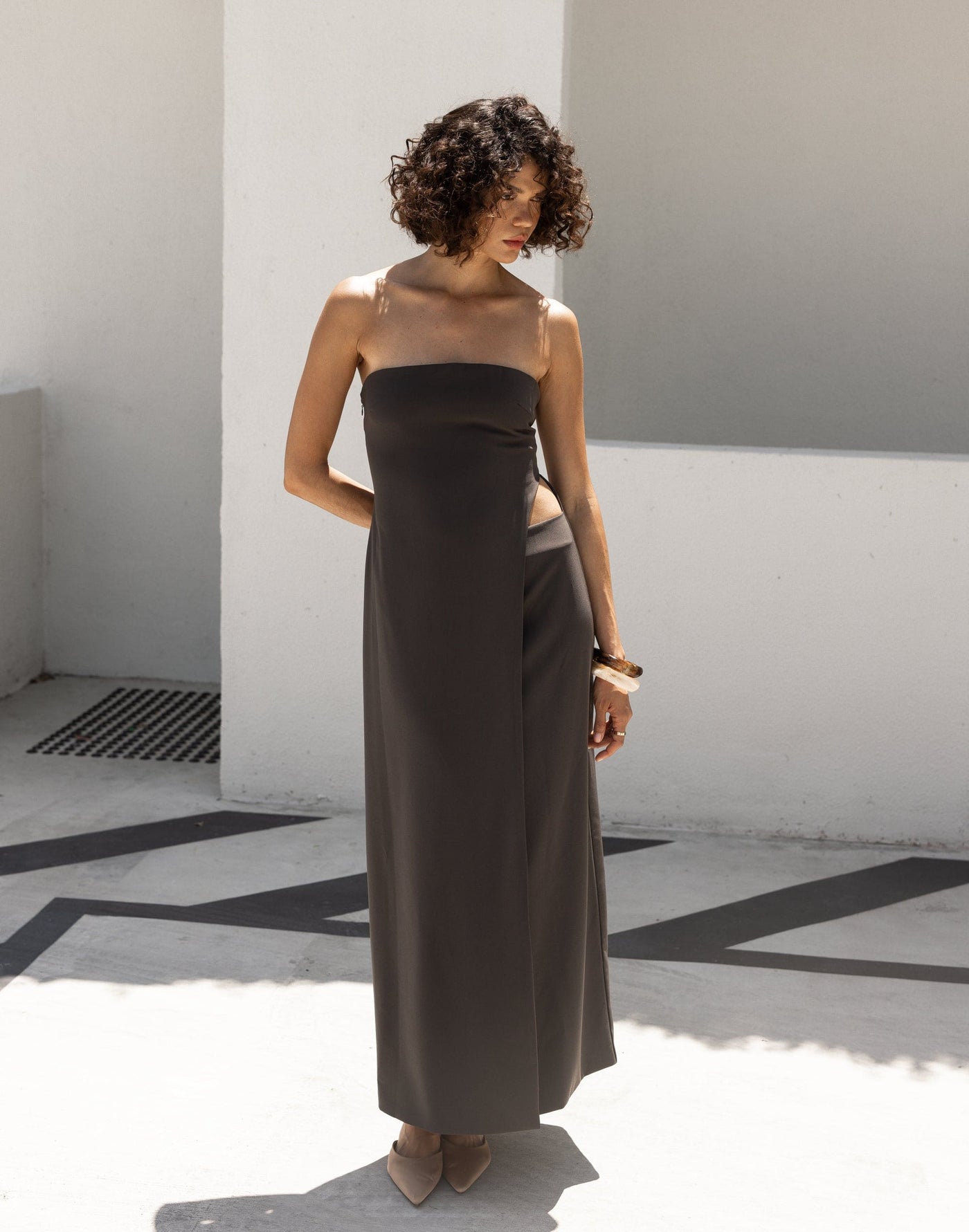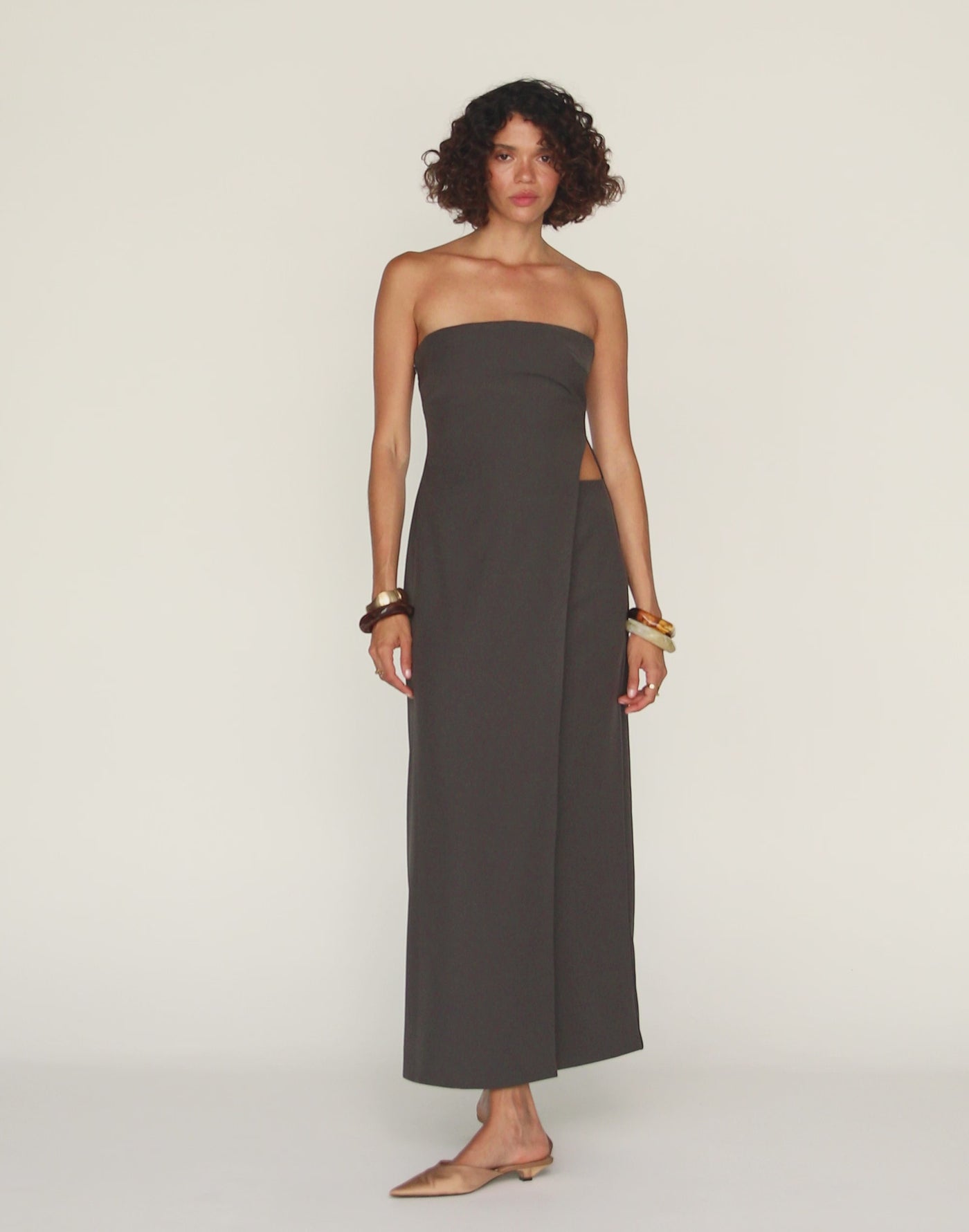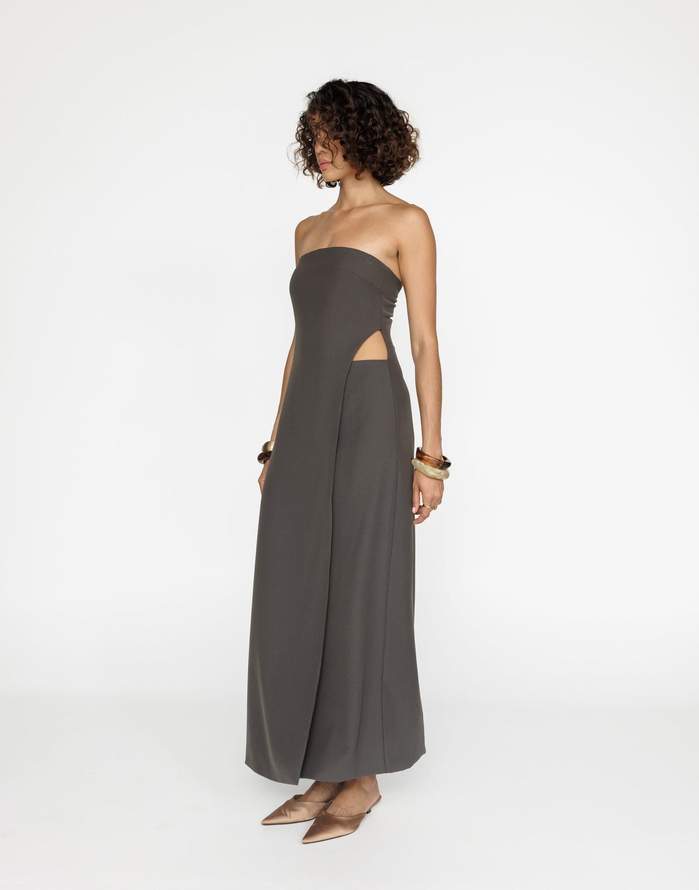 GABBY MAXI DRESS (CHARCOAL) - CHARCOAL EXCLUSIVE The Gabby Maxi Dress exudes effortless elegance with its wrapped, layered design and side cut-out for a hint of allure. Strapless with grip tape along the bust for a secure fit, this dress flows into a beautifully flared skirt, creating a graceful silhouette. Lined for comfort, its an exquisite choice for any special occasion.