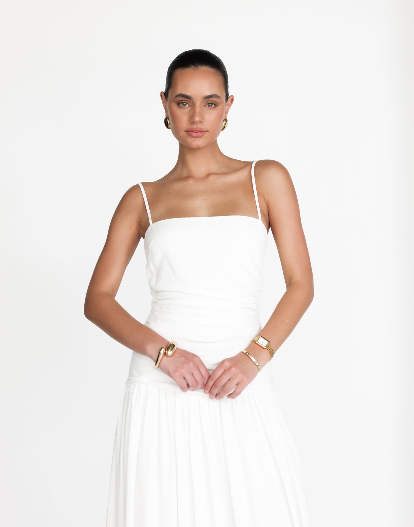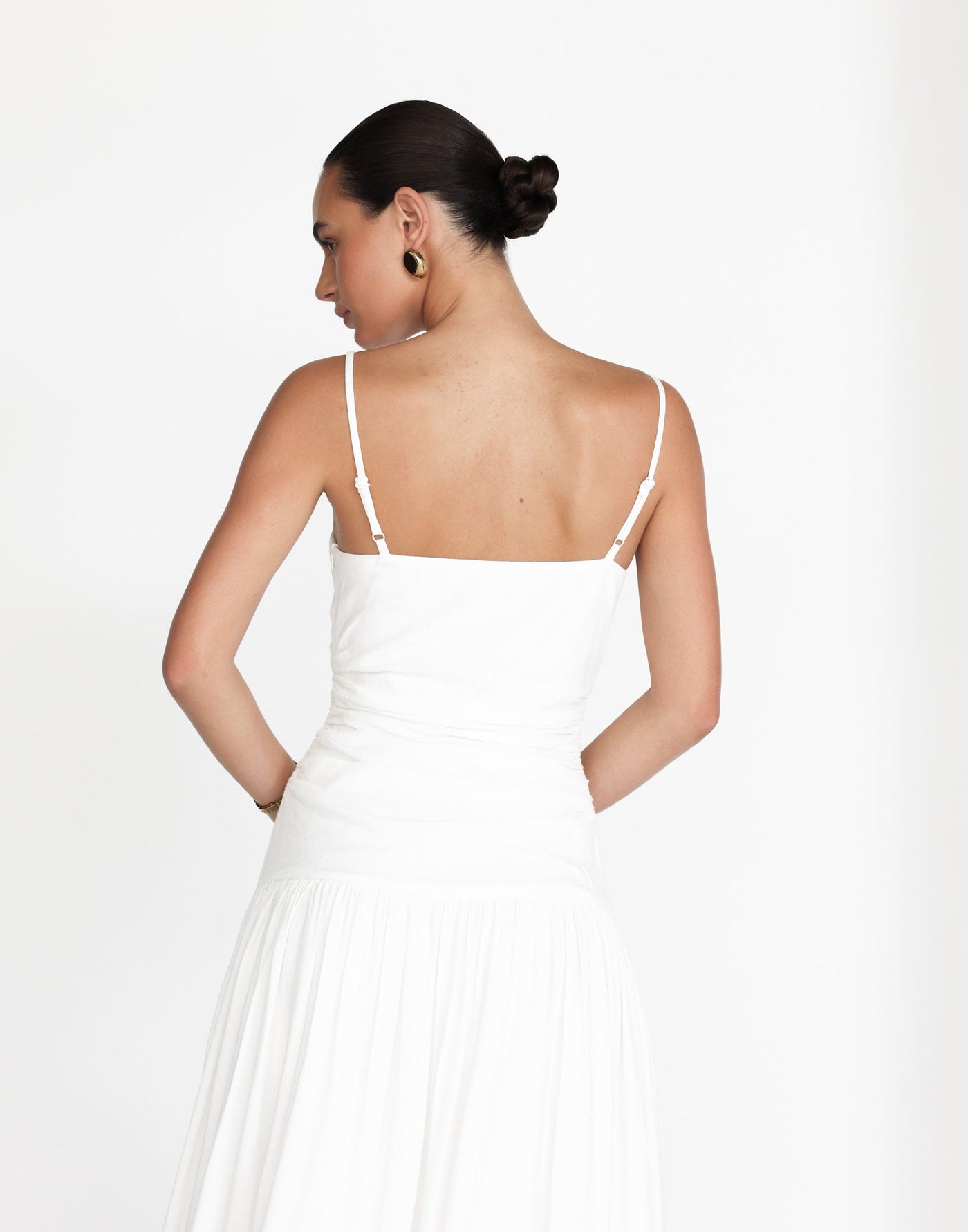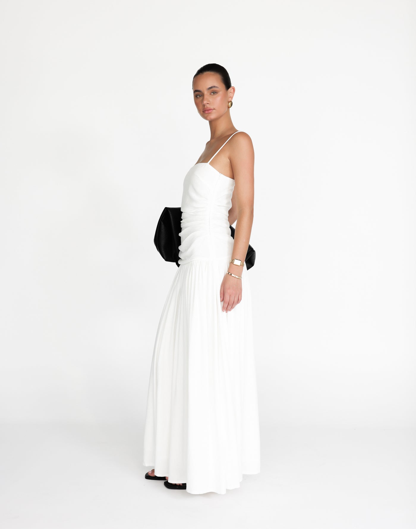 REESE MAXI DRESS (WHITE) - CHARCOAL EXCLUSIVE The Reese maxi dress features a straight neckline with adjustable straps for a personalised fit. Its flowing skirt creates an elegant silhouette, while the linen blend fabric provides breathability and comfort. Fully lined for enhanced quality and a smooth finish, this dress combines style and practicality effortlessly.