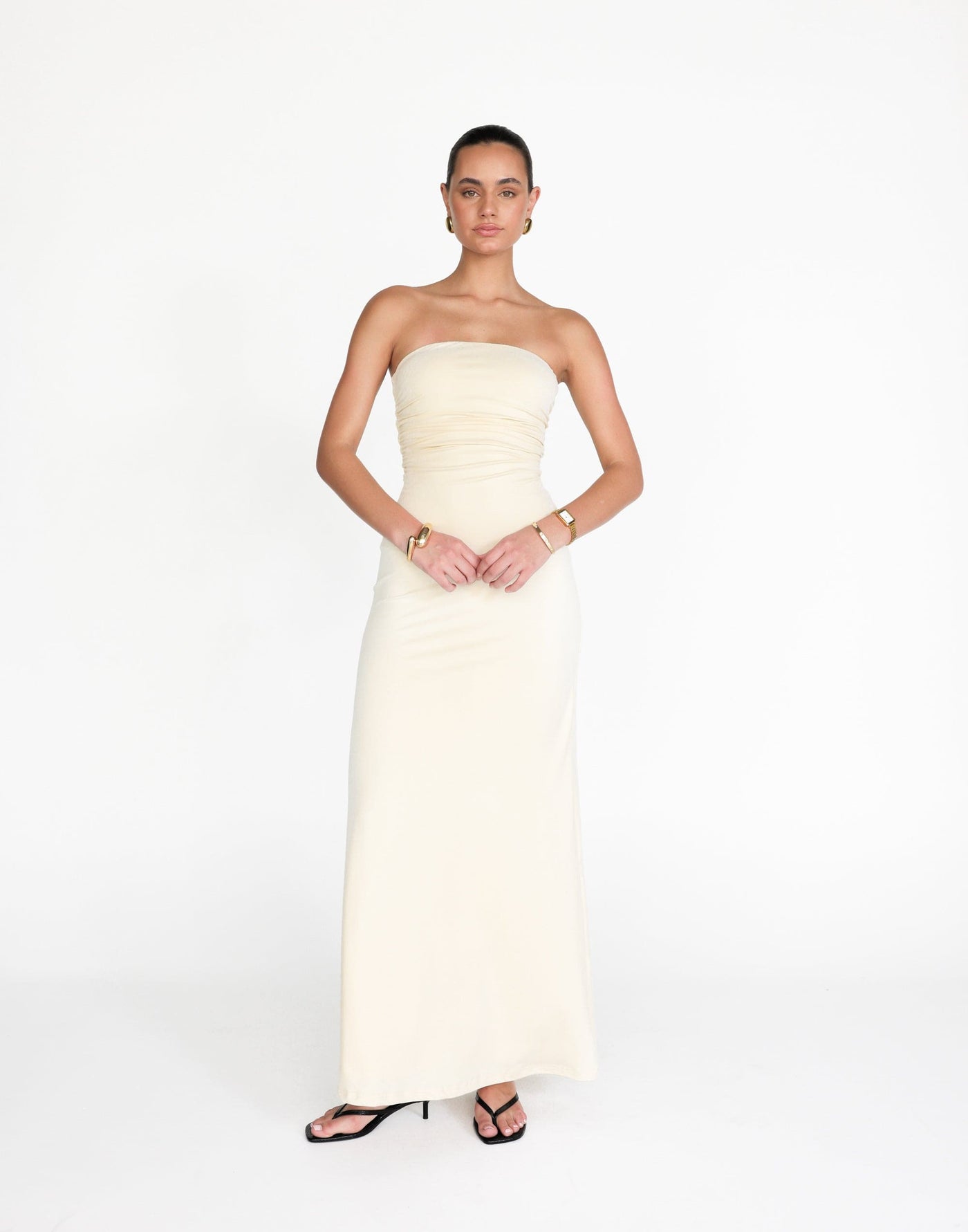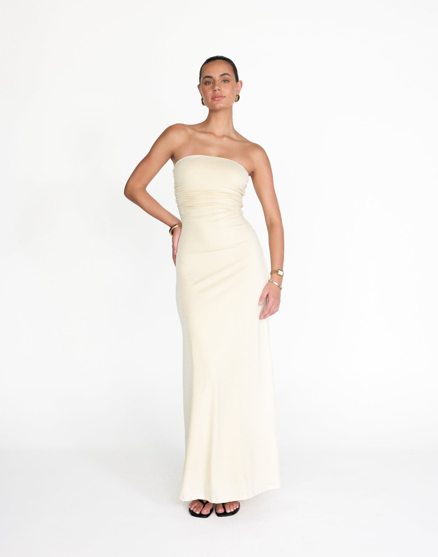 Sarie Maxi Dress (Oat) | CHARCOAL Exclusive - Strapless Bodycon Jersey Flared Hem Gathered Detail Maxi Dress - Women&