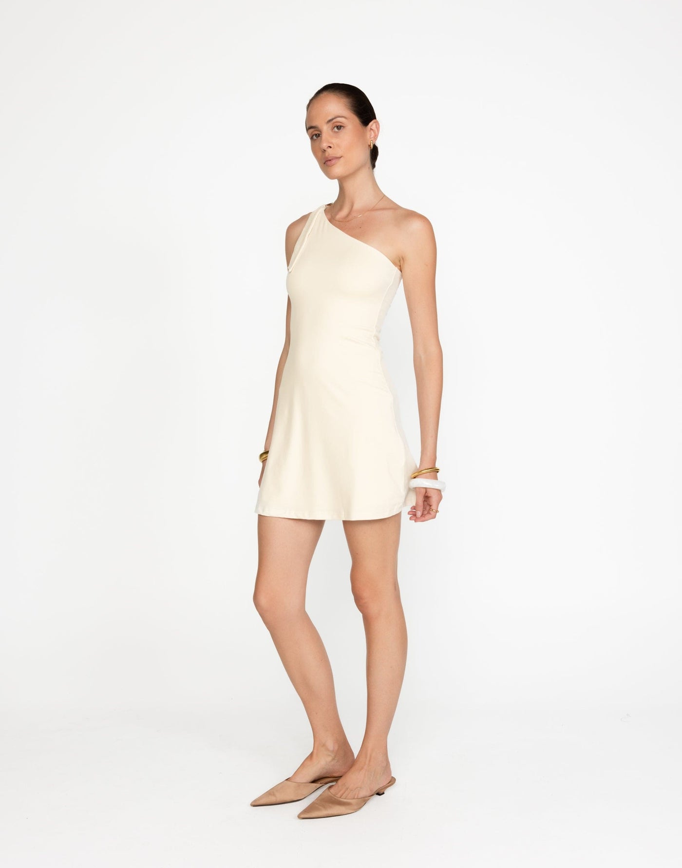 ZUELIA MINI DRESS (OAT) - CHARCOAL EXCLUSIVE The Zuelia Mini Dress features a gold adjustable embellishment on the shoulder, an asymmetrical one-shoulder design, and a flared skirt. Crafted from soft butter jersey, it offers a sleek bodycon fit.