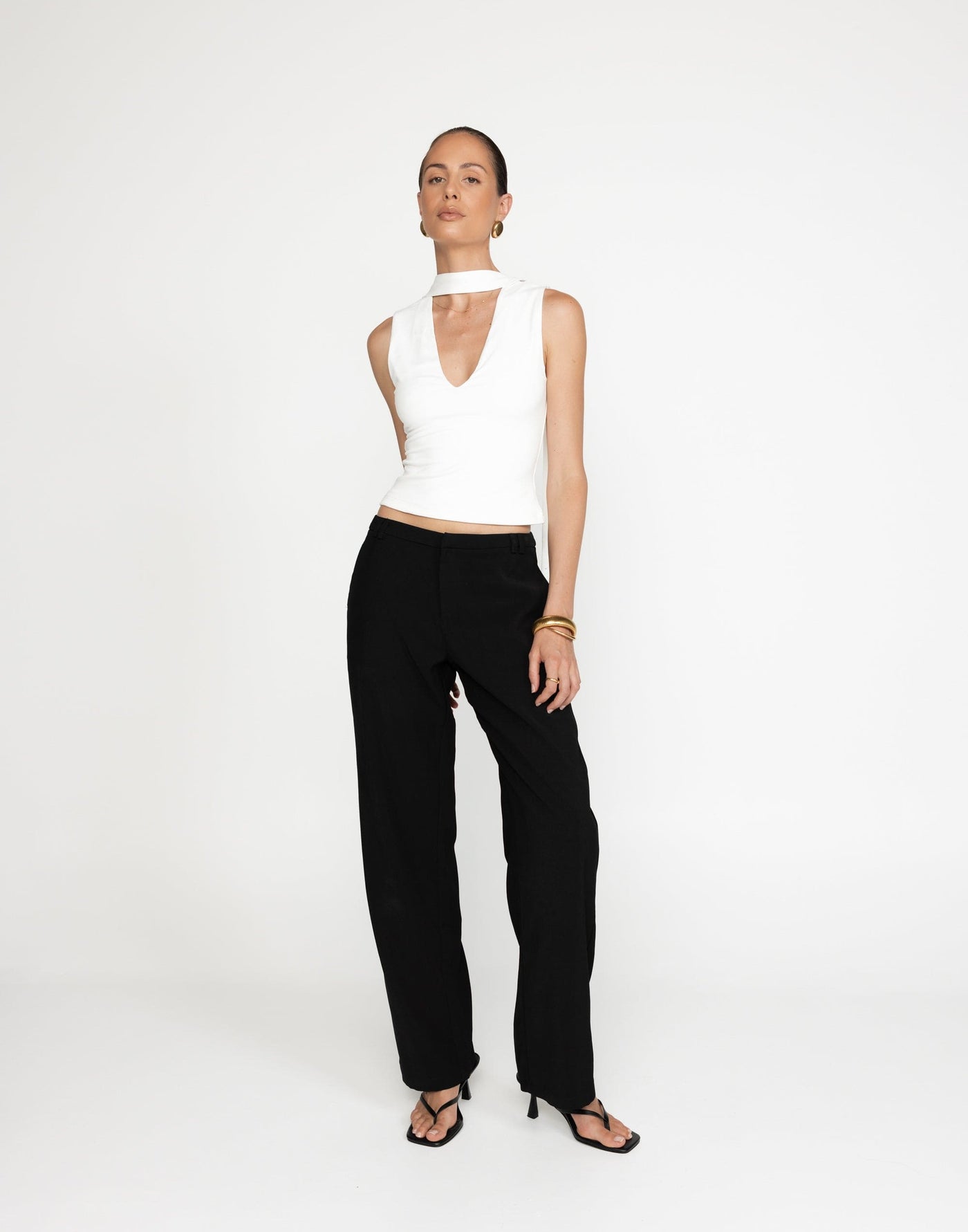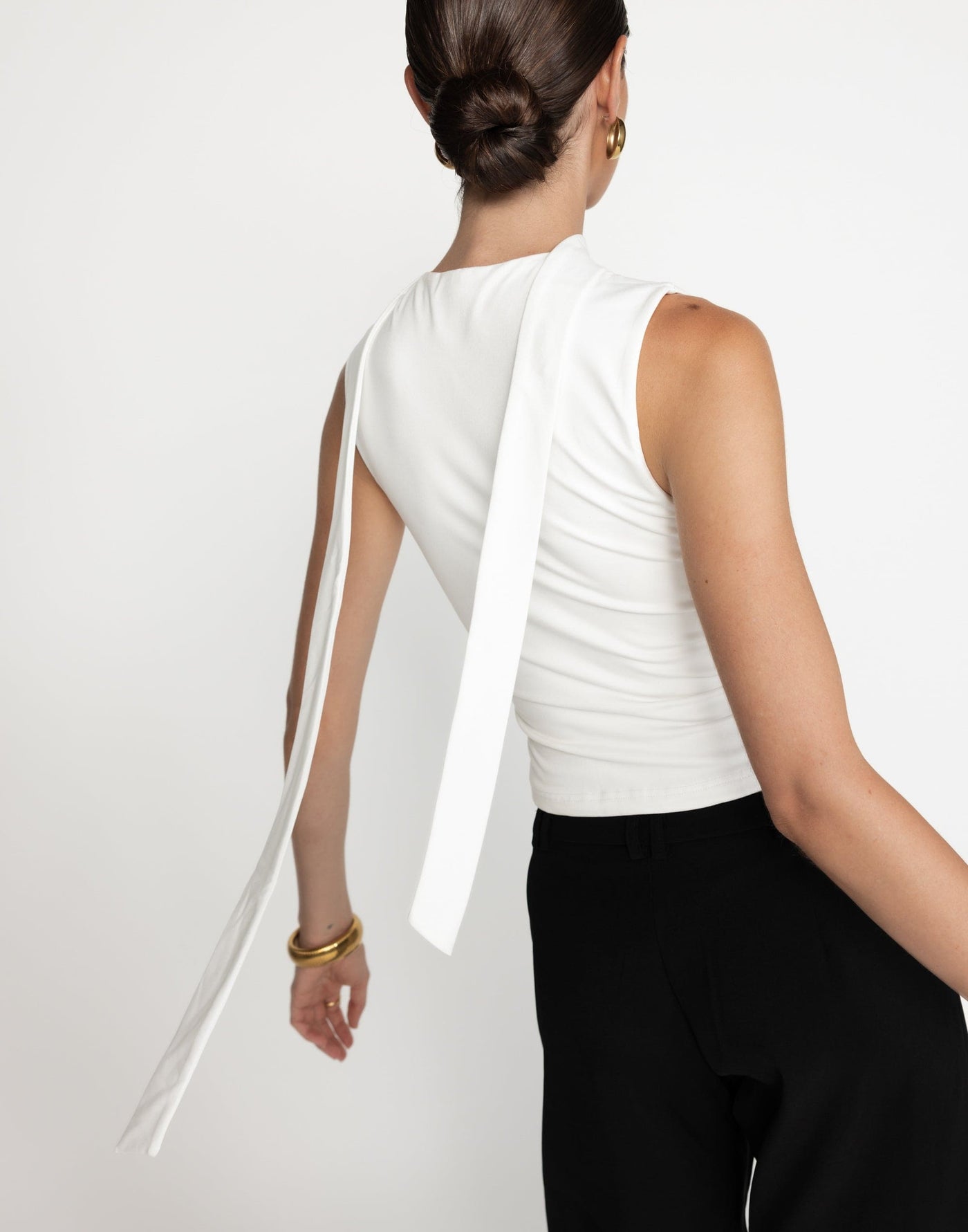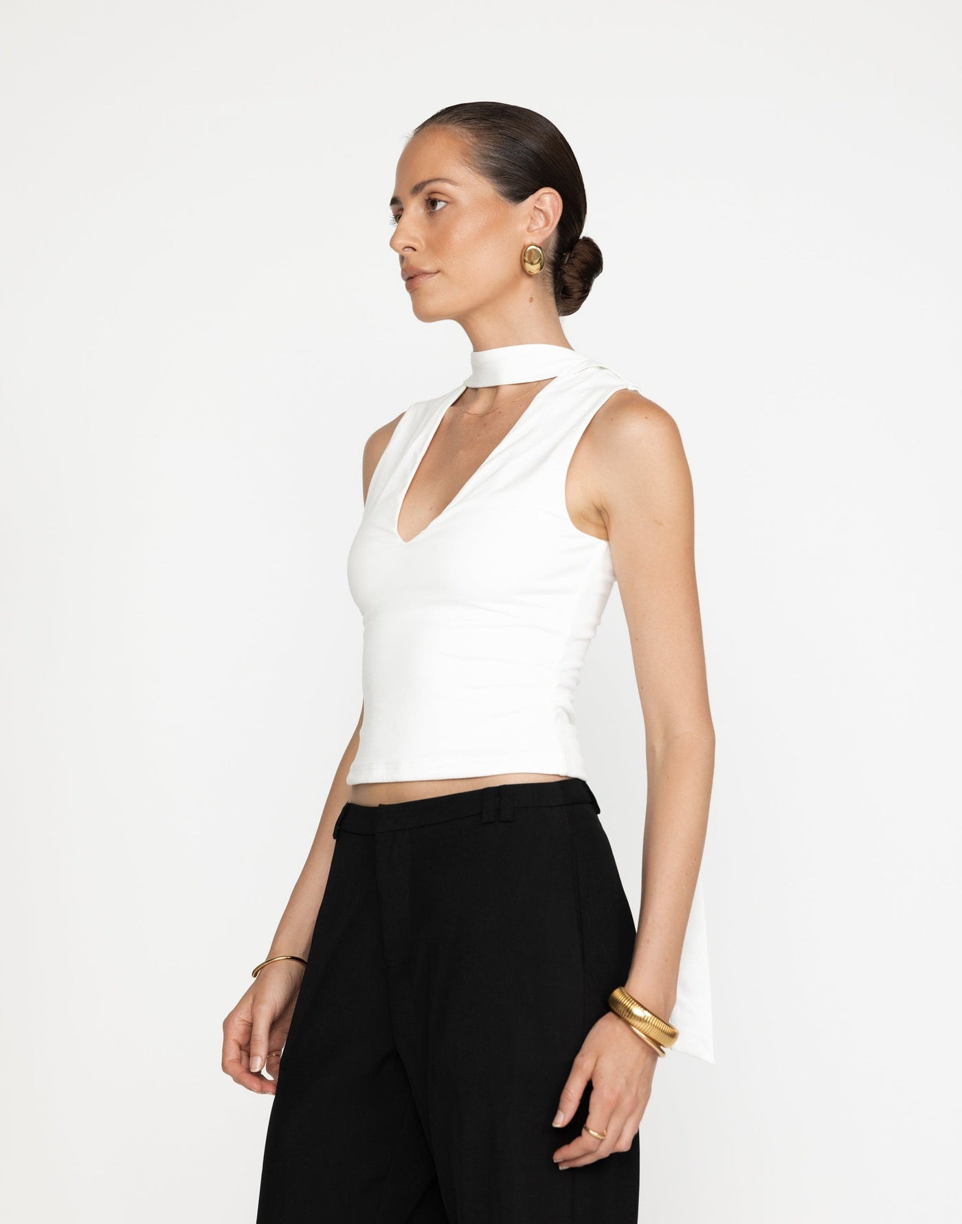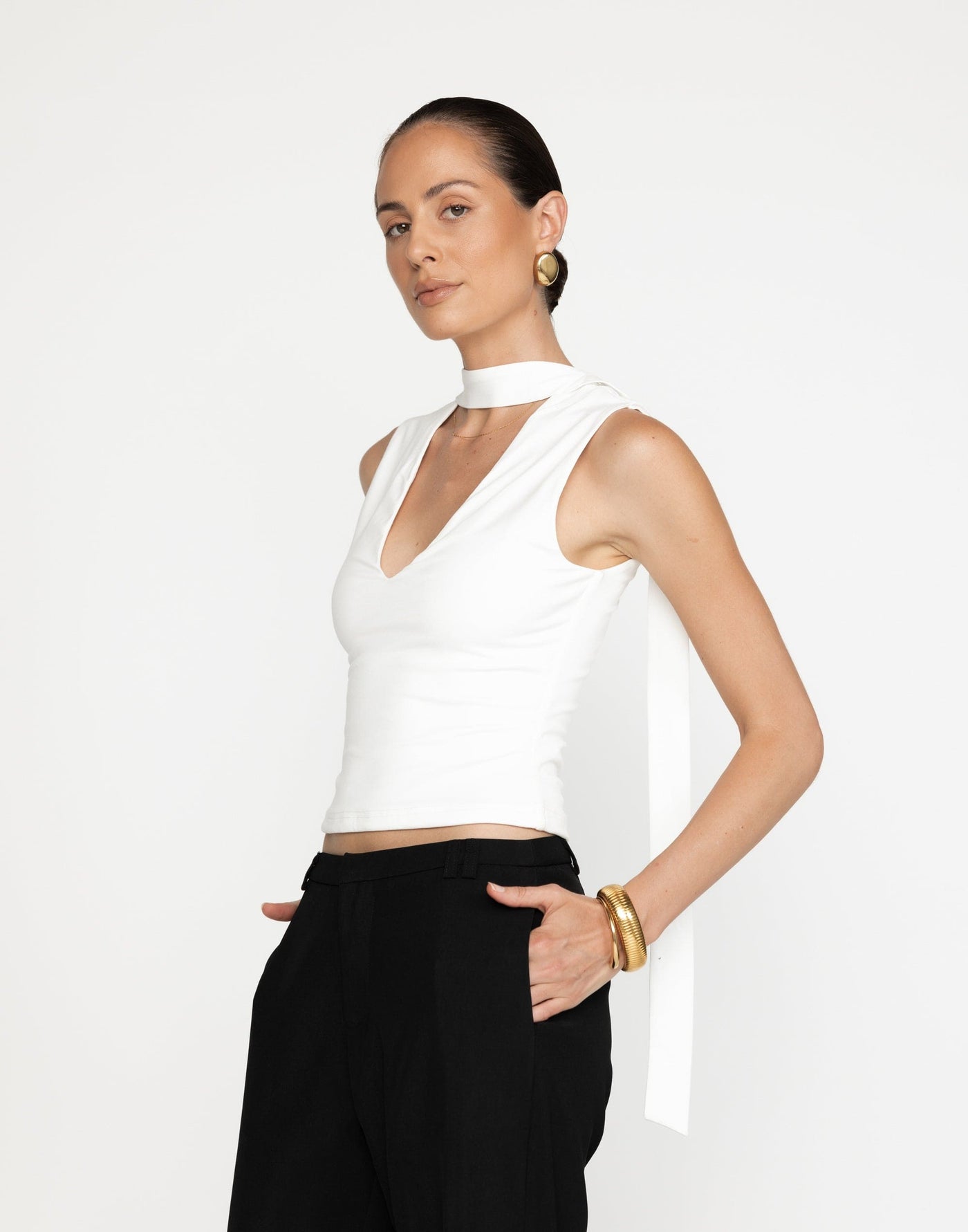 The Agatha Top blends sophistication with contemporary style, featuring an attached neck scarf and a flattering V-neckline. Its bodycon fit and slightly cropped design create a sleek, figure-hugging silhouette. Lined for added comfort, this top is perfect for elevated everyday looks.