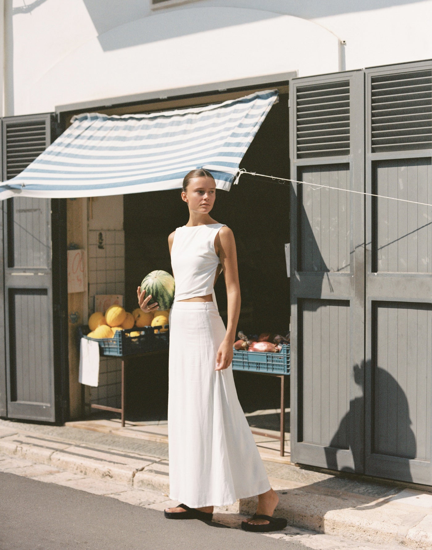 ALEAH MAXI SKIRT (WHITE) - CHARCOAL EXCLUSIVE Introducing our Aleah maxi skirt, designed for both style and comfort. Crafted from a linen blend, it's perfect for various occasions. A style that combines fashion and functionality seamlessly. The high-waisted design adds a touch of sophistication, making it a versatile addition to your wardrobe.