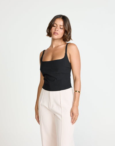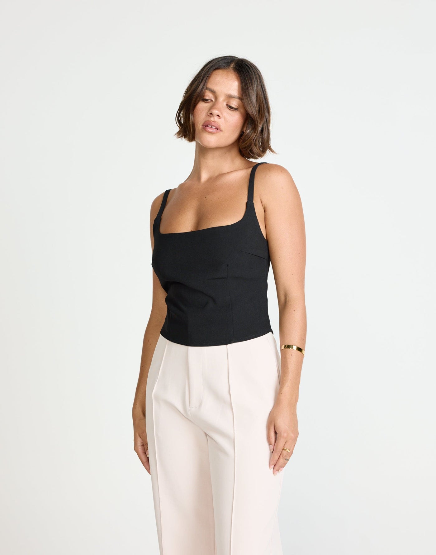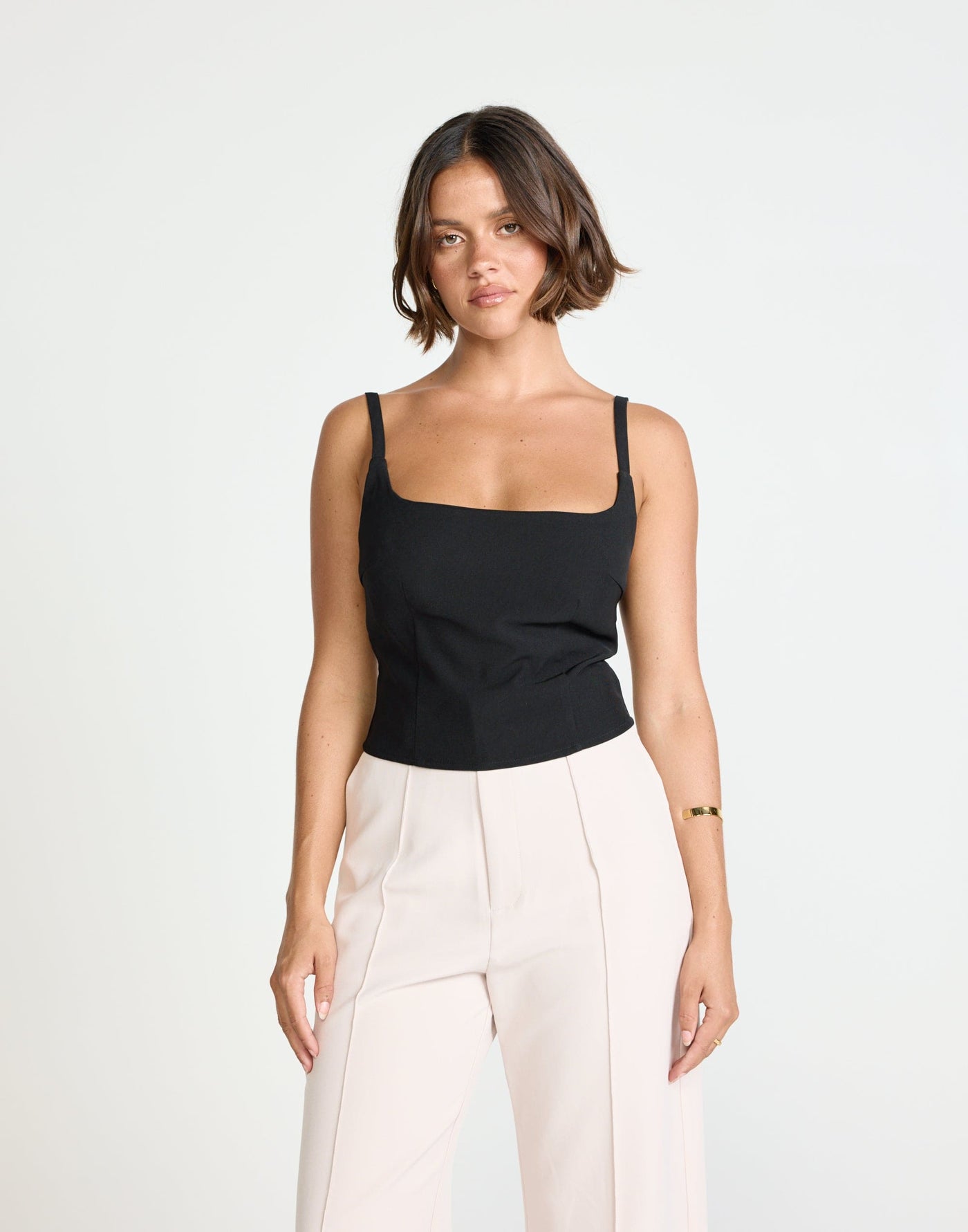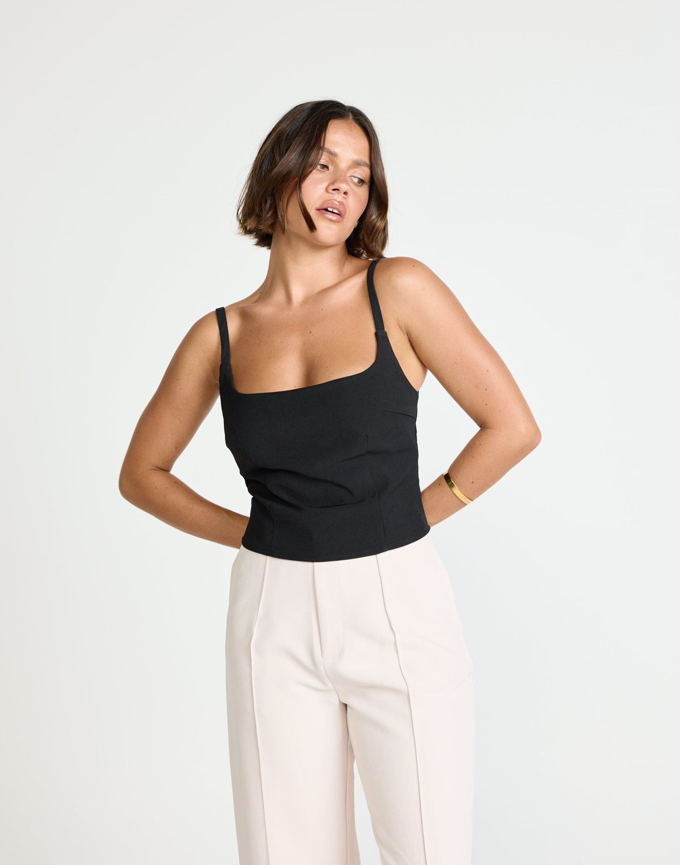 ALISTAIR TOP (BLACK) - CHARCOAL EXCLUSIVE Please note: if you are in-between sizes we recommend sizing up. Introducing the Alistair Top. This sleek design features dart detailing throughout, offering a refined, tailored fit. With a back zipper entry and contrast facing, the top exudes sophistication. The round neckline complements its suiting fabrication, while the lined bust ensures comfort. Its bodycon silhouette creates a polished and structured look.