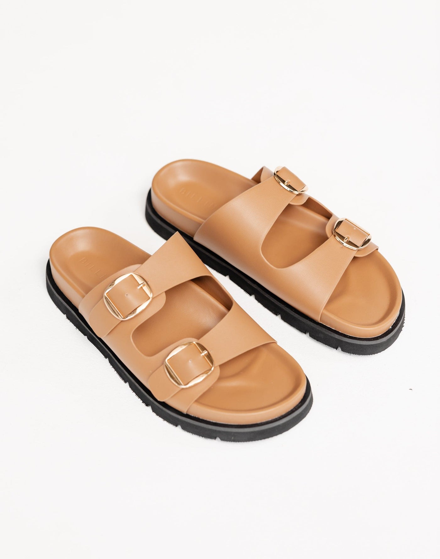 ARELI SLIDES (LIGHT CASHEW) - BY BILLINI Introducing the Areli Slides, designed with a flat footbed and chunky exposed sole for comfort and style. Featuring thick twin straps on the upper with faux buckle detailing in gold hardware, these slides offer a chic, laid-back look. Complete with an open round toe and heel counter, the Areli Slides are crafted with a synthetic upper, lining, and outsole for effortless wear.