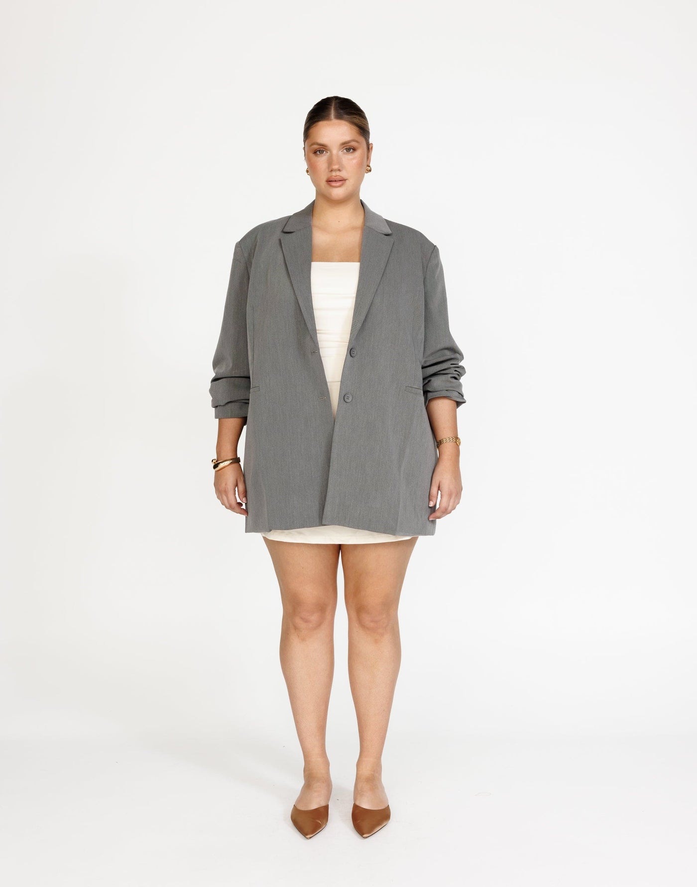 Ashwood Blazer - CHARCOAL Exclusive Introducing the Ashwood Blazer a best-seller for a reason. This blazer boasts an oversized fit for a trendy and relaxed look. Long sleeves, front pockets, and shoulder pads add a touch of sophistication and practicality. The button-up front enhances its tailored appeal, while the lining ensures comfort. Elevate your ensemble with the Ashwood Blazer, a versatile and stylish choice that seamlessly combines fashion and functionality.