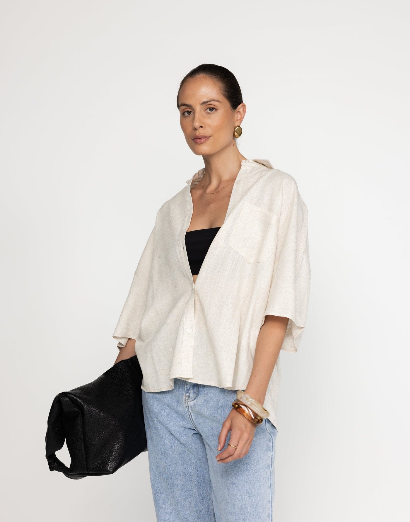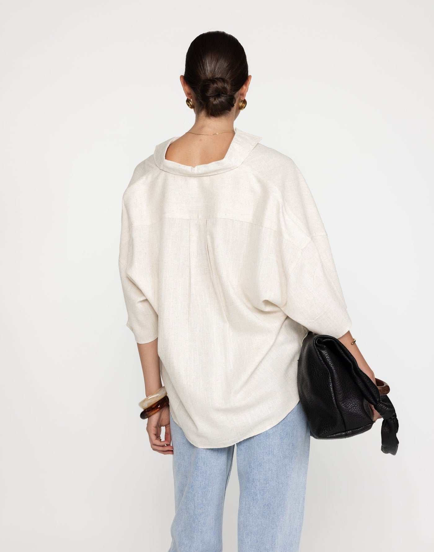 BEC SHIRT (OATMEAL) The Bec Shirt offers effortless style with its classic collared neckline, button closure, and practical pocket detailing. Designed in a relaxed fit, it's a versatile wardrobe essential that pairs seamlessly with any look.