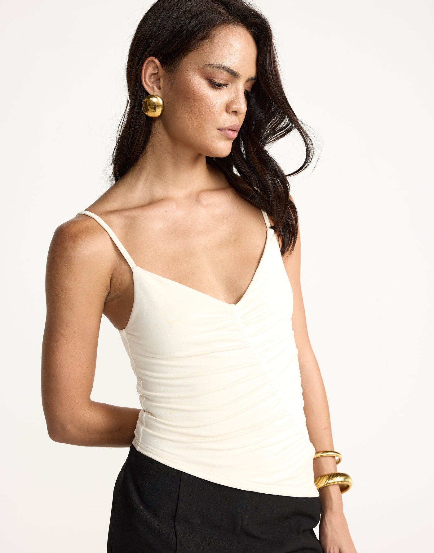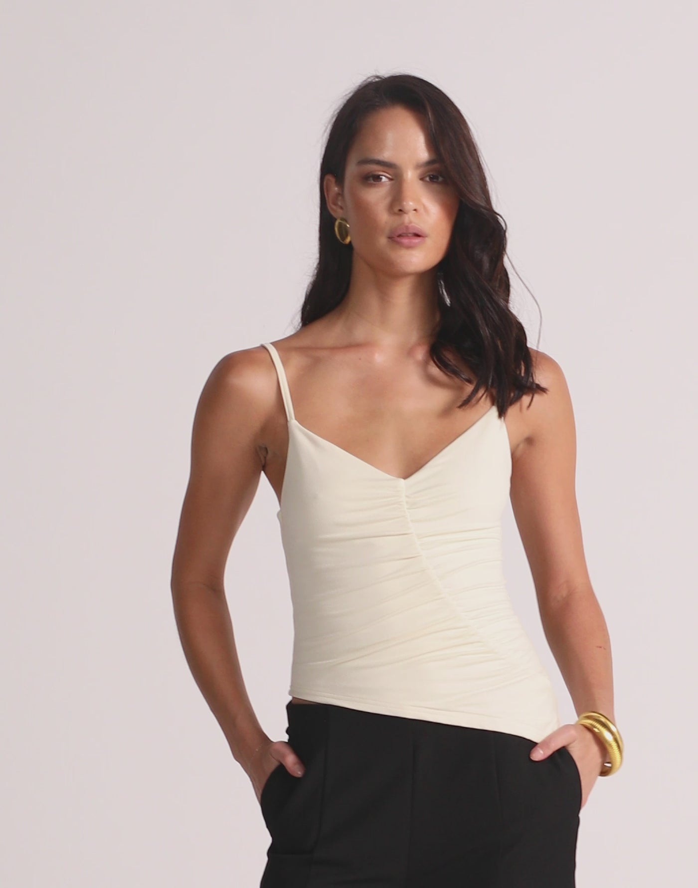 The Broken Hearts Top showcases effortless elegance with its butter jersey fabrication and bodycon silhouette. Featuring a flattering V-neckline, non-adjustable straps, and diagonal ruched detail, the design is completed with a stylish diagonal hem and full lining for a sleek, refined look.