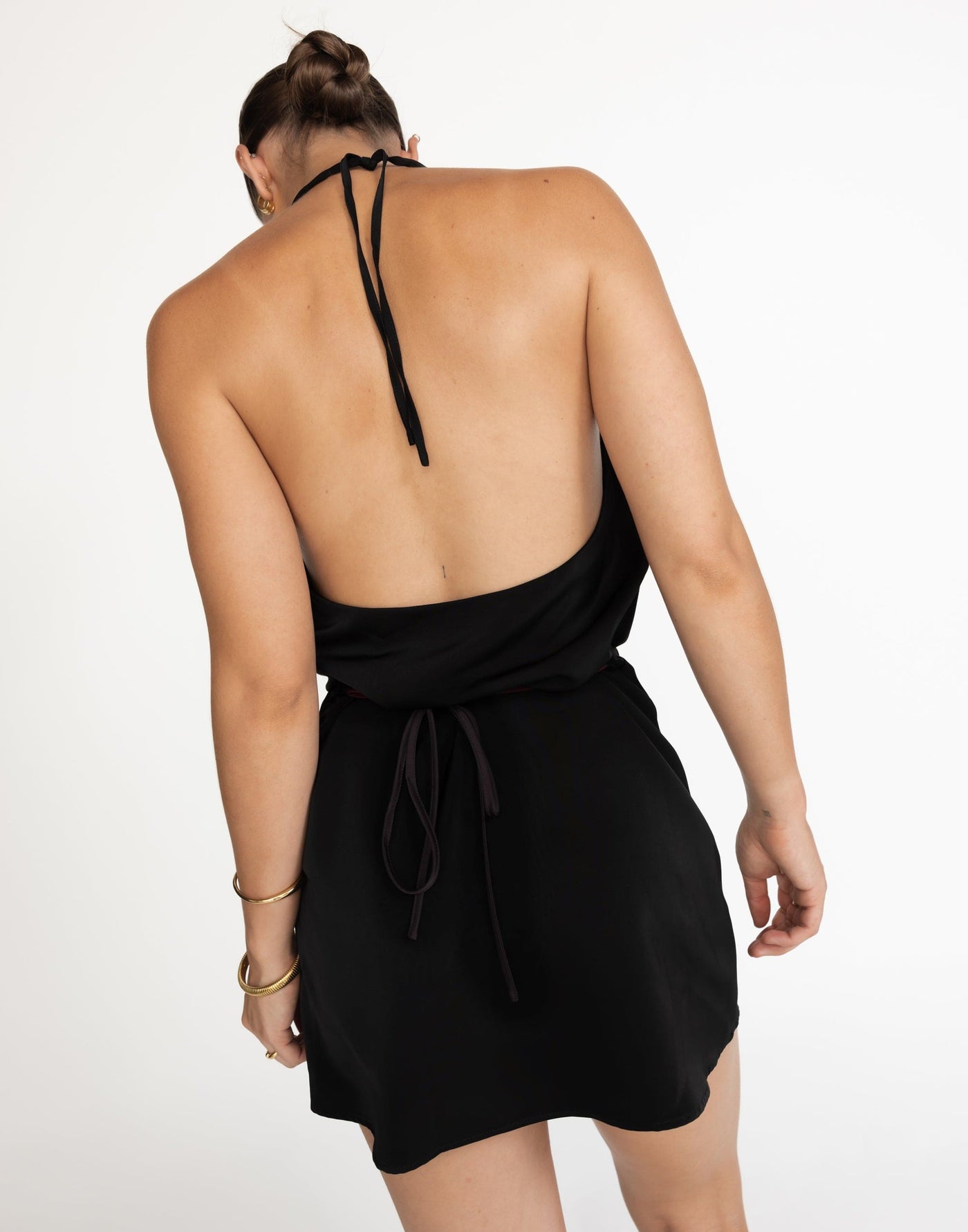 CABARET MINI DRESS (BLACK) - CHARCOAL EXCLUSIVE Introducing the Cabaret Mini Dress, a stunning black mini designed for a chic, flattering fit. Featuring a halter tie-up neck and plunging V-neckline, it creates a bold yet elegant silhouette. The crossover bust detail and low open back add a touch of drama, while the flared skirt brings movement and flow. With an adjustable waist tie and a pull-over style, this dress offers a loose, customizable fit. Fully lined and crafted from delicate fibres, the Cabaret Mini Dress is perfect for making a statement at any occasion.