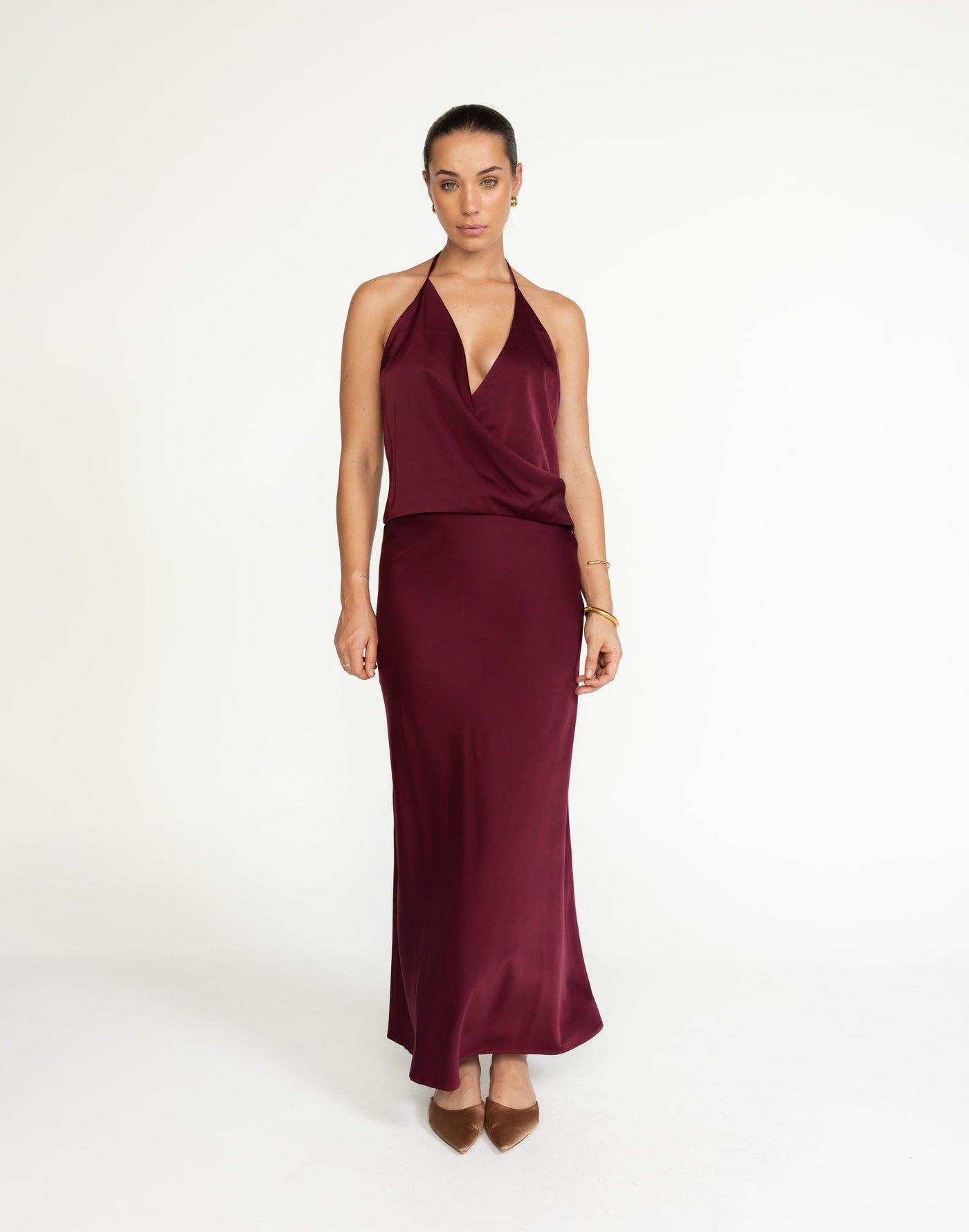 CABARET TOP (PLUM) - CHARCOAL EXCLUSIVE Introducing the Cabaret Top, a sleek plum top designed to turn heads. With a halter tie-up neck and plunging V-neckline, it creates a striking silhouette. The crossover bust detail and low open back add a touch of allure, while the side zipper entry ensures a secure fit. Loose fitting for comfort, this top is fully lined and made from delicate fibres for a soft, luxurious feel. Ideal for both dressy and casual occasions, the Cabaret Top effortlessly combines style and sophistication.