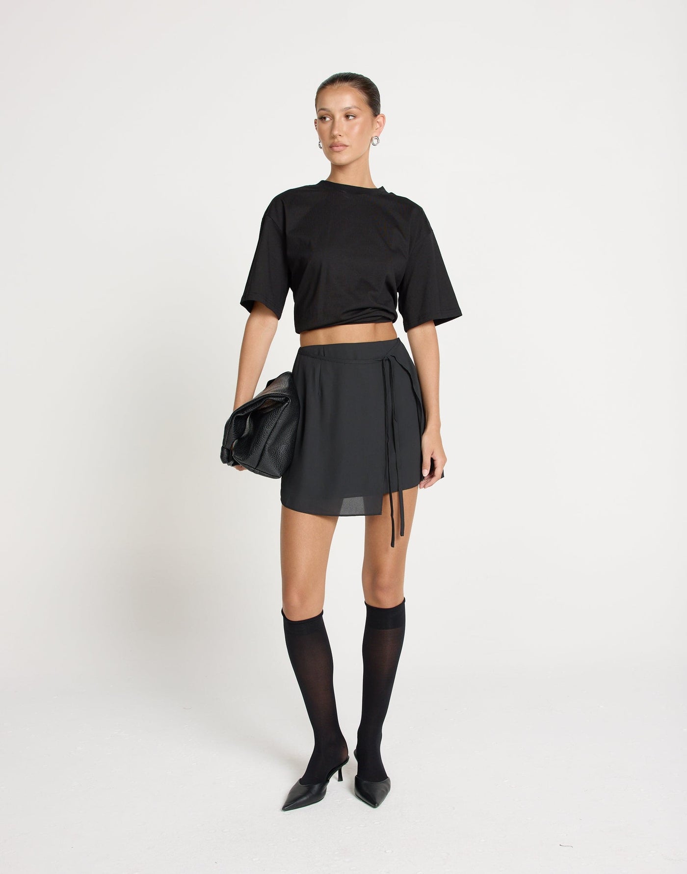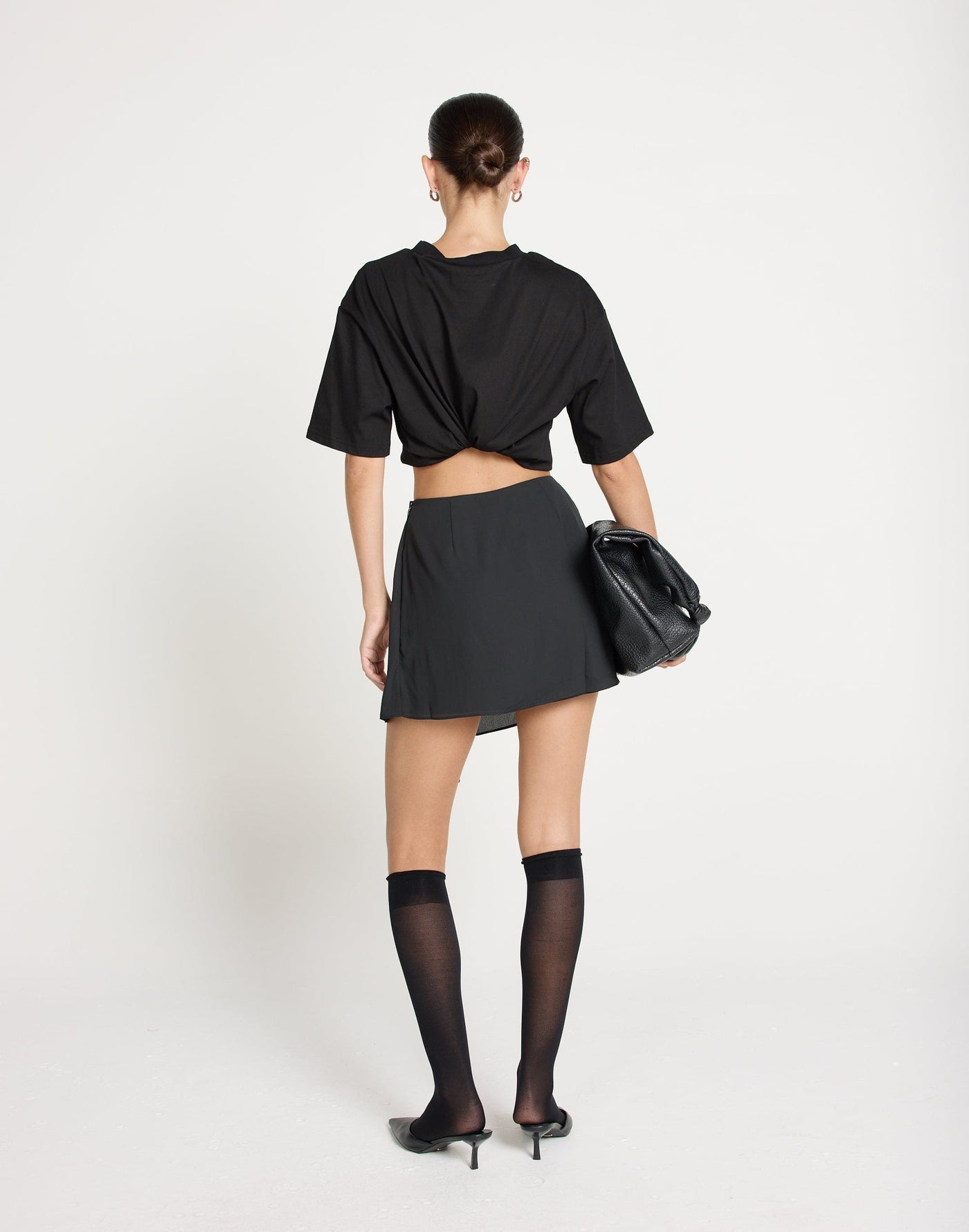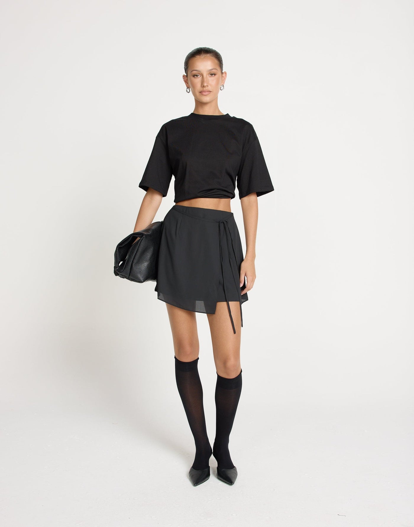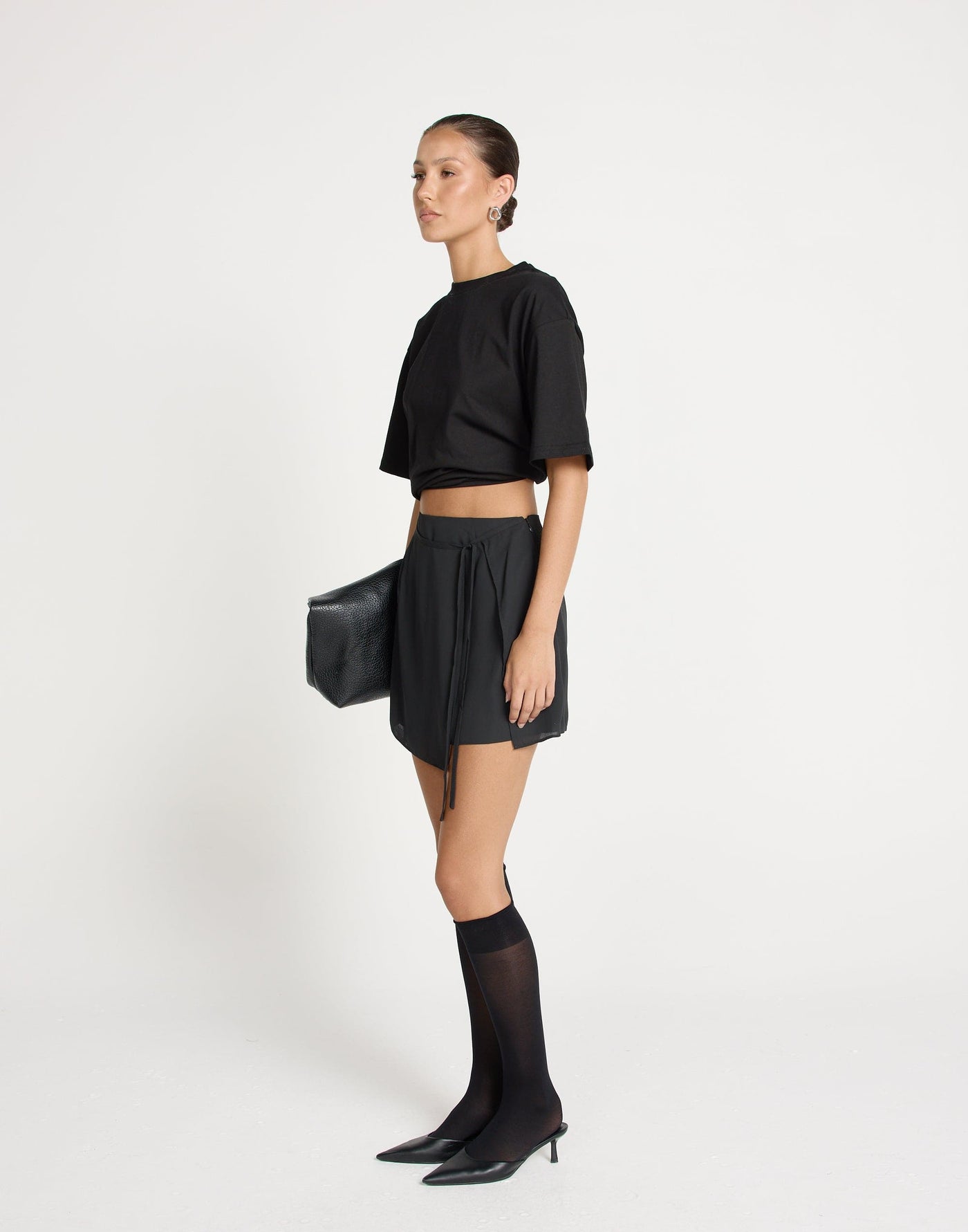 CYNTHIA MINI SKIRT (BLACK) - CHARCOAL EXCLUSIVE The Cynthia Mini Skirt in black is a chic, versatile piece that effortlessly elevates your wardrobe. Made from flowy chiffon fabrication, it features a flattering high-waisted fit and a playful tie-up detail for added charm. The side zipper ensures a smooth, fitted look, making it perfect for both casual outings and dressier occasions. Pair it with anything from a tucked-in blouse to a crop top for a bold, stylish statement.