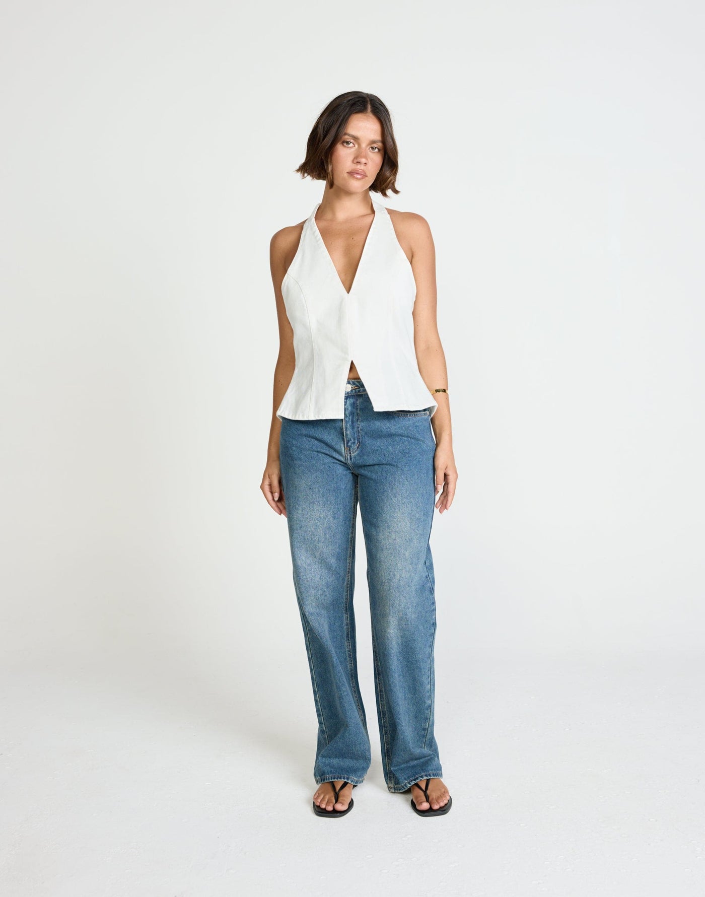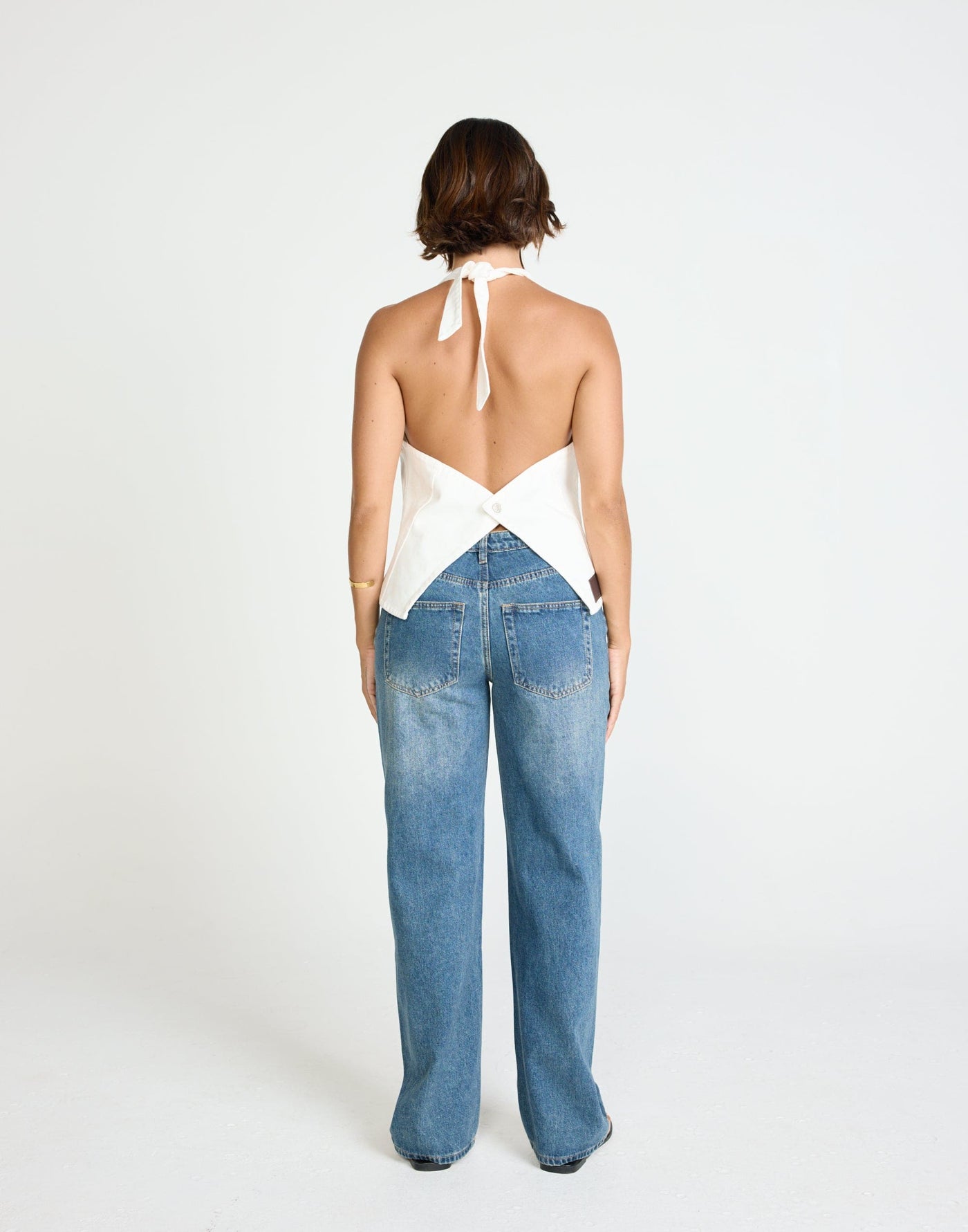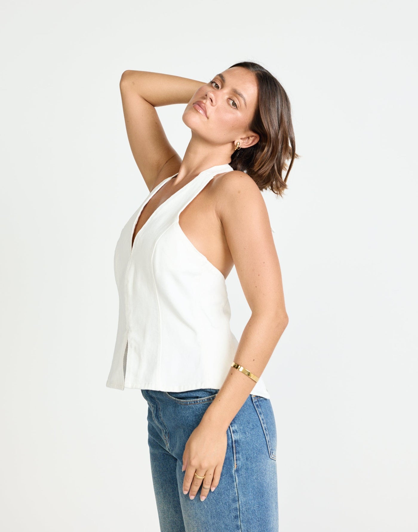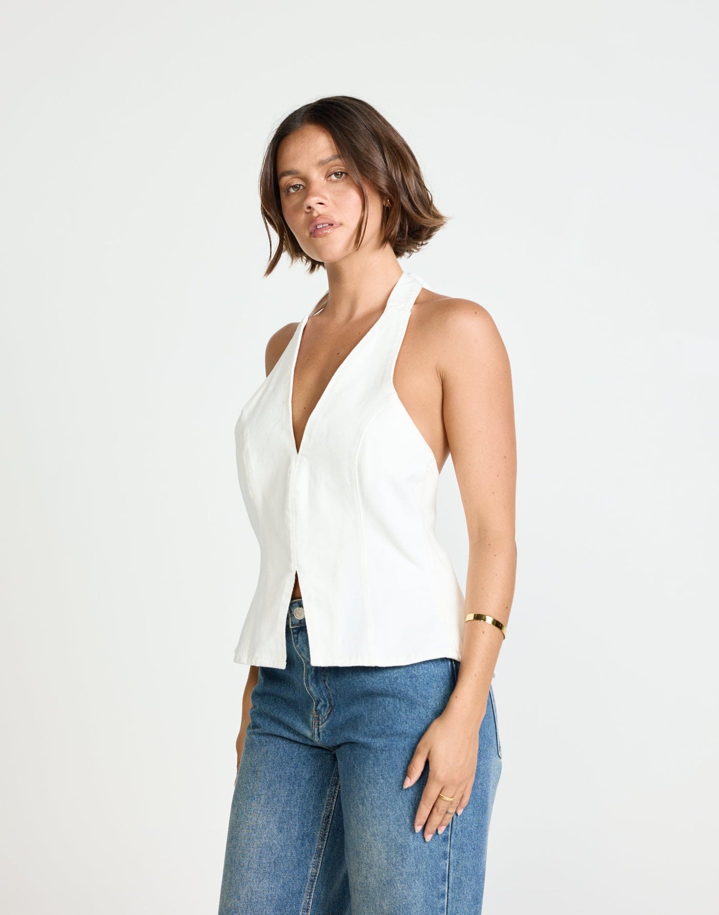 ELHAM DENIM TOP (IVORY WHITE) - CHARCOAL EXCLUSIVE The Elham Halter Top showcases a V-neck tie-up neckline and a button closure on the open back. The design features an open front slit and a relaxed fit, offering a chic and breezy style.