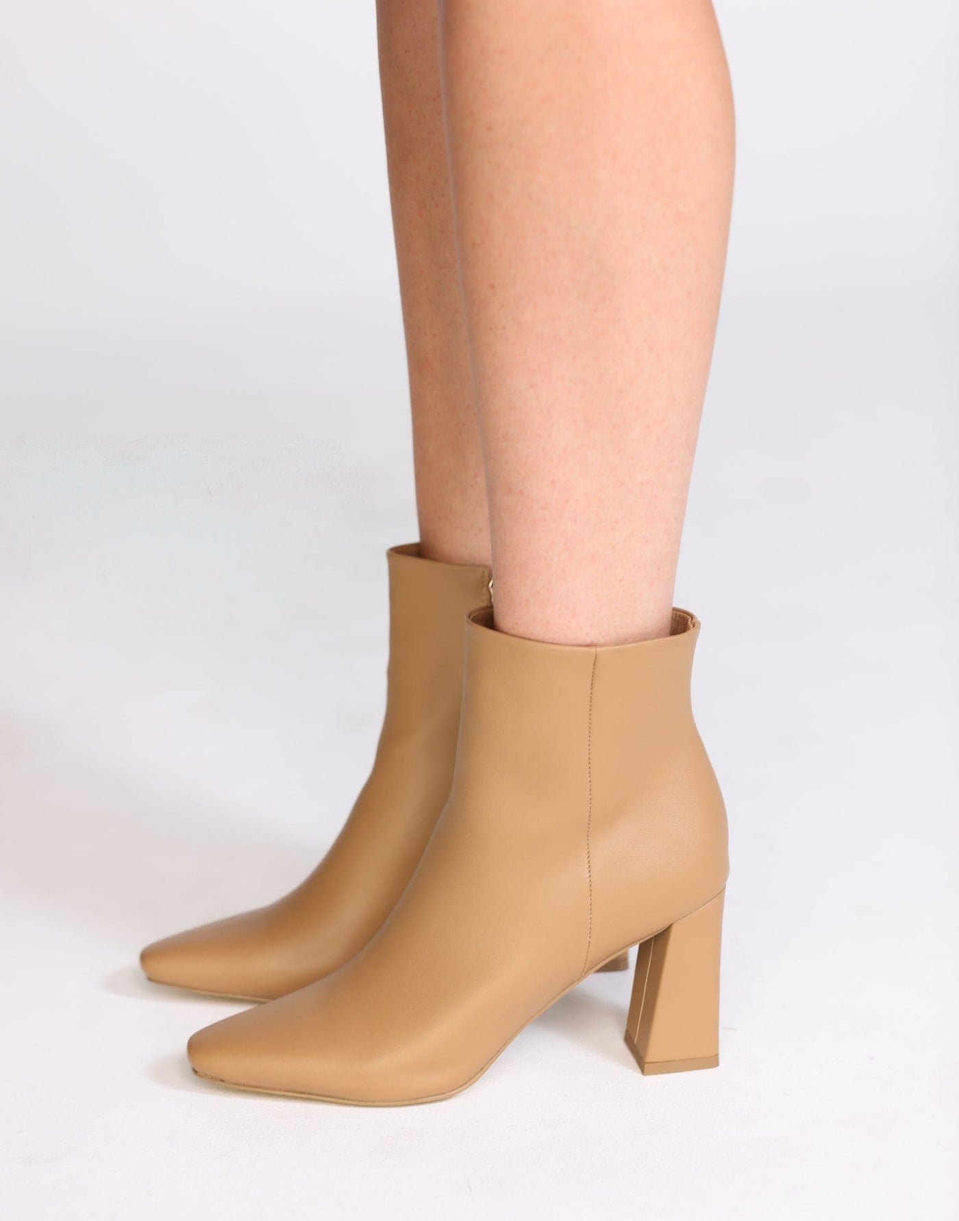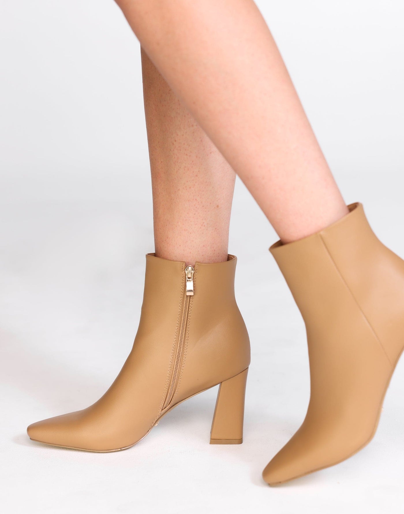 INDEERA BOOTS (OAK) - BY BILLINI Introducing the Indeera Boots by Billini: designed with a mid, flared block heel and a closed square toe for a modern look. The structured upper provides support, while the inner zip fastening ensures easy wear. Finished with a closed heel counter, these boots blend style and functionality seamlessly.