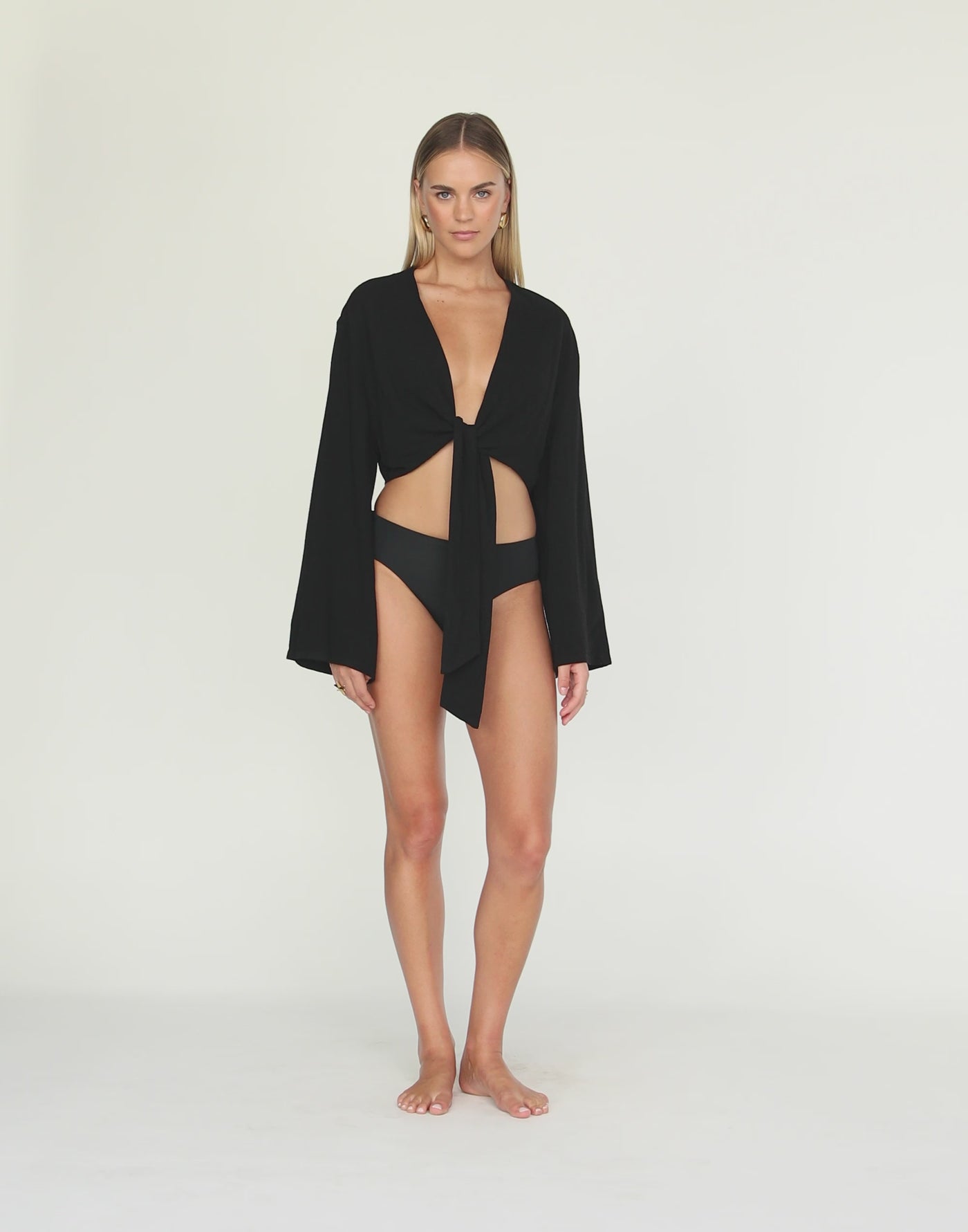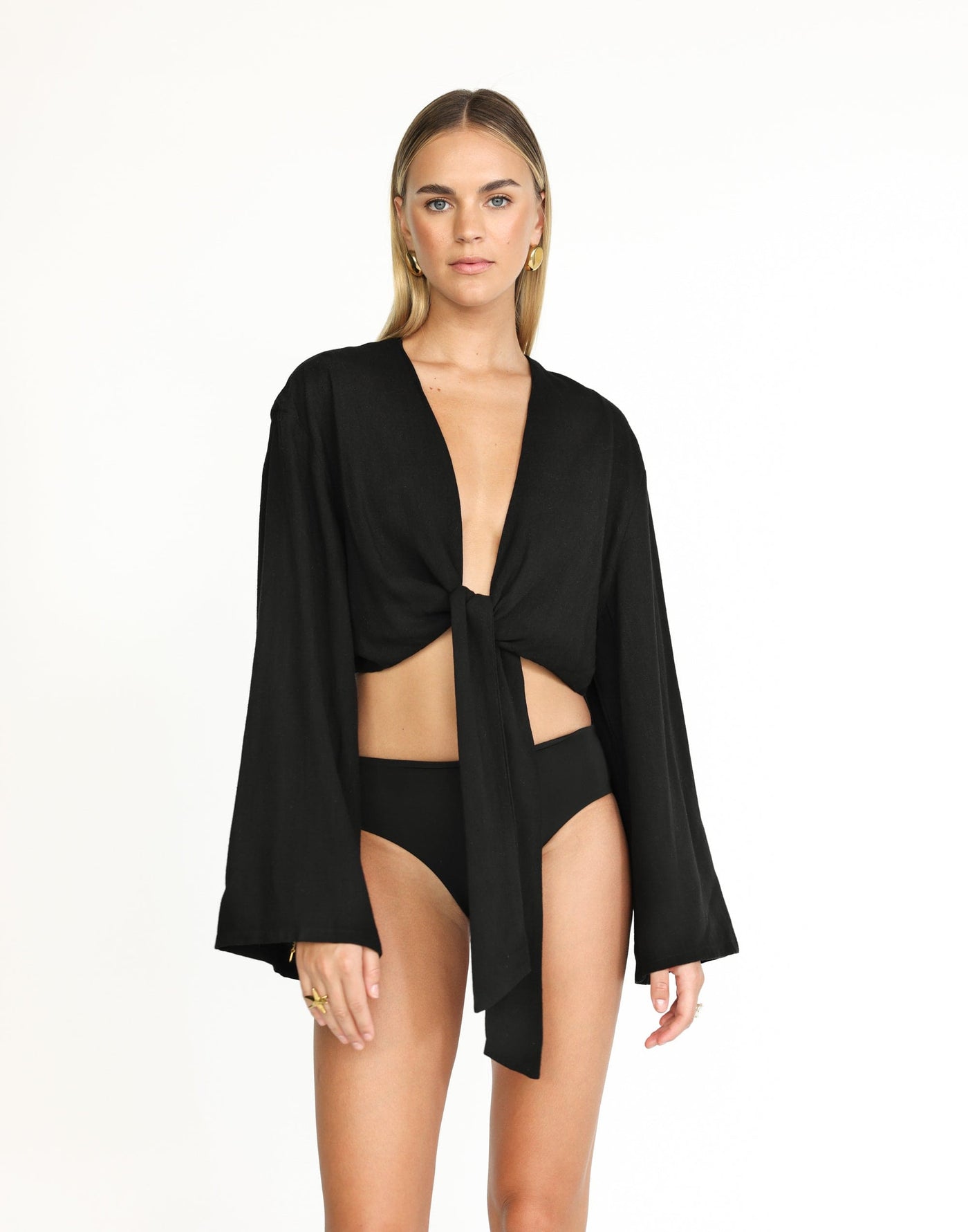 JAMILA SHIRT (BLACK) - CHARCOAL EXCLUSIVE Introducing the Jamila Shirt. Featuring long flared sleeves and a tie-up front, this shirt offers a relaxed fit and a flattering V-neckline, perfect for an effortlessly chic look.