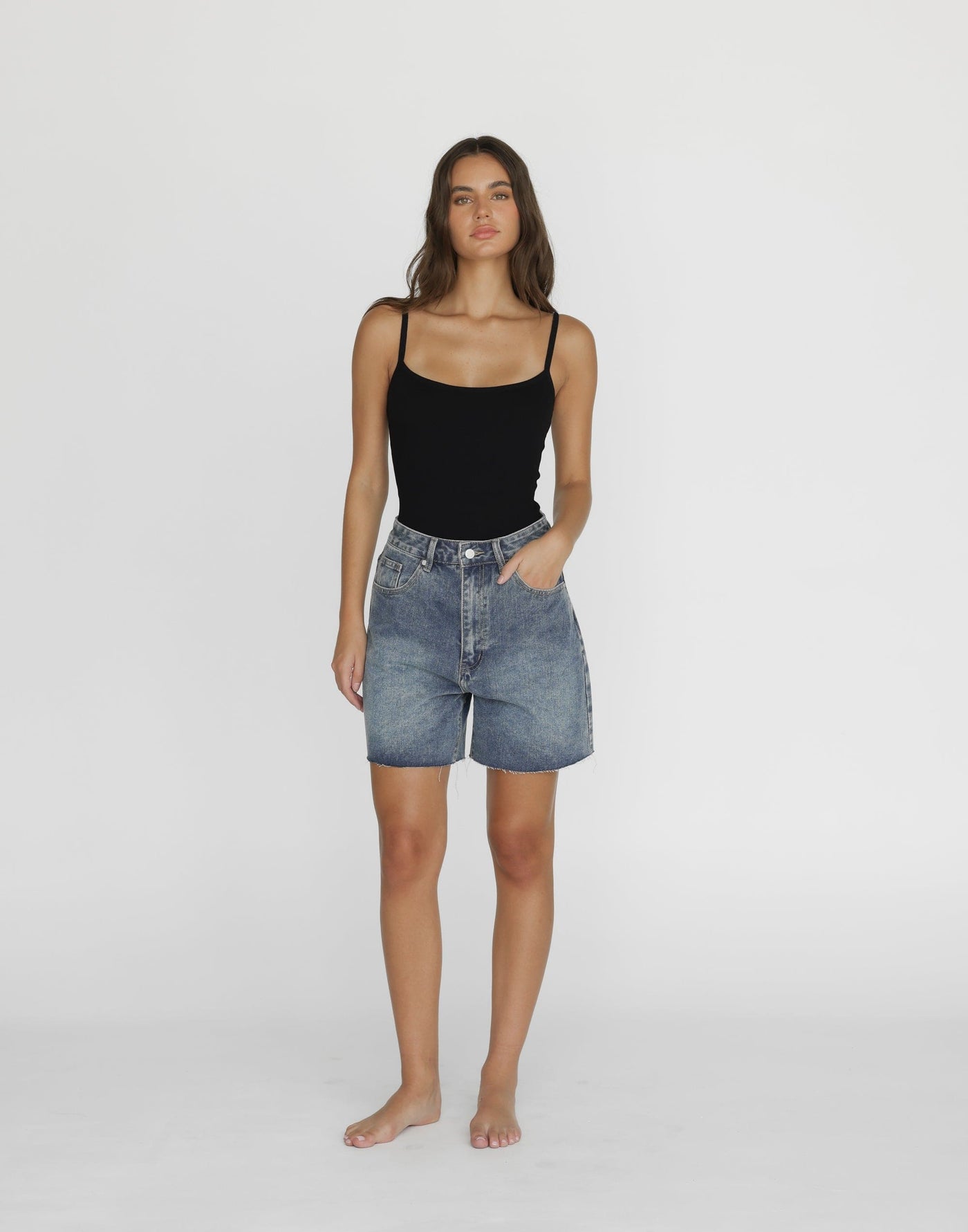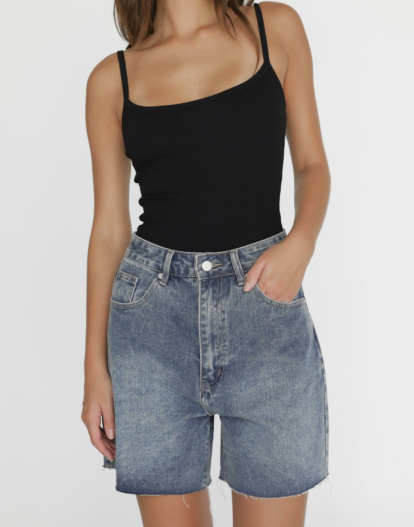 Jordan Denim Shorts (Faded) - Charcoal Exclusive Meet your go-to staple for your capsule wardrobe - the Jordan Denim Shorts. With a silver button closure and frayed hemline, they exude a trendy and casual vibe. Their mid-rise fit and belt loops make them versatile and perfect for mixing and matching with various outfits. Elevate your capsule wardrobe with these classic shorts that effortlessly blend fashion and comfort.