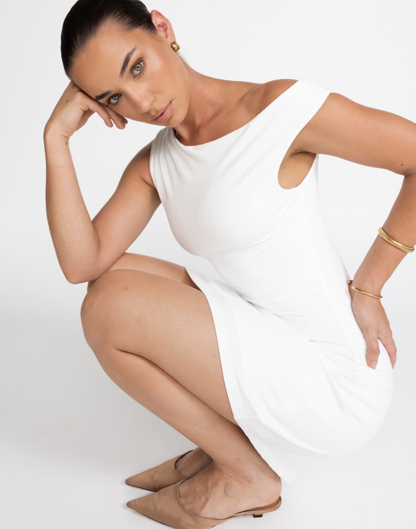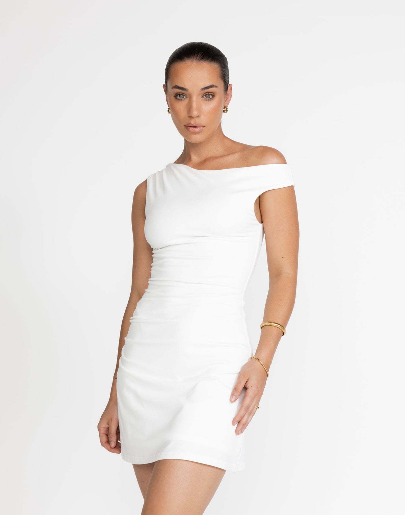 LULU MINI DRESS (WHITE) - CHARCOAL EXCLUSIVE Introducing the Lulu Mini Dress, a bold and flattering piece that makes a statement. This off-the-shoulder bodycon design highlights your figure, while the gathering on the sides adds a touch of detail and sophistication. The flared skirt provides a playful, feminine flair, creating a perfect balance of style and comfort. With a pull-over fit and lined for added ease, the Lulu Mini Dress is the ideal choice for a night out or any event where you want to stand out with confidence and grace.