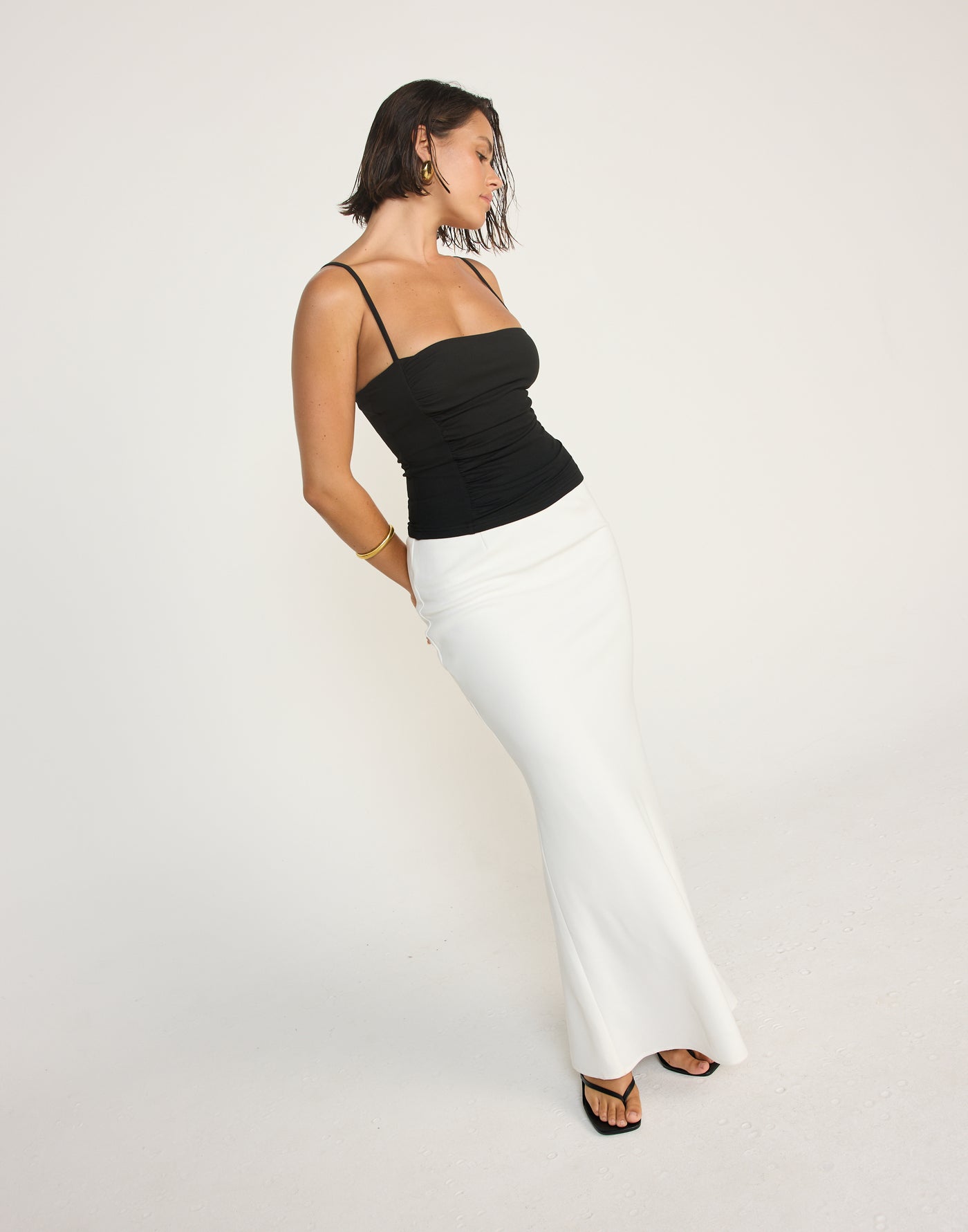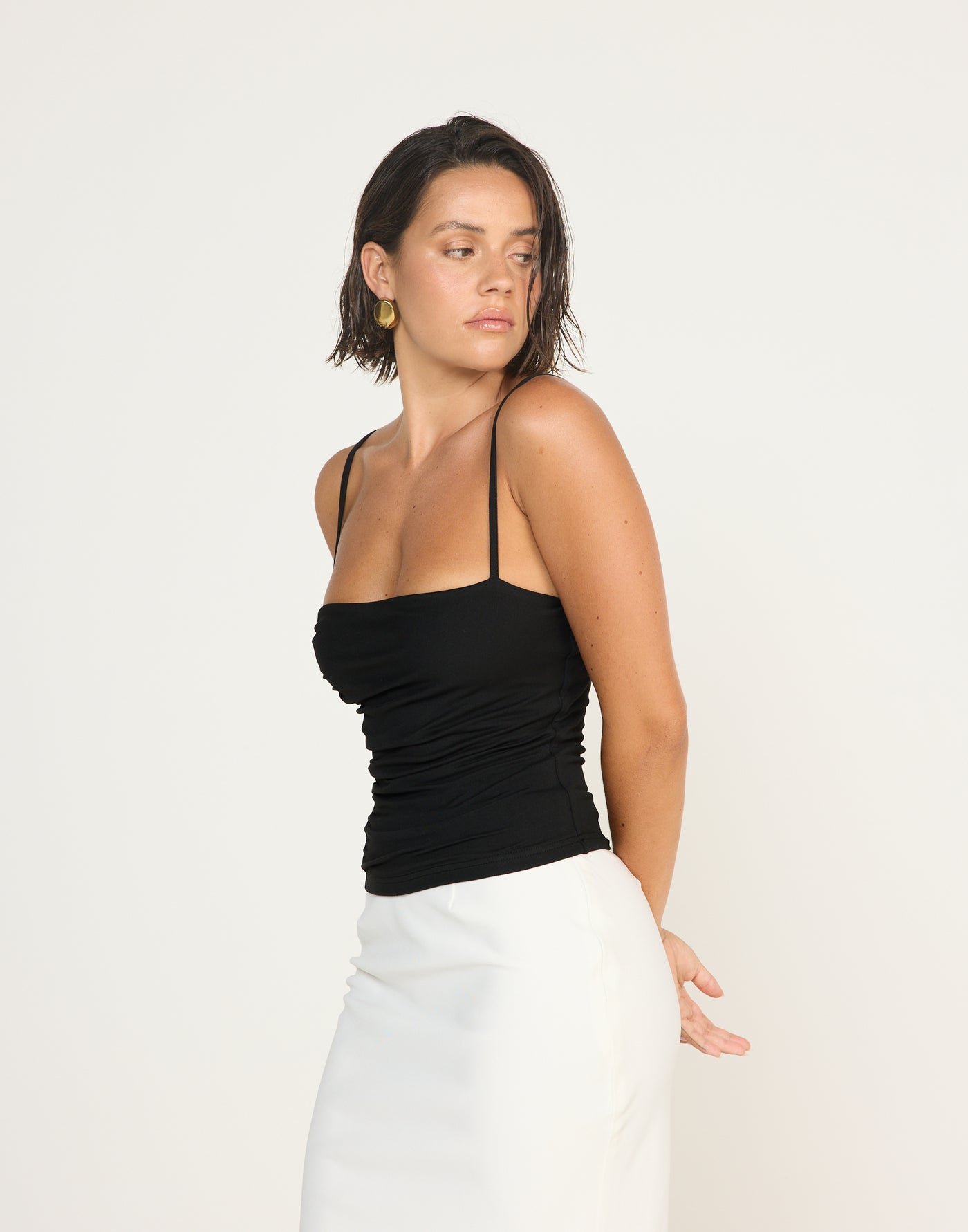MIRA TOP (BLACK) - CHARCOAL EXCLUSIVE The Mira Top is your new favourite for sleek, effortless style. Crafted from a soft butter jersey fabrication, it feels as good as it looks, offering a bodycon fit that hugs your curves in all the right ways. The straight neckline and ruched detailing add a touch of modern elegance, while the non-adjustable straps keep the look clean and streamlined. Slightly cropped, this top is perfect for pairing with high-waisted pants or skirts for a chic, balanced silhouette. Versatile and flattering, the Mira Top brings confidence to your everyday wardrobe.