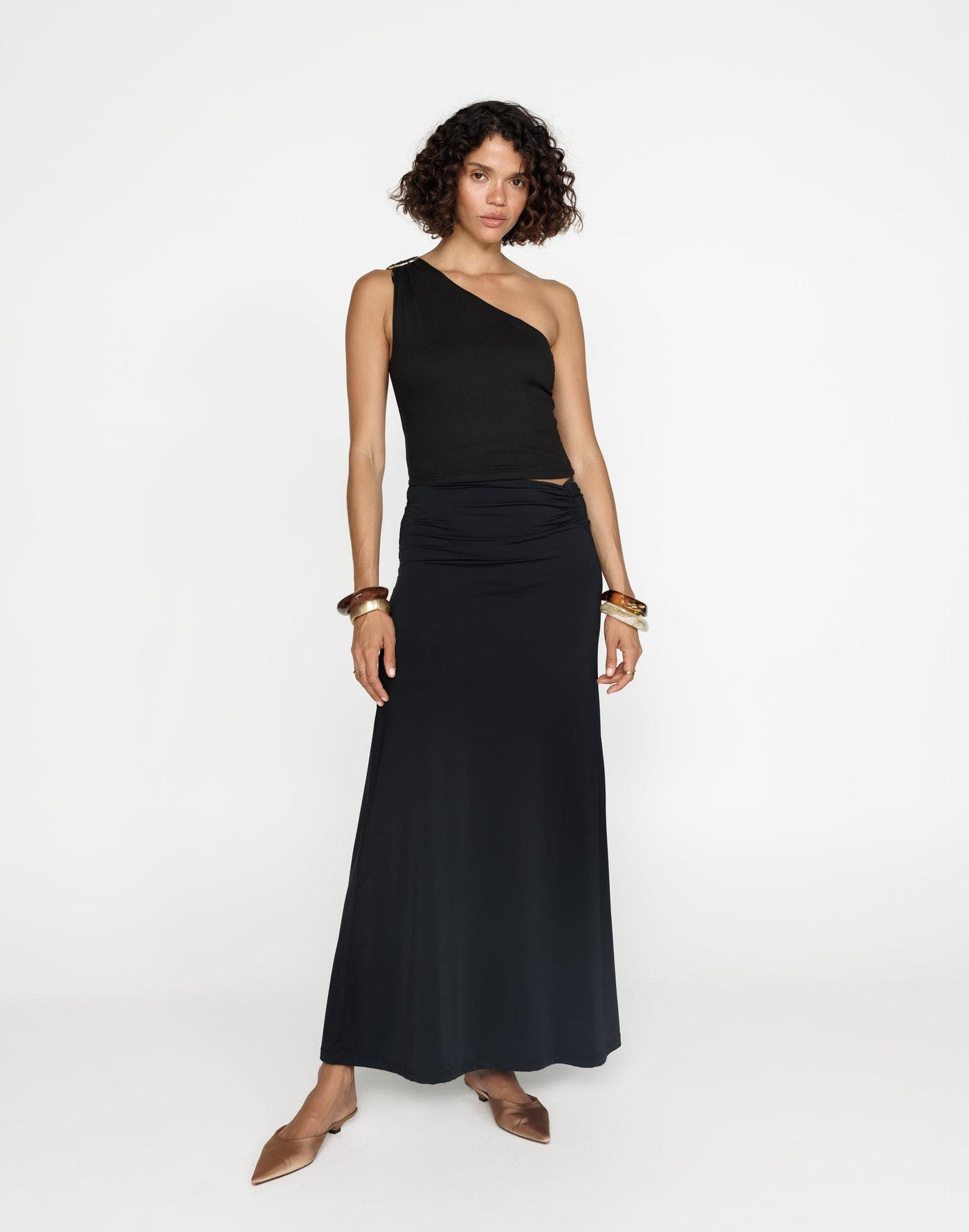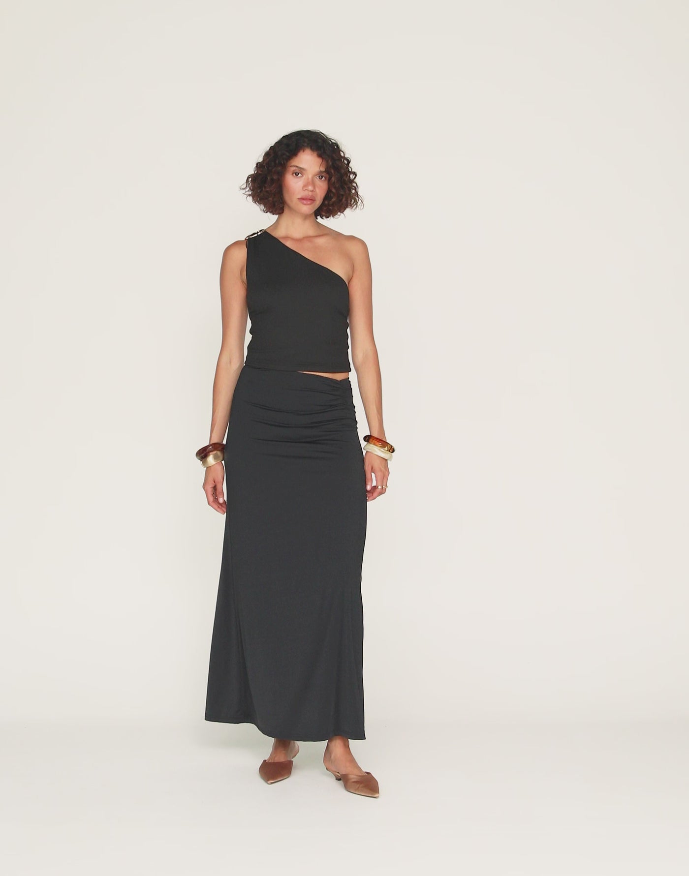 NIKOLETTE TOP (BLACK) - CHARCOAL EXCLUSIVE The Nikolette Top exudes understated elegance with its asymmetrical neckline and a touch of gold embellishment on the shoulder. Crafted from soft butter jersey, this slightly cropped bodycon top offers a sleek and flattering fit. Lined for added comfort, its a standout piece that effortlessly elevates any ensemble.