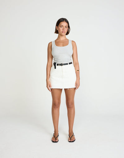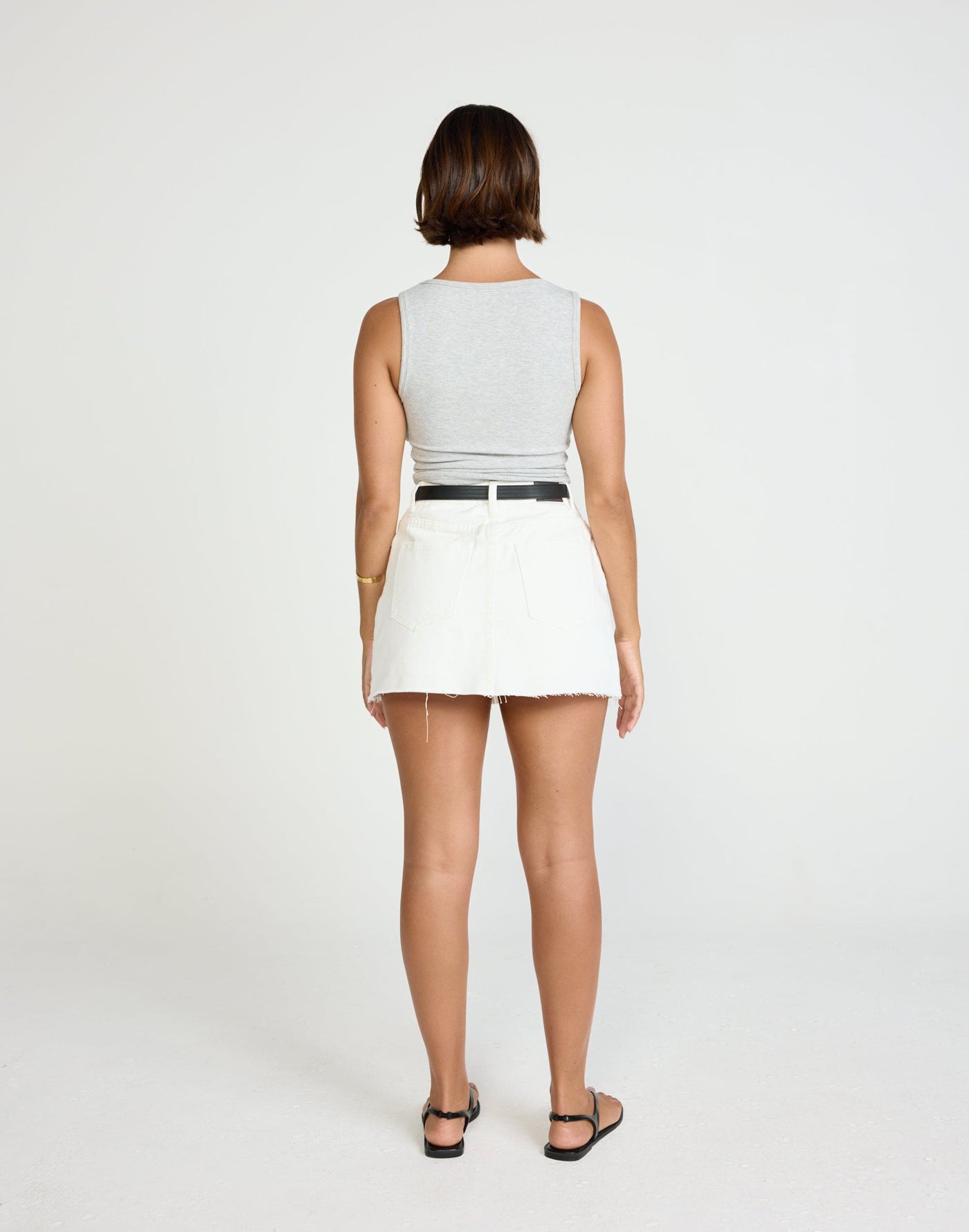 OKARA DENIM SKORT (IVORY WHITE) - CHARCOAL EXCLUSIVE The Okara Denim Skort combines style and practicality with a high-waisted design. It features a flared skirt with frayed edges over denim shorts, offering a playful and comfortable look. The zipper and button entry ensures a secure fit.