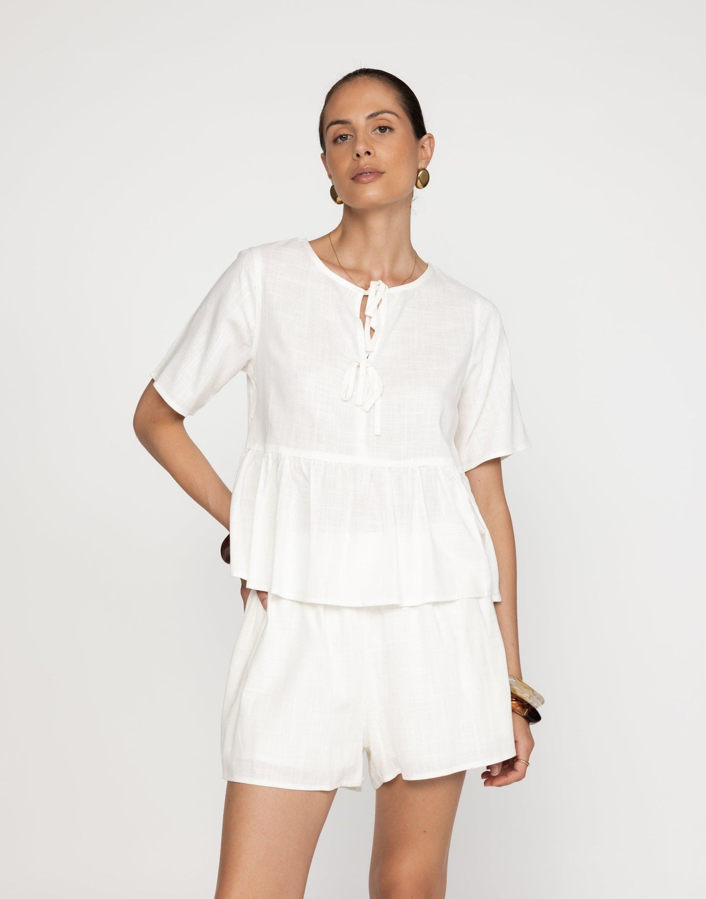 RACHEL SHORTS (WHITE) The Rachel Shorts feature a tie-up waistband, relaxed flowy fit, and breathable linen blend fabric, lined for added comfort.