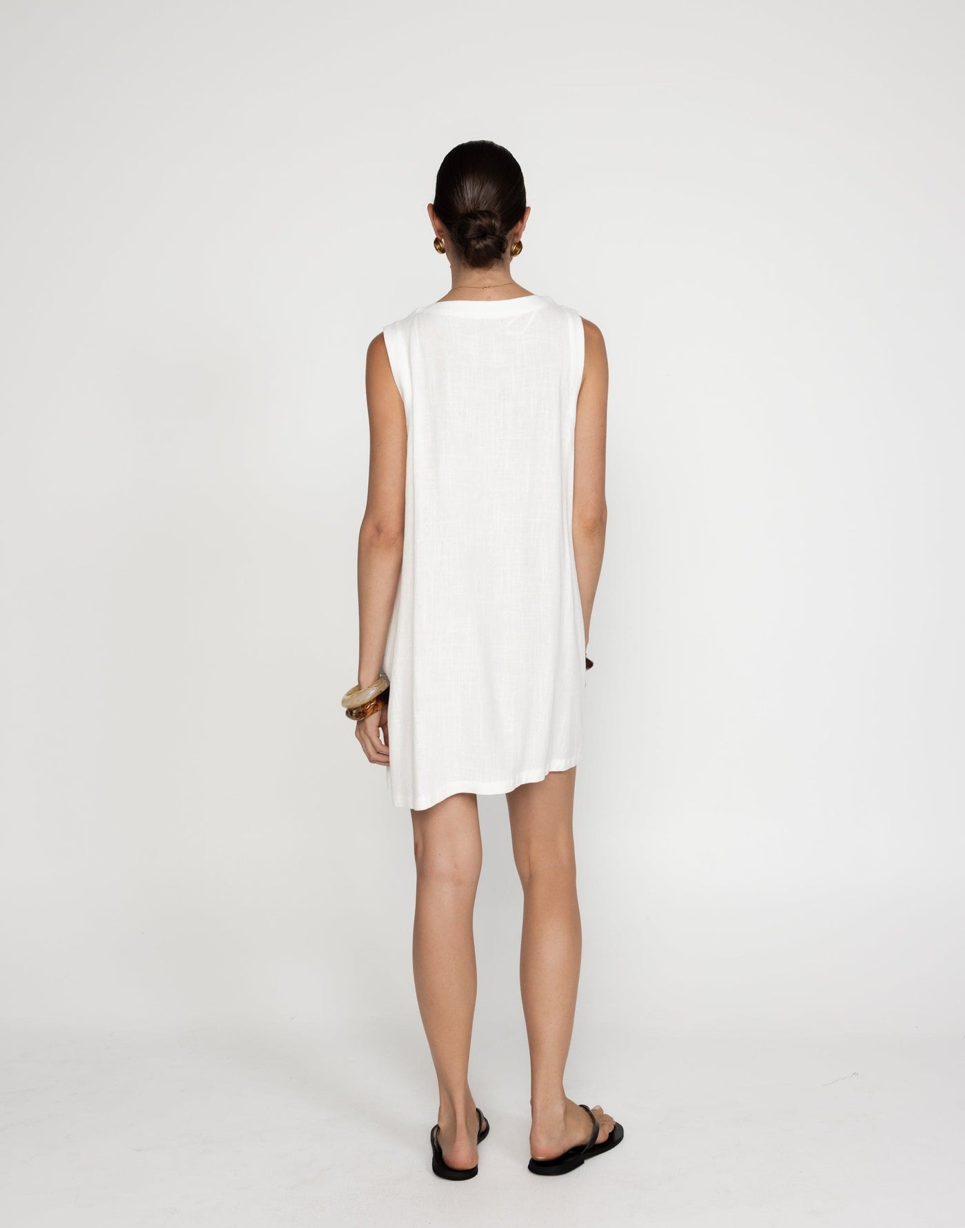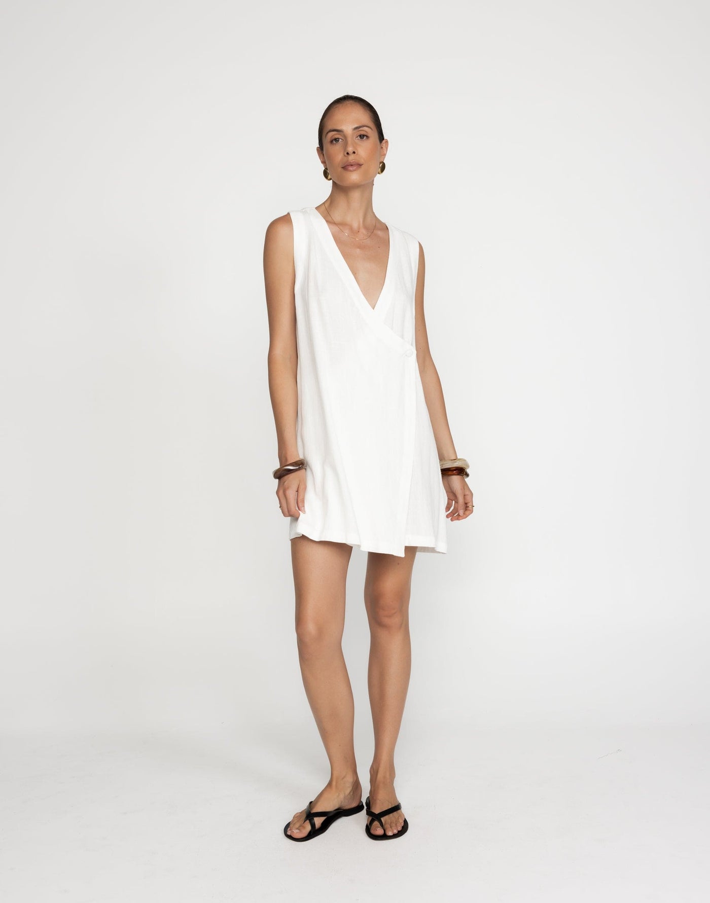 RHIANNA MINI DRESS (WHITE) The Rhianna Mini Dress combines a flattering V-neckline with a wrapped look and button detailing. Crafted from breathable linen blend fabric, it offers a chic, breezy style.