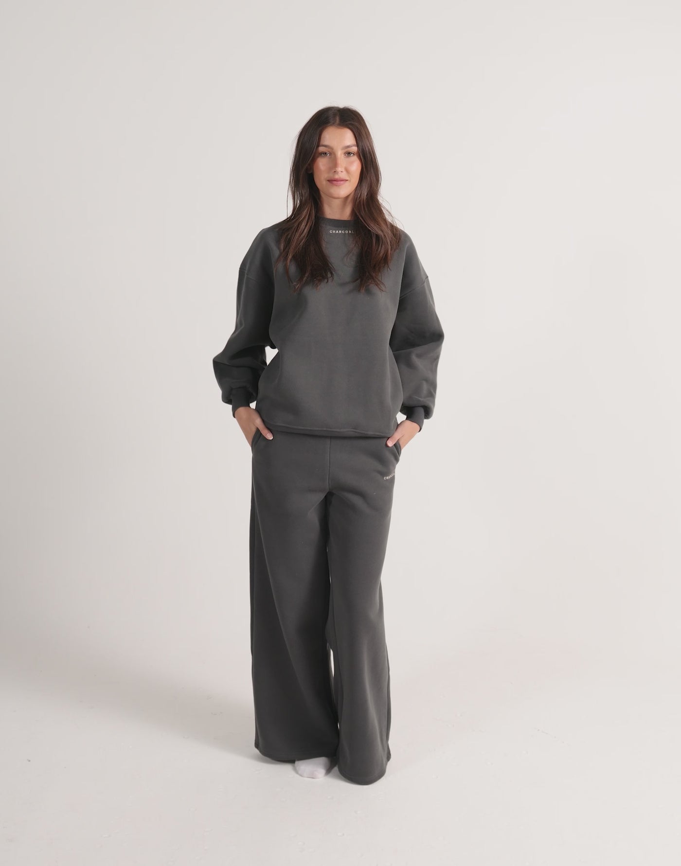The River Wide Leg Tracksuit Pants are a fusion of comfort and style. Featuring "CHARCOAL" embroidery on the left pant leg, these pants exude urban sophistication, while the fleece lining ensures warmth and coziness.