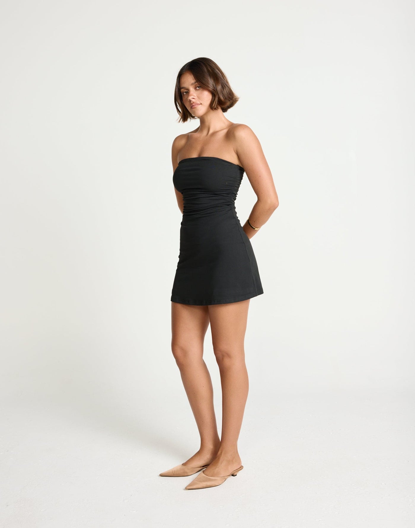 Sarie Mini Dress (Black) | CHARCOAL Exclusive - Strapless Bodycon Jersey Flared Hem Gathered Detail Mini Dress - Women&