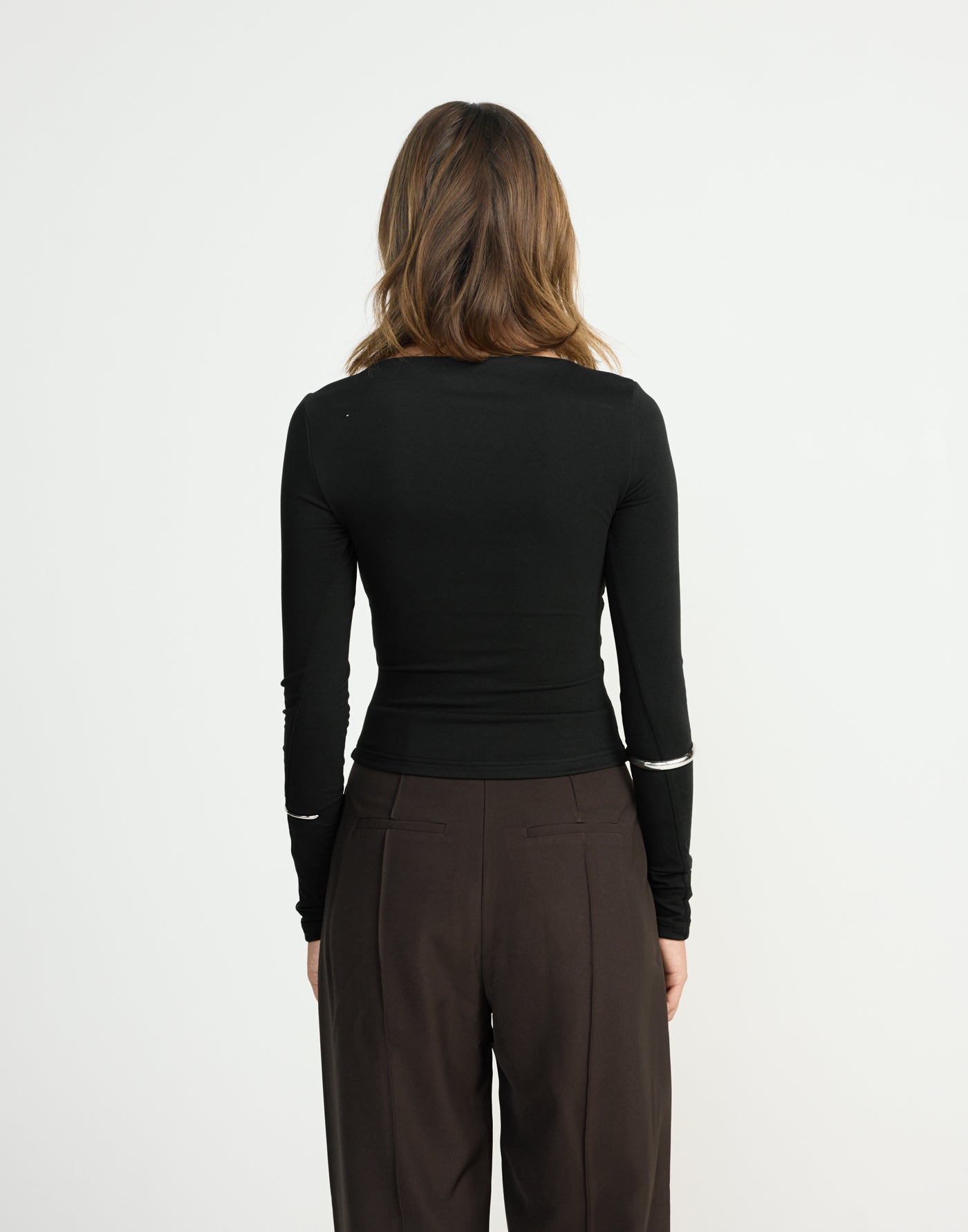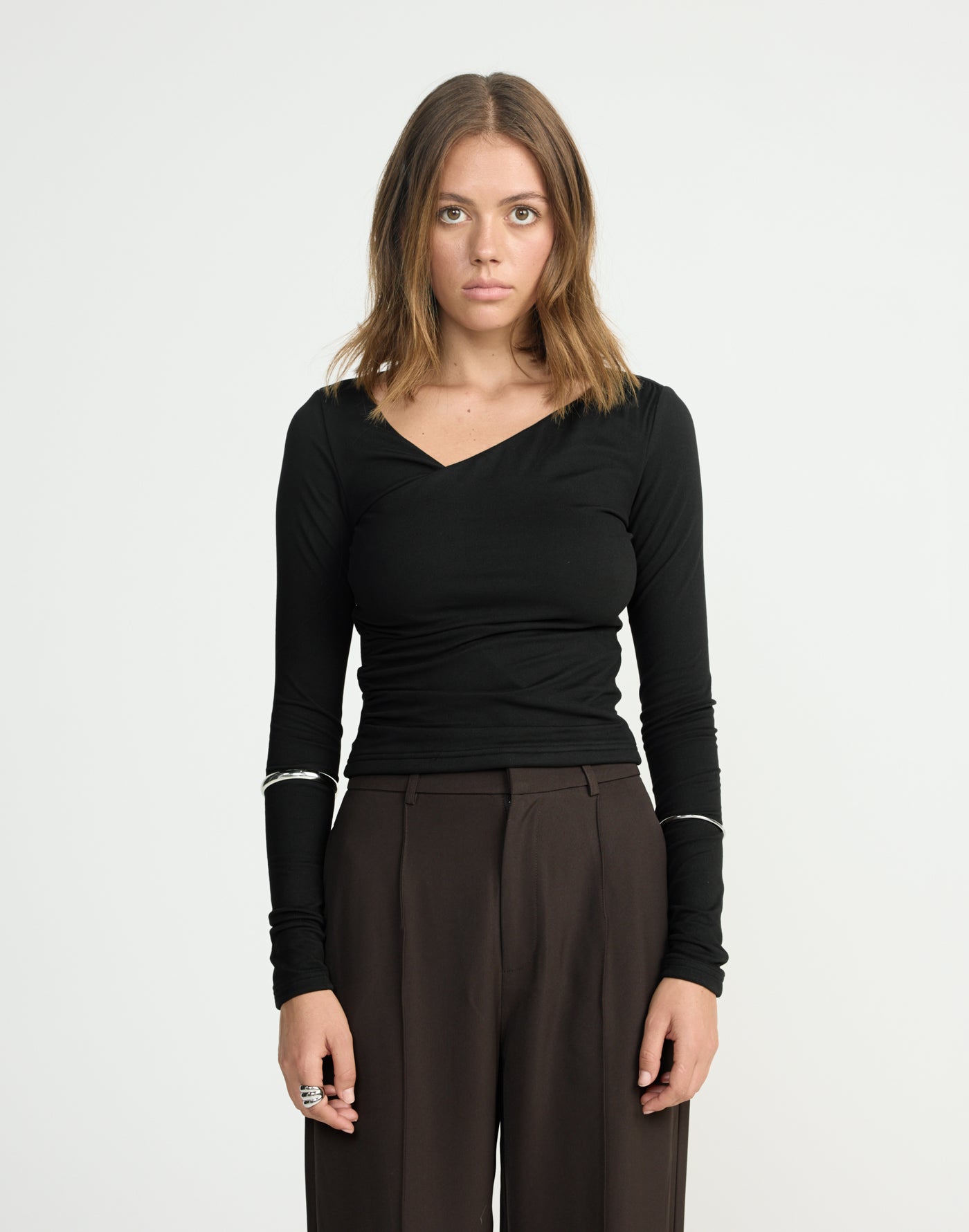 TWYLA LONG SLEEVE TOP (BLACK) - CHARCOAL EXCLUSIVE The Twyla Long Sleeve Top offers a chic, contemporary look with its asymmetrical V-neckline and wrap style. Crafted from soft buttery jersey fabric, it drapes beautifully and provides a comfortable, flattering fit. The longline design adds a touch of elegance, making it a versatile piece for both casual and dressed-up occasions.